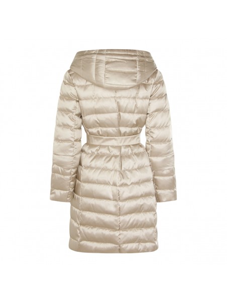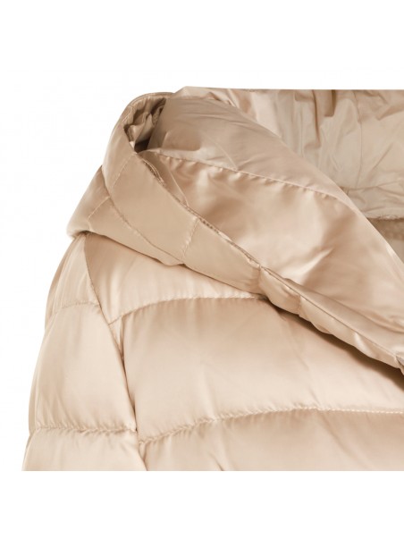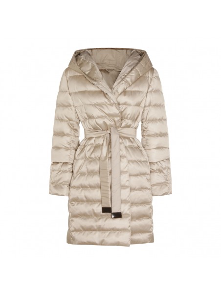 Light beige Novef down jacket from Max Mara The Cube featuring hood, long sleeves, padded, belt waist closure, quilted and regular vestibility.