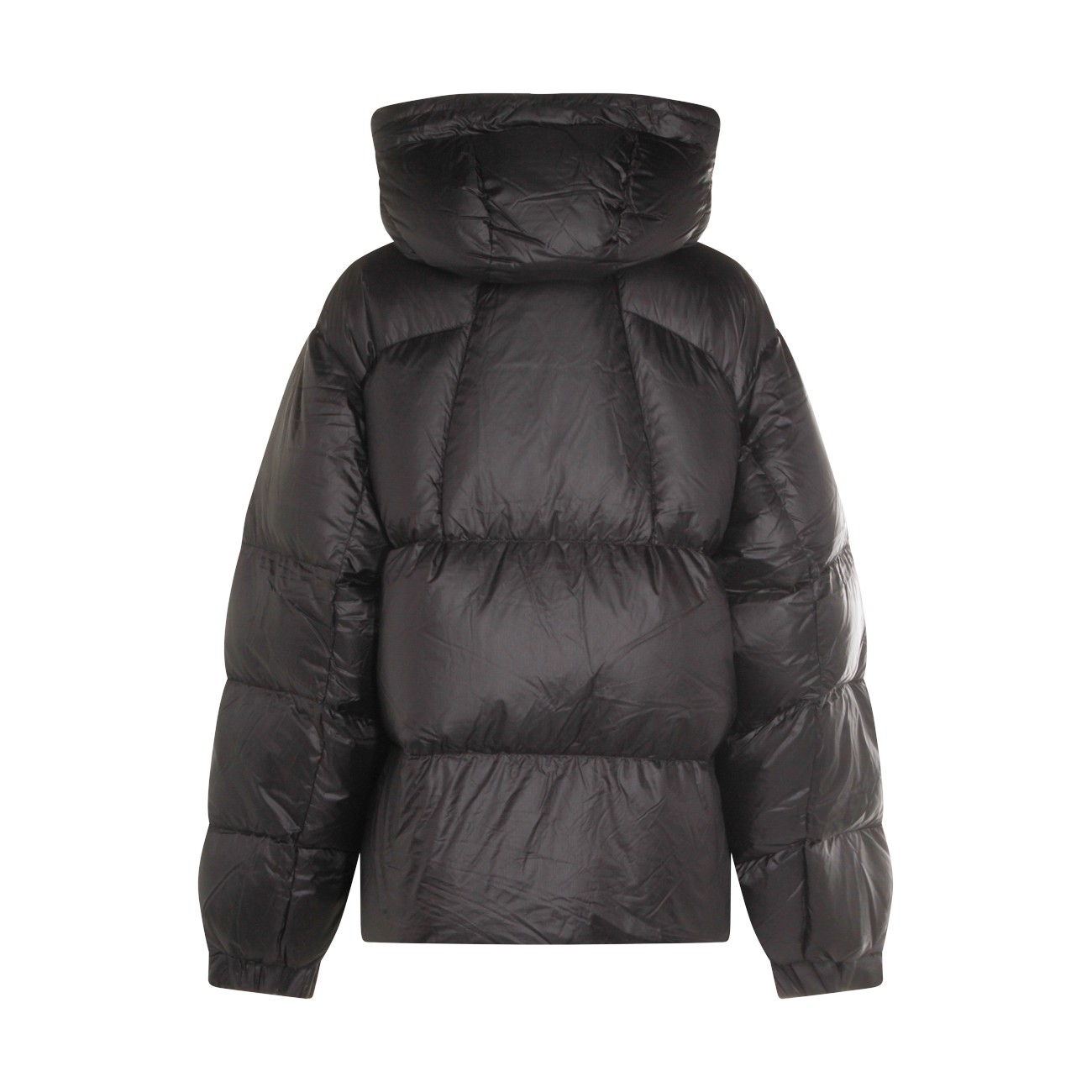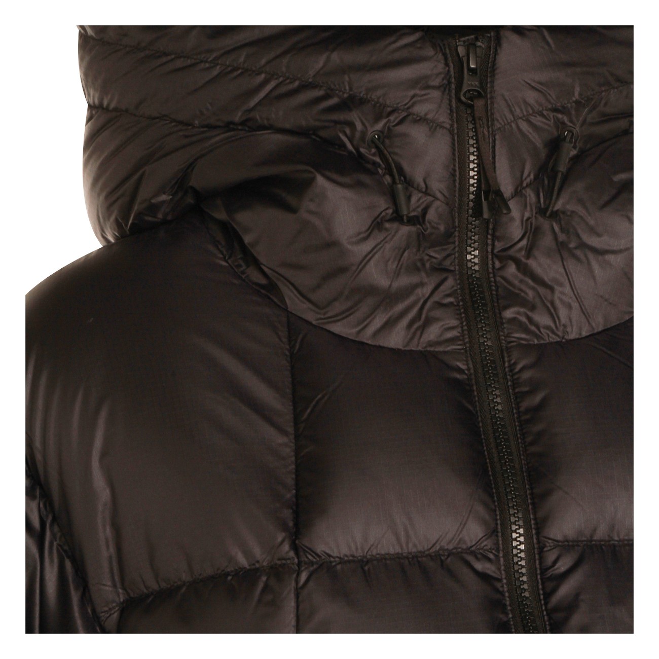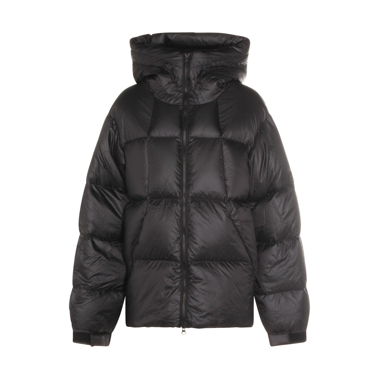 Black nylon Pertex Quantum down jacket from Goldwin featuring high collar, long sleeves, hood, padded, zip fastening, pockets and regular vestibility.