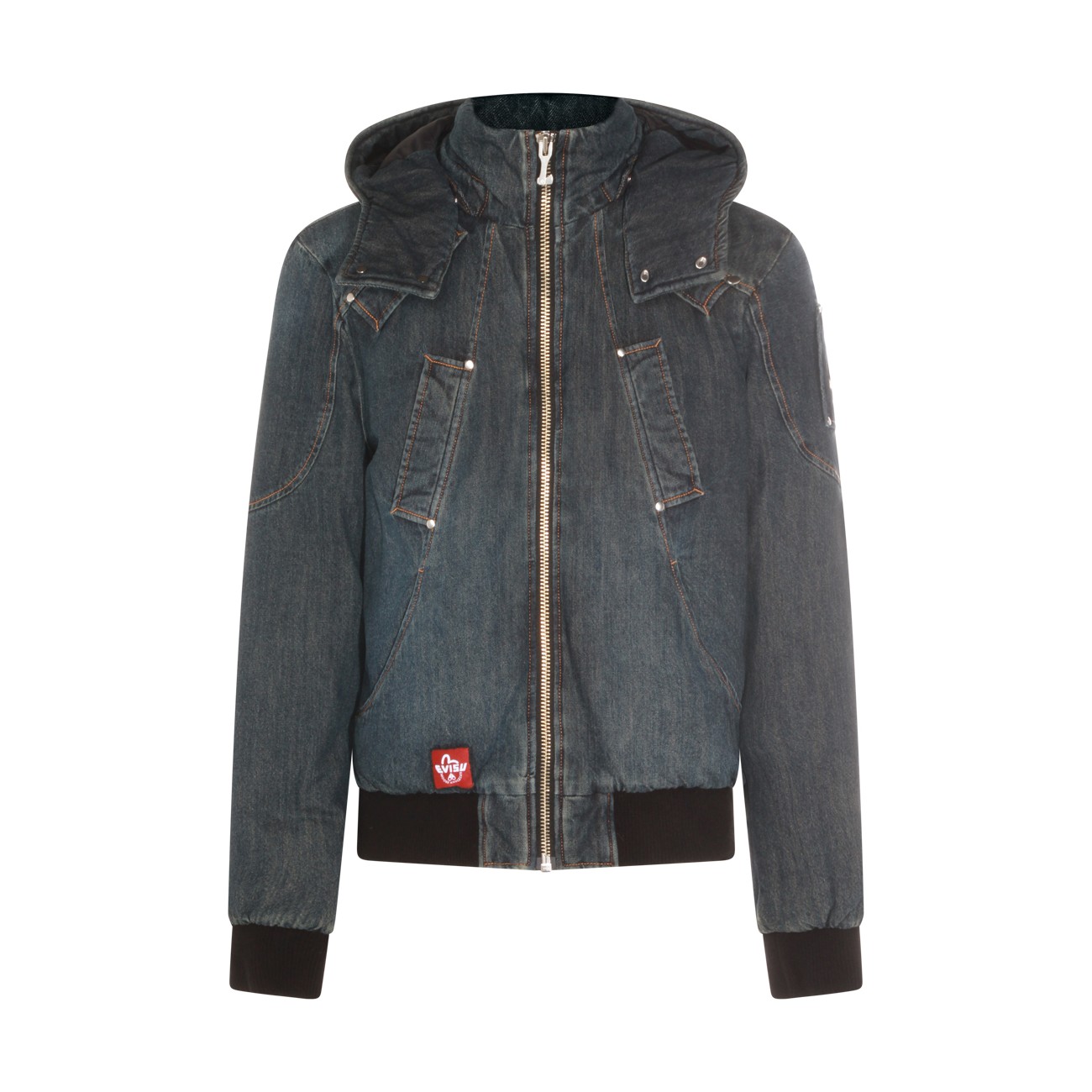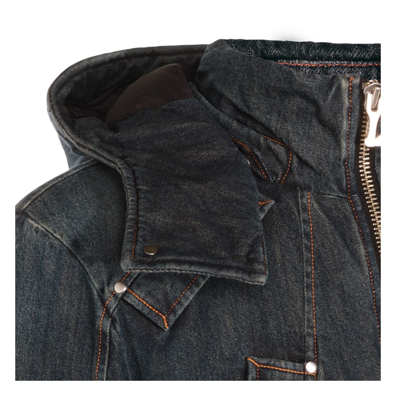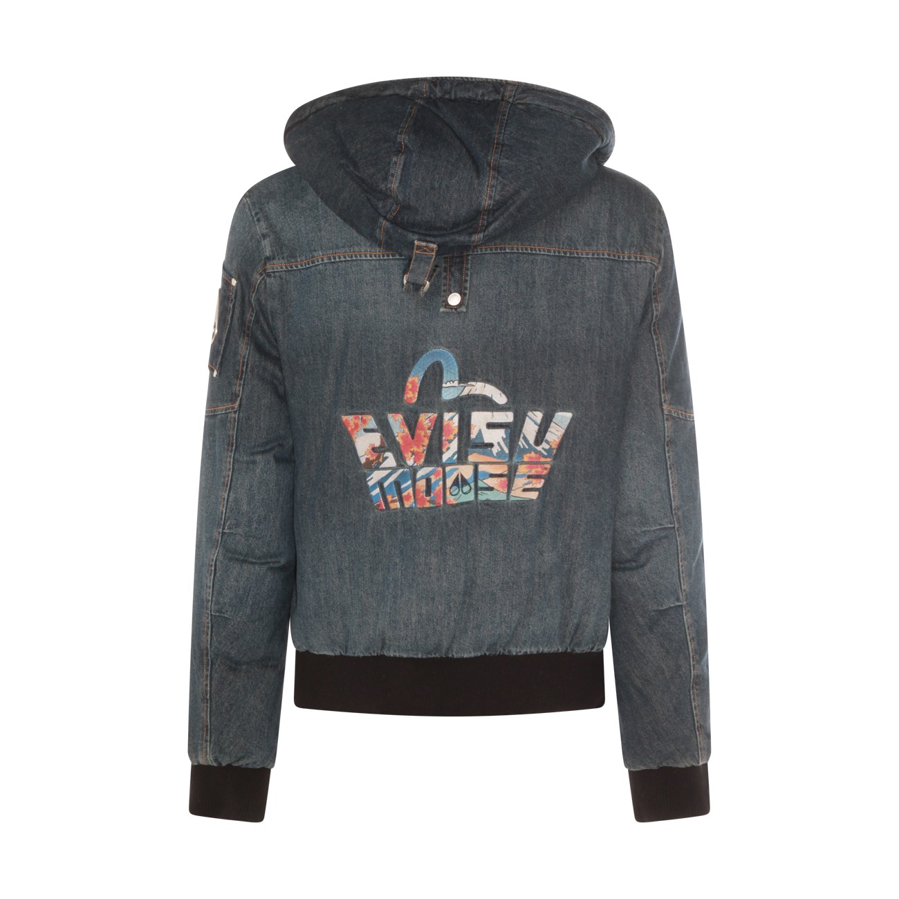 Denim cotton down jacket from Moose Knuckles featuring high collar, hood, long sleeves, zip fastening, elasticated cuffs and hem and logo patch.