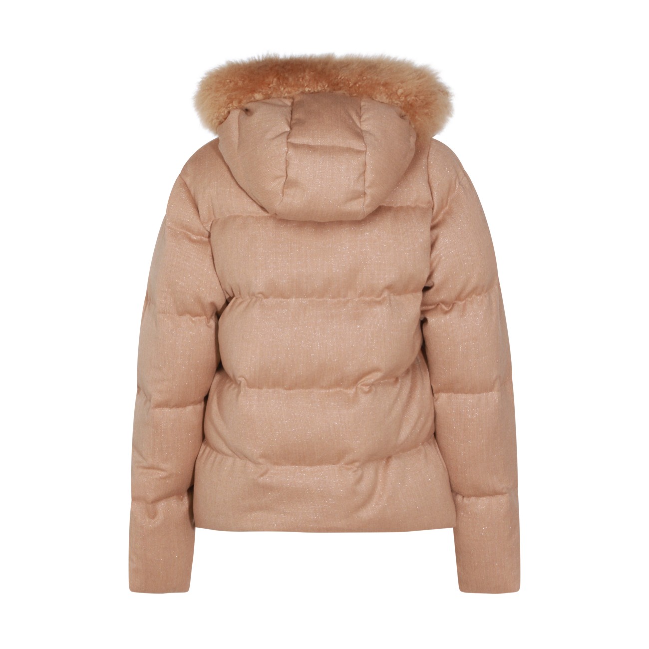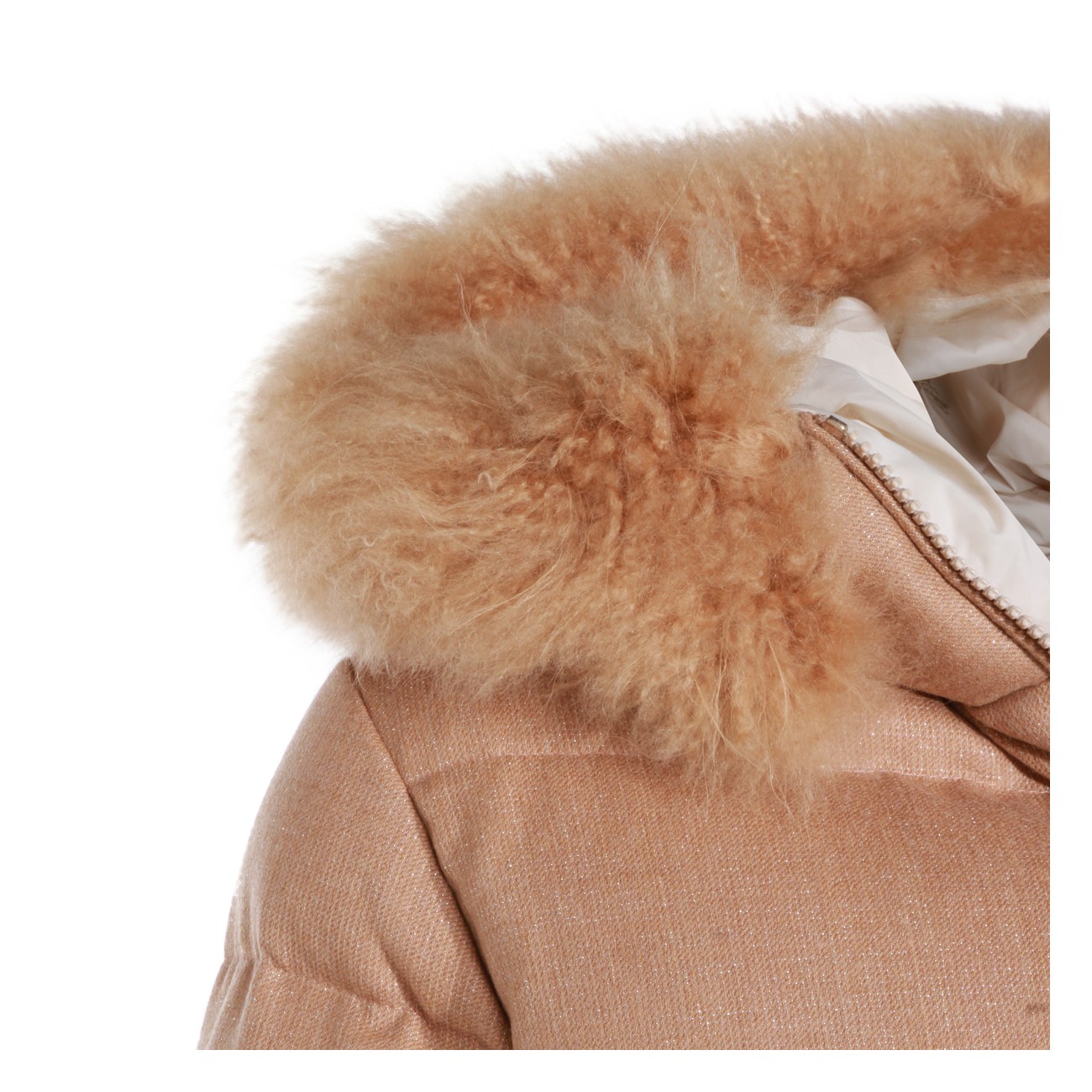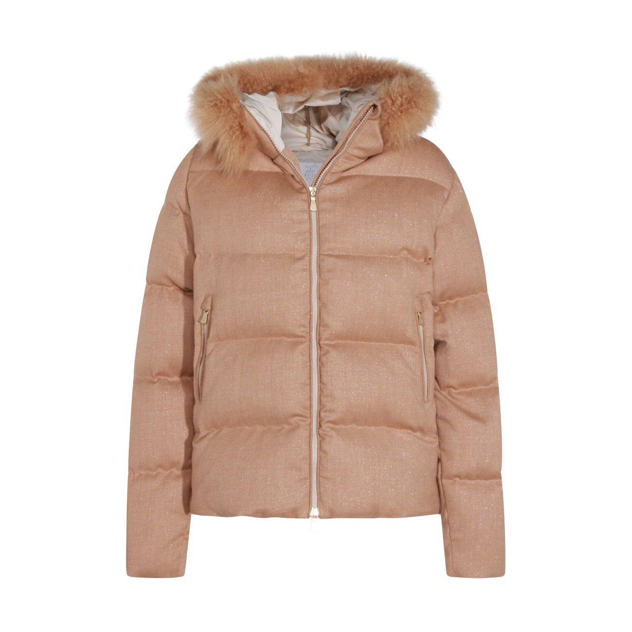 Sand wool down jacket from Eleventy featuring high collar, hood with faux fur, long sleeves, padded, zip fastening and regular vestibility.