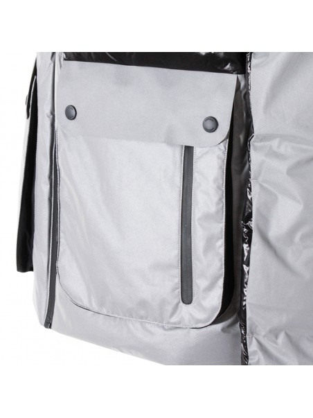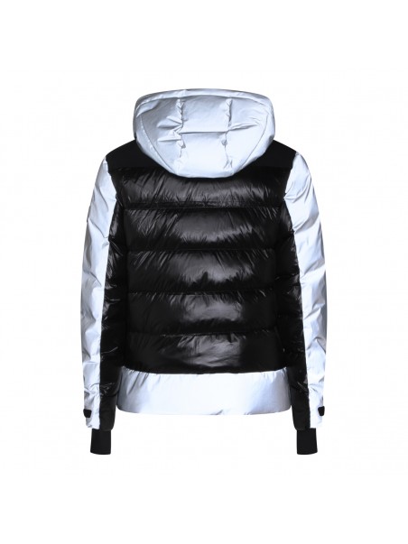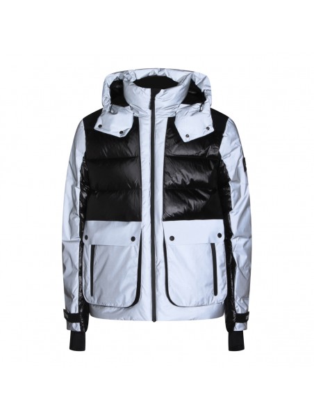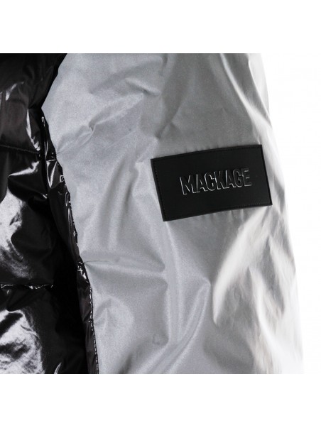 Reflective down jacket from Mackage featuring high collar, removable hood with visor, padded, adjustable cuffs, zip fastening and pockets.