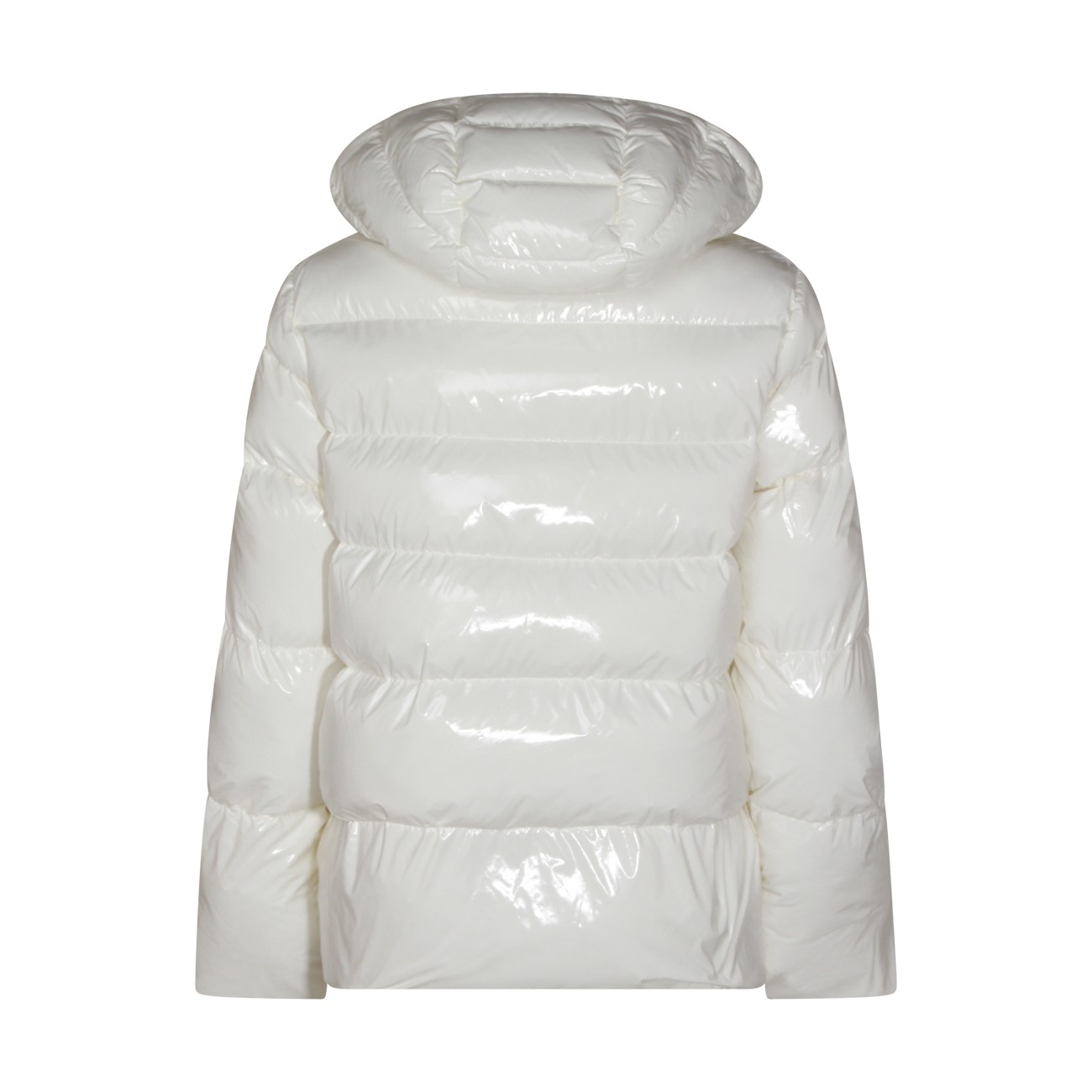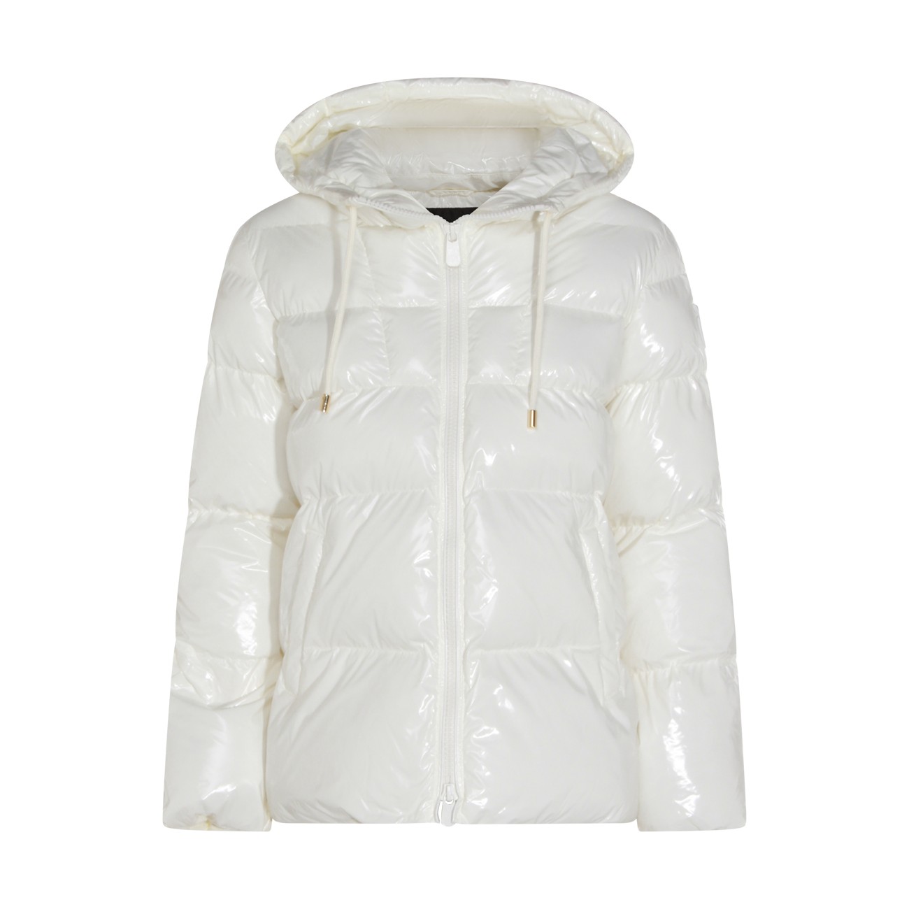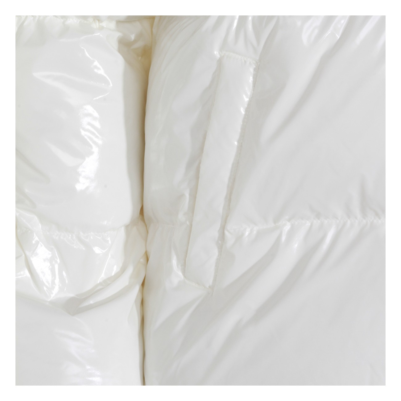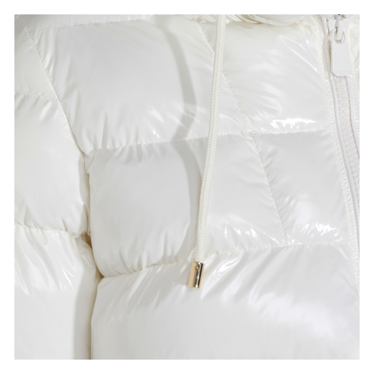 White down jacket from Pinko featuring high collar hood, front zip closure, logo label, side pockets and vynil effect.