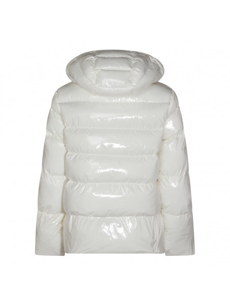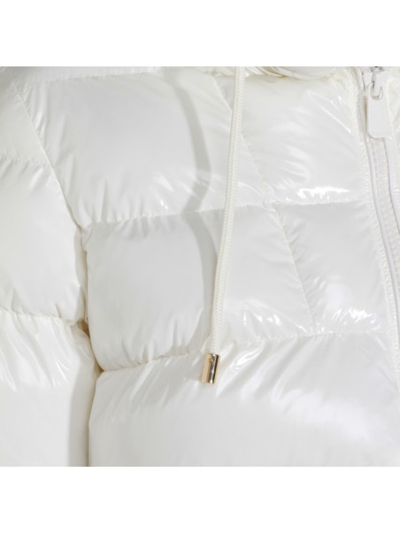 White down jacket from Pinko featuring high collar hood, front zip closure, logo label, side pockets and vynil effect.