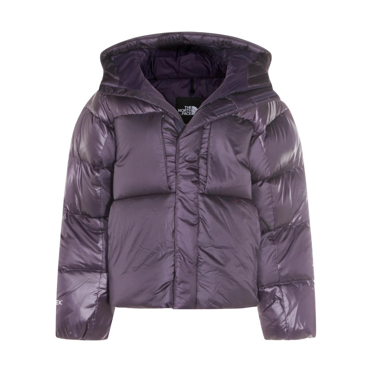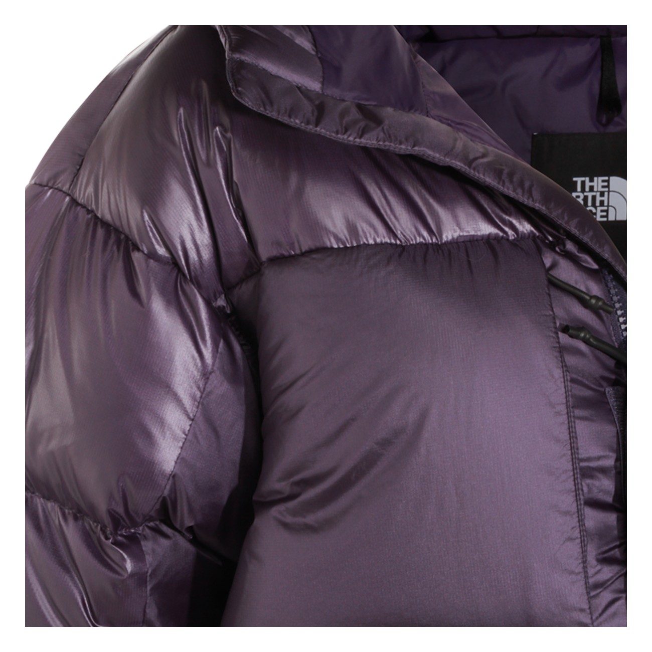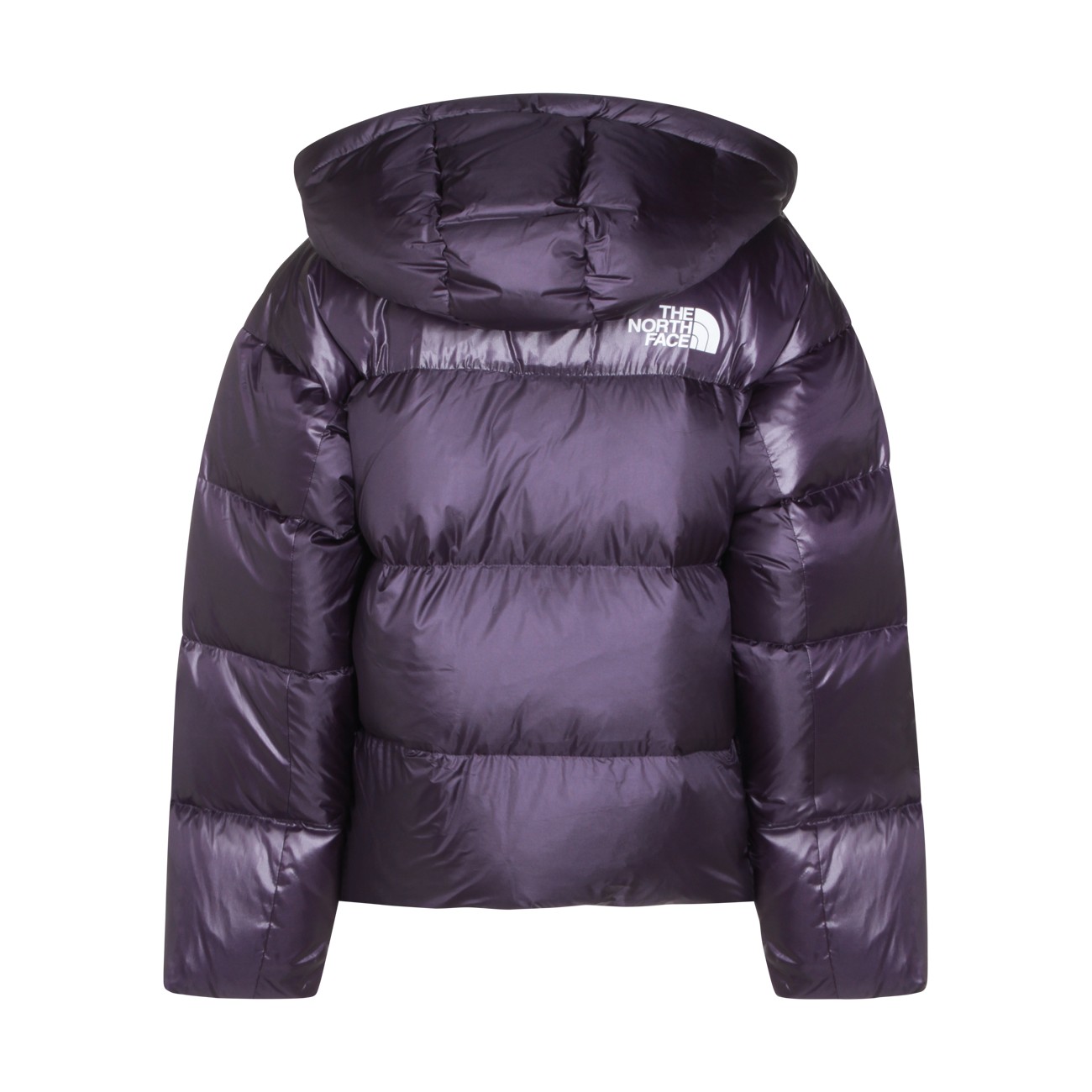 Purple down jacket from The North Face featuring high collar, hood, long sleeves, padded, frontal fastening and regular vestibility.