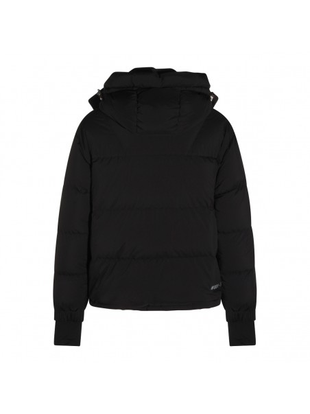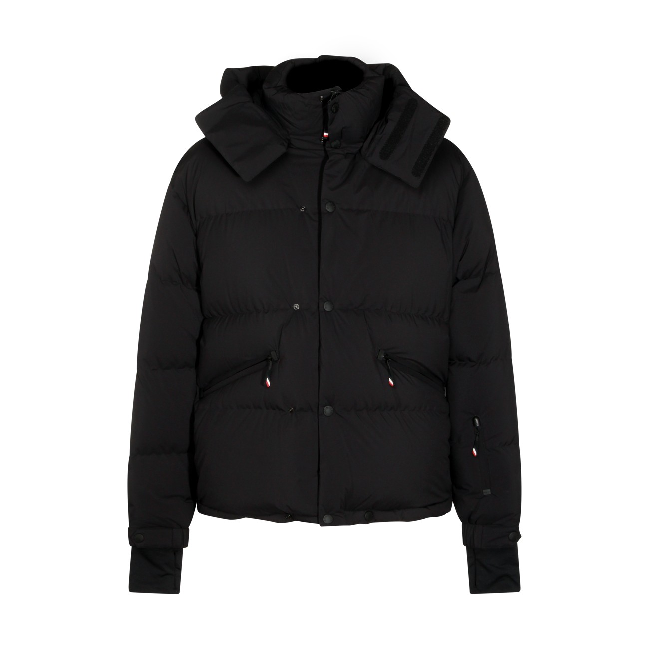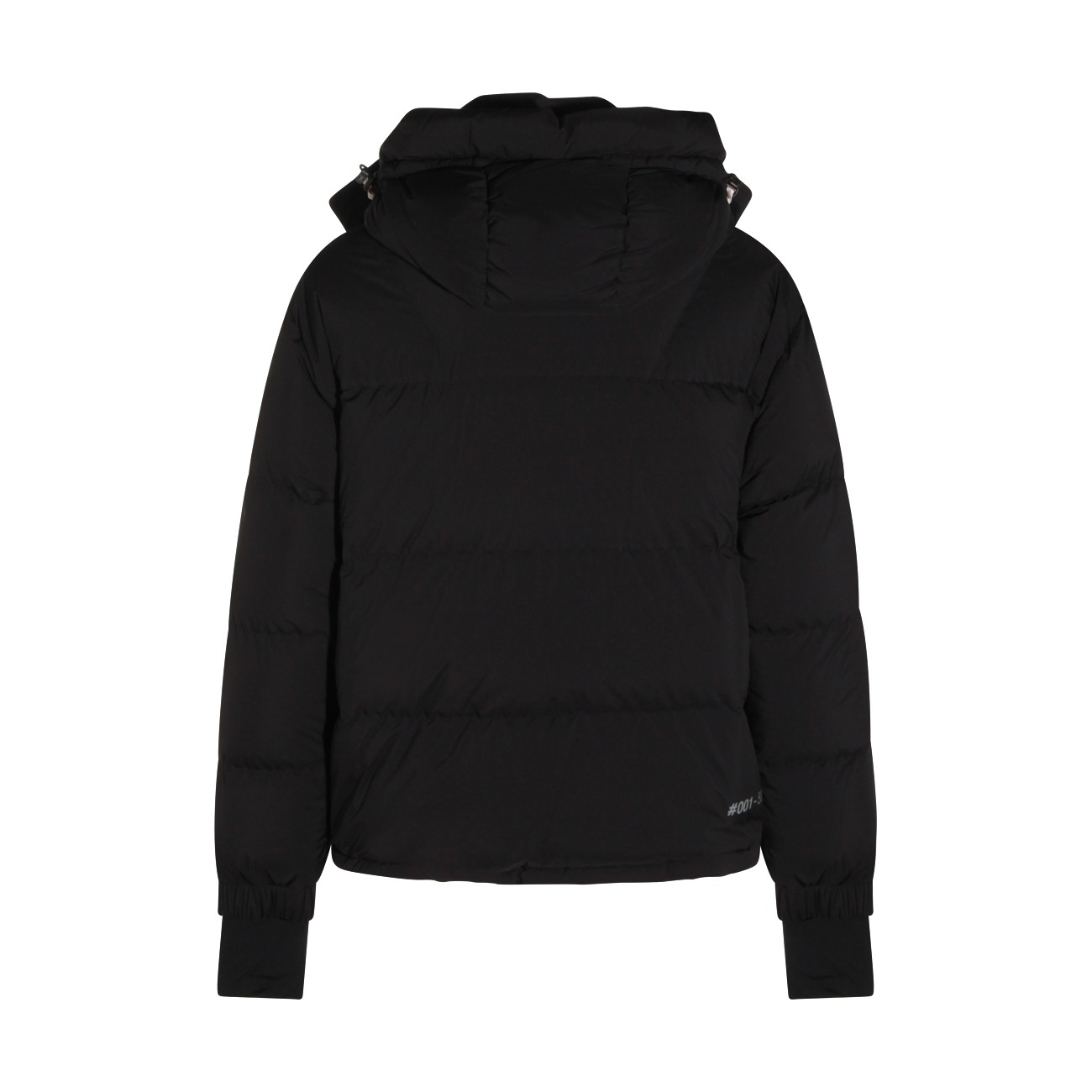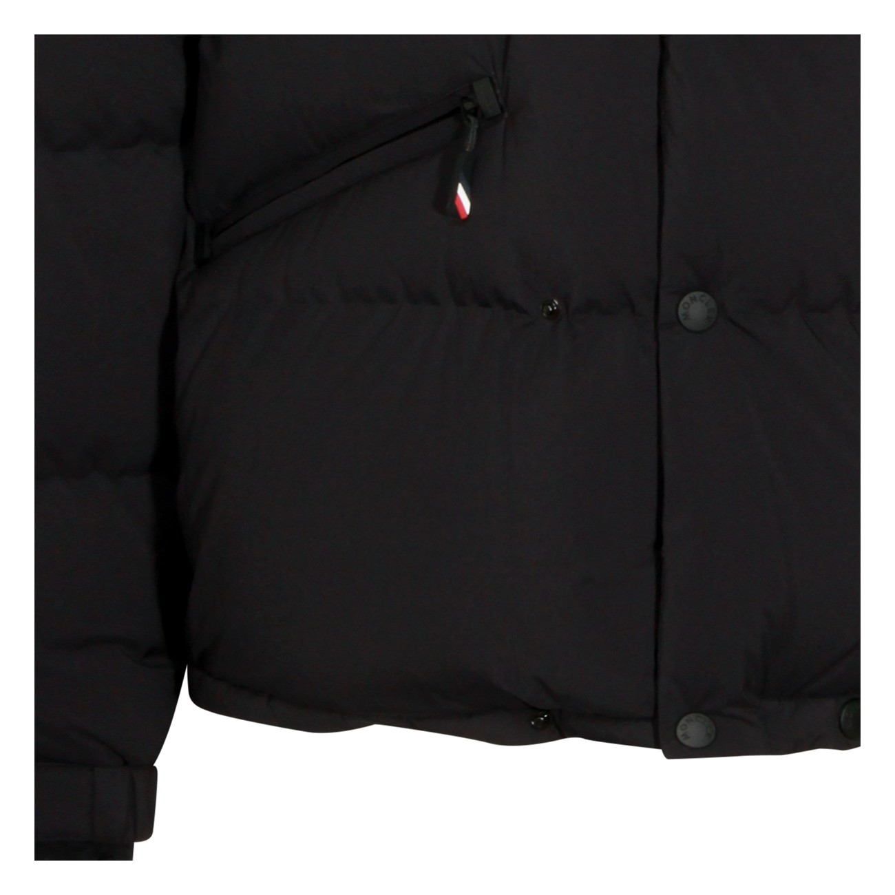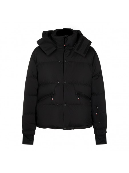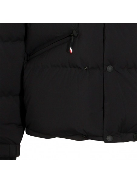 Black coraia down jacket from Moncler Grenoble featuring high collar, hood, padded, long sleeves, button fastening, elasticated cuffs and regular vestibility.
