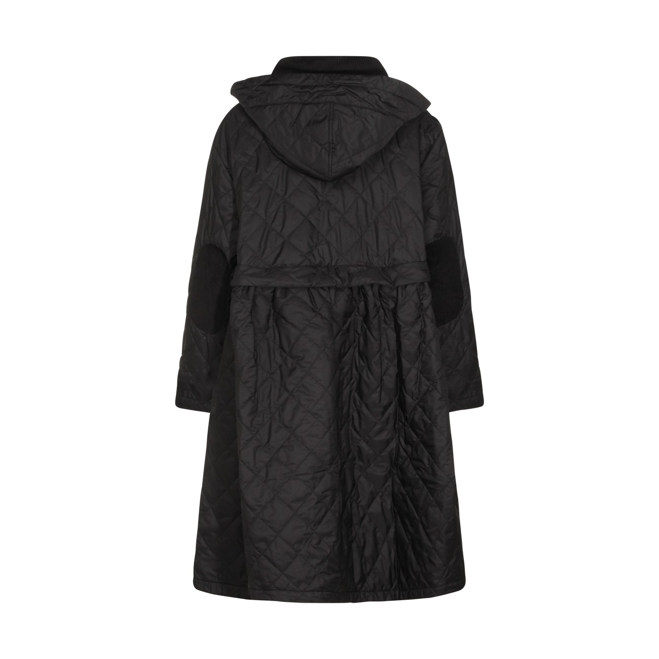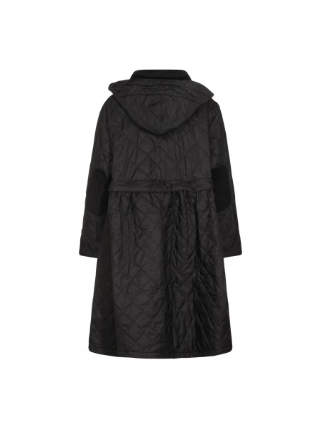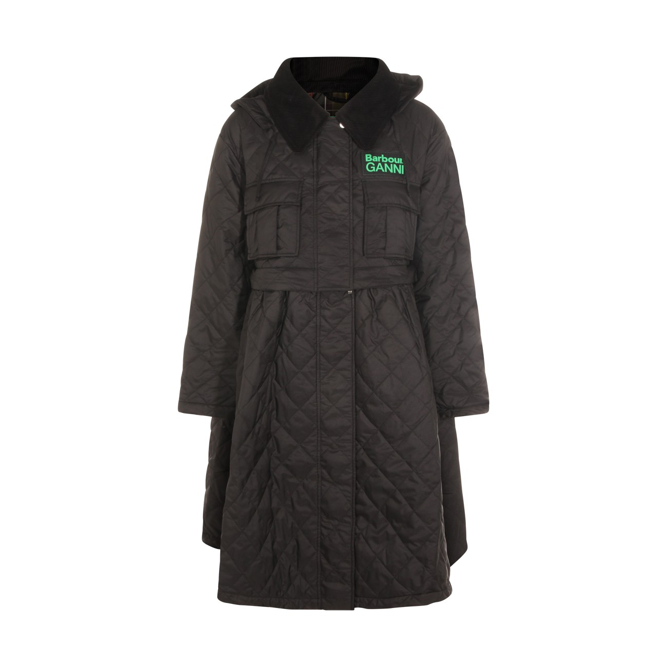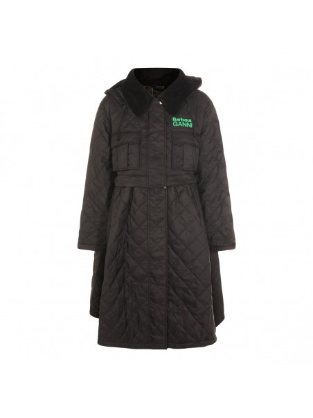 Black down jacket from Barbour X Ganni featuring hood, contrasting collar, long sleeves, buttons fastening, frontal pockets, padded, looose vestibility and frontal logo.
