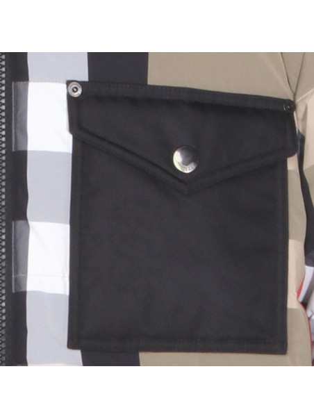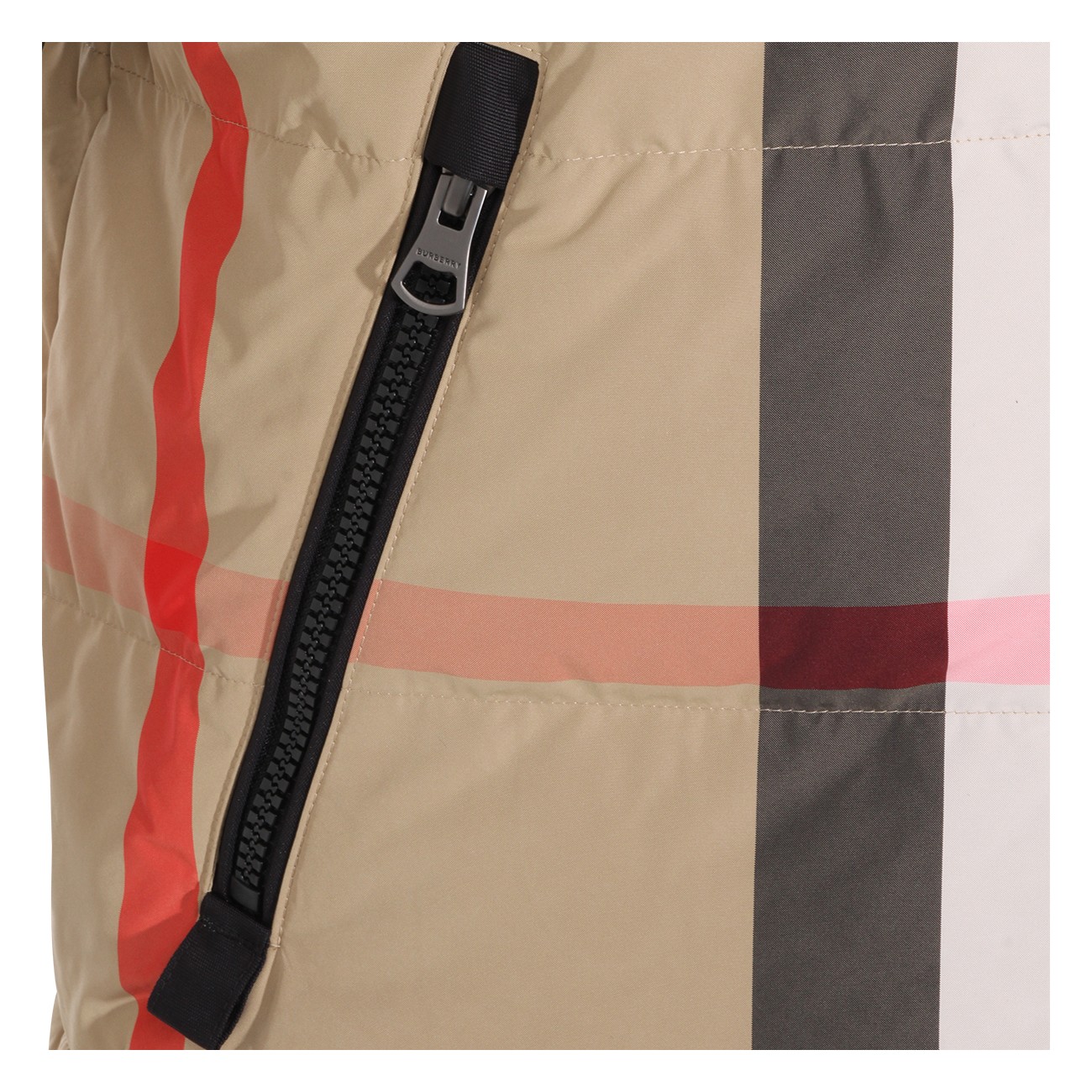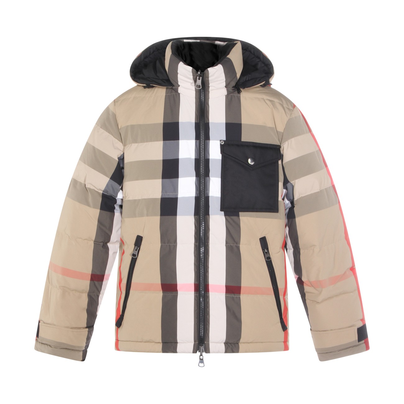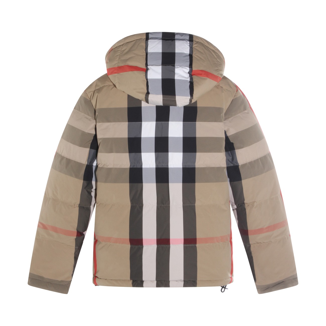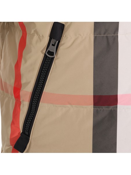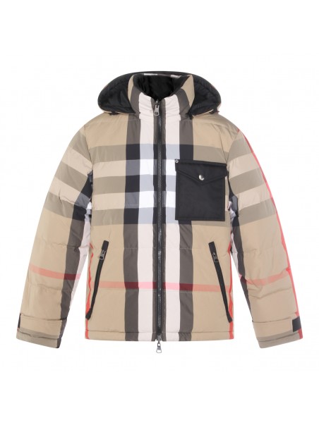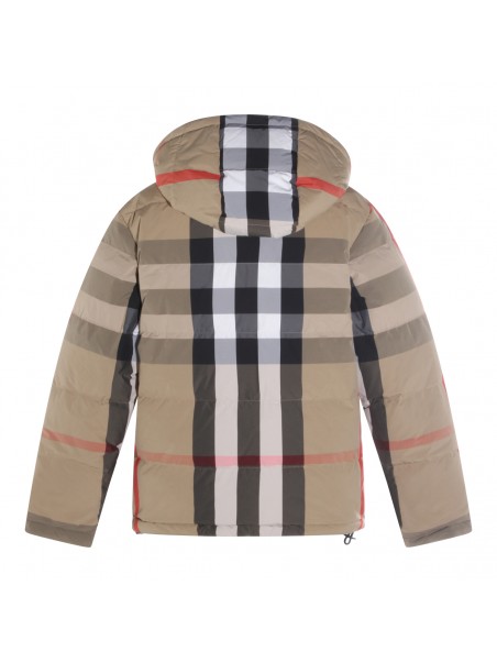 Beige down jacket from Burberry featuring long sleeves, hood, all over check motif, pockets and regular vestibility.