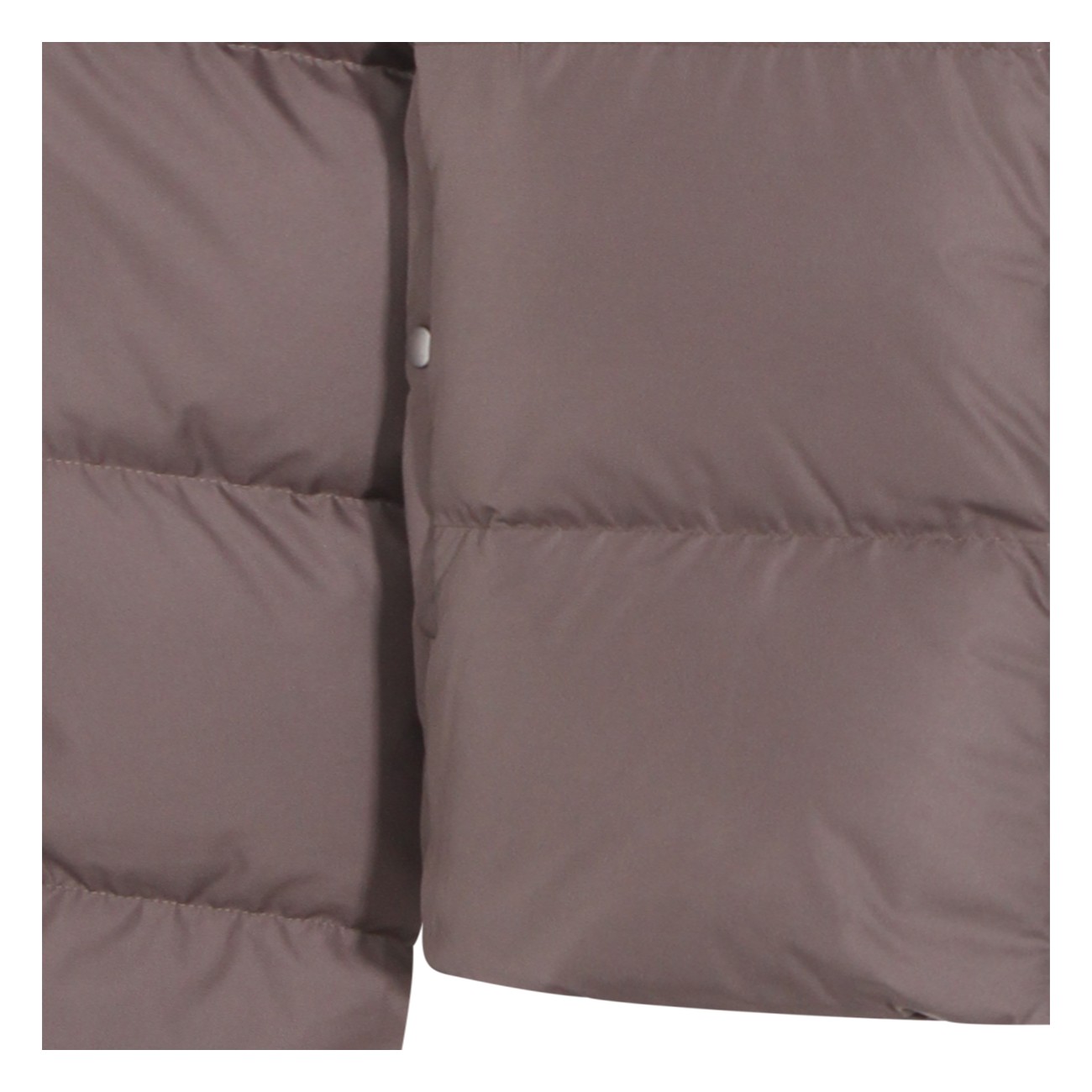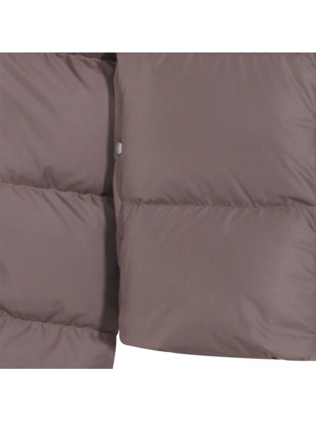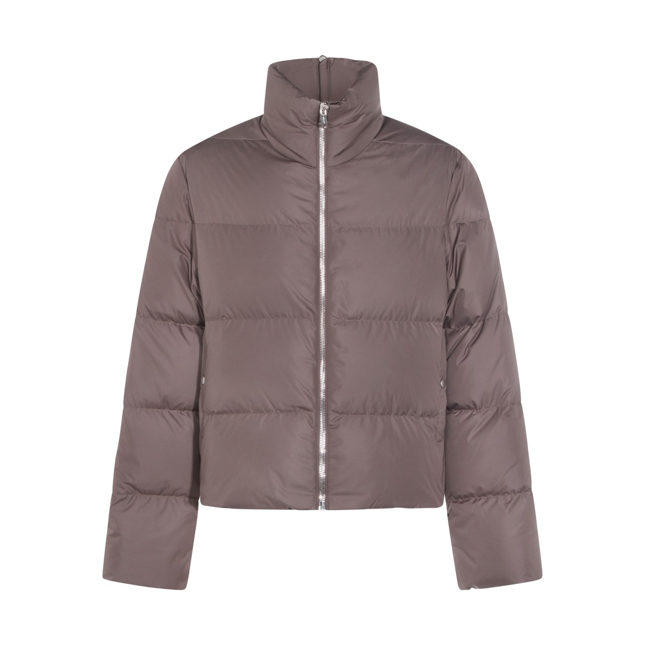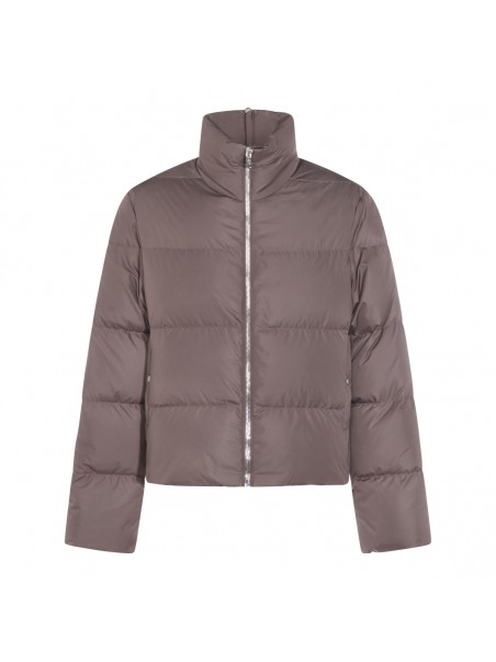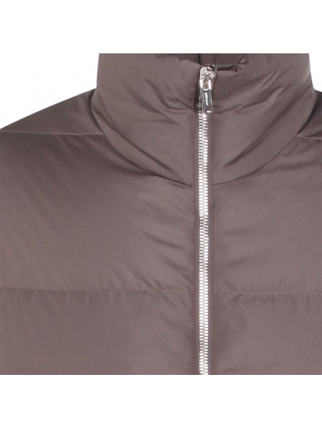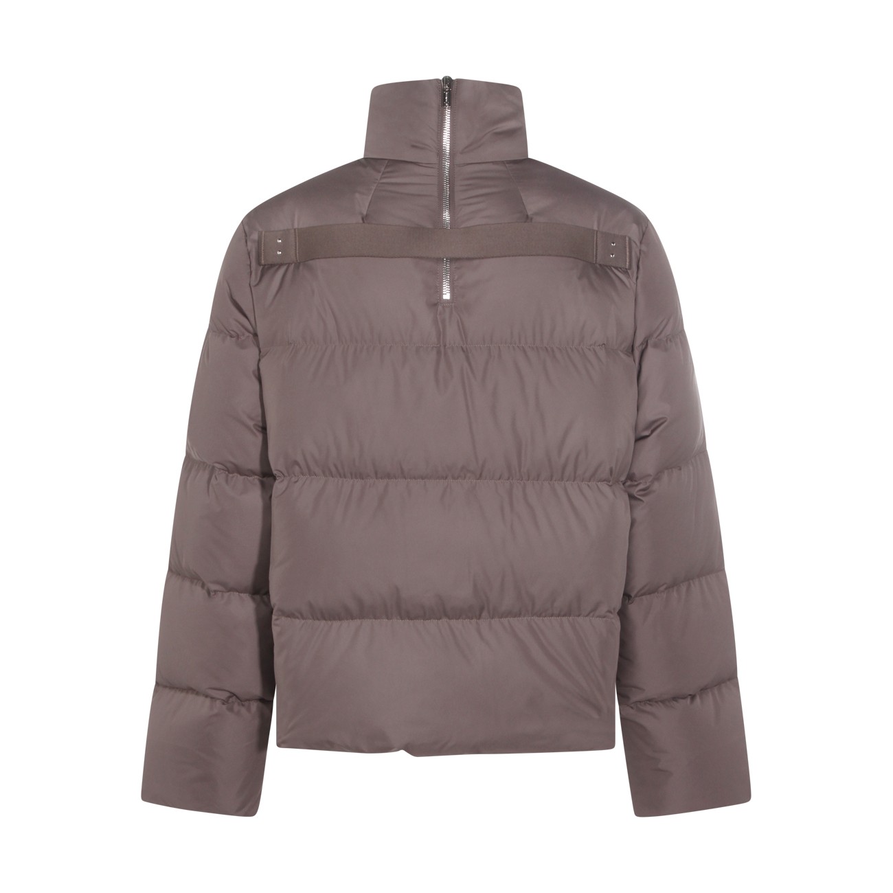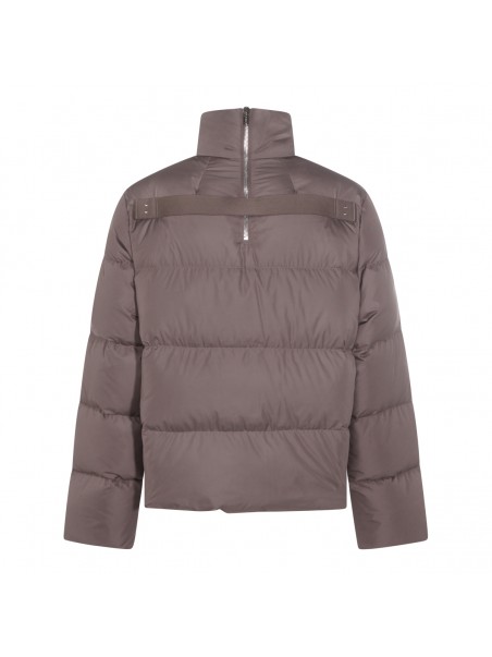 Dark grey Cyclopic down jacket from Moncler + Rick Owens featuring raised collar with zip fastening on the back, zip closure, long sleeves, welt pockets with snap button, internal zipo pockkets, ribbon on the back, embroidered logo patch, wool blend knit finishes, padded and oversized fit.