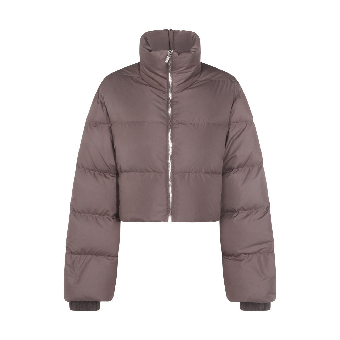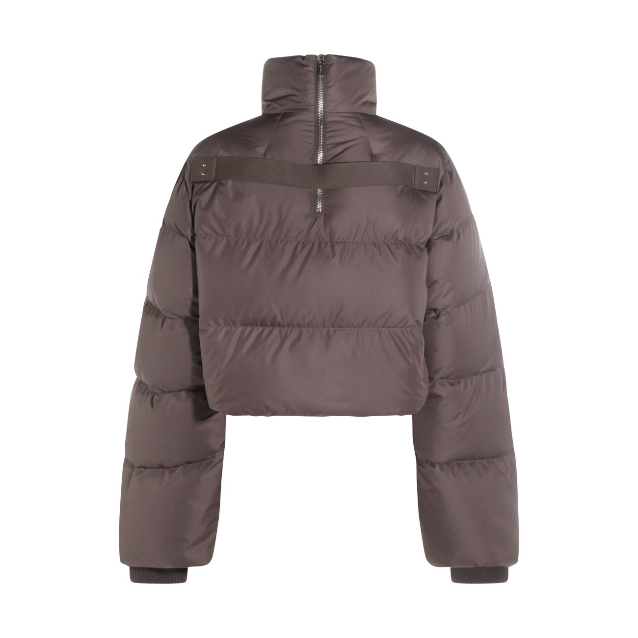 Dark grey Cyclopic down jacket from Moncler + Rick Owens featuring raised collar with zip fastening on the back, zip closure, long sleeves, welt pockets with snap button, internal zip pockets, ribbon on the back, embroidered logo patch, wool blend knit finishes, padded and oversized fit.