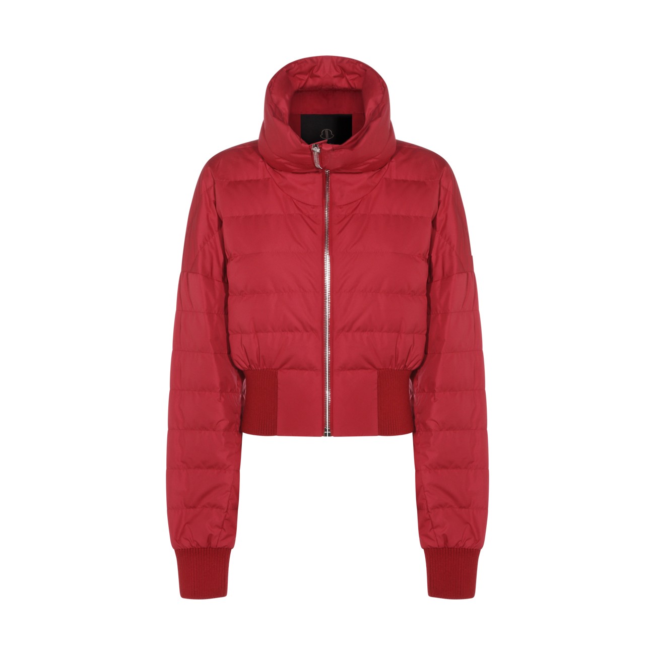 Red Cropped down jacket from Moncler + Rick Owens featuring raised neck, zip closure, long sleeves, zip pockets, embroidered logo patch, wool blend knit finishes, padded and loose fit.