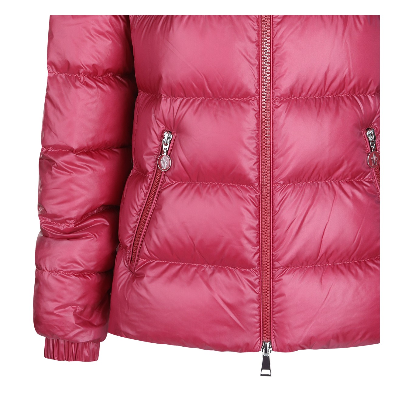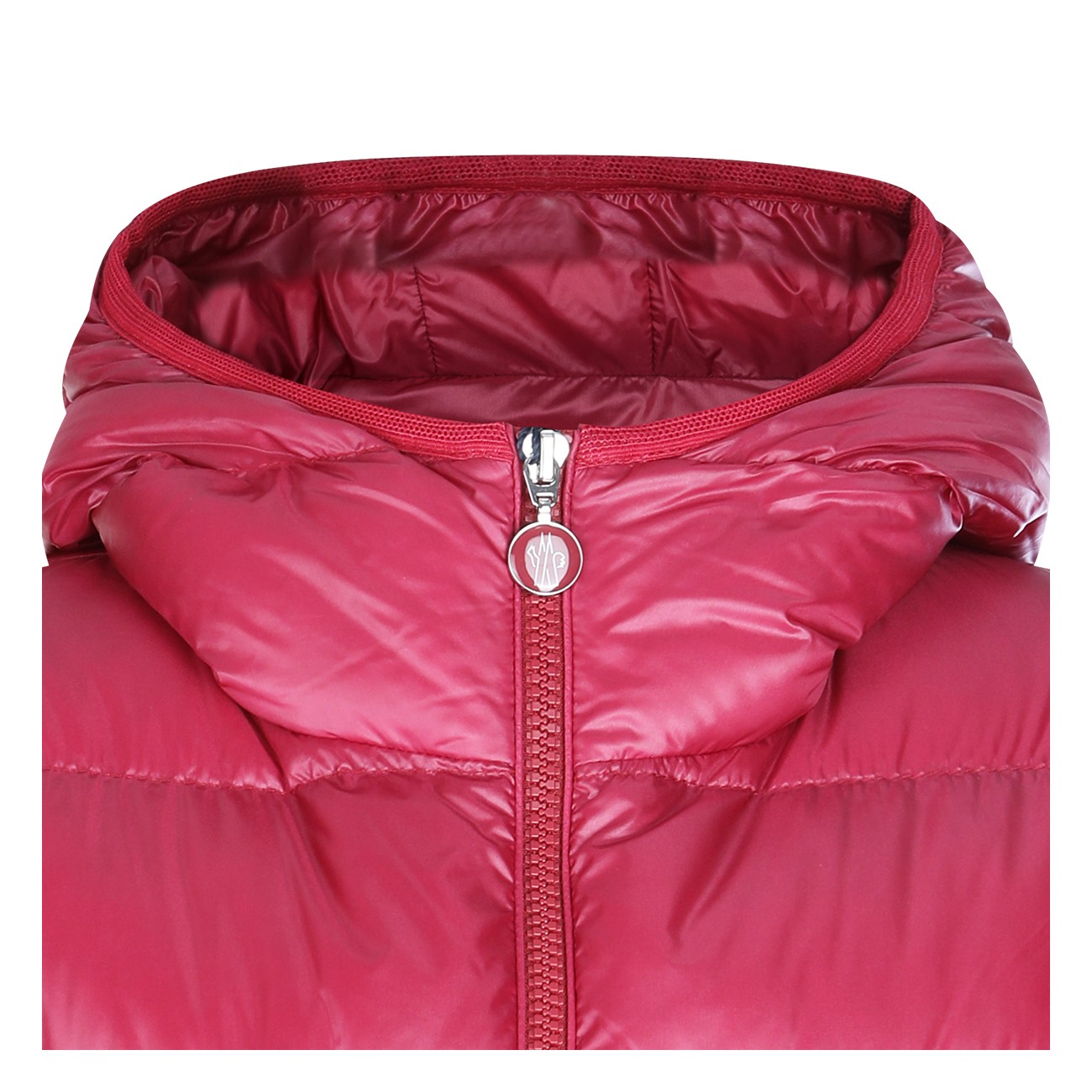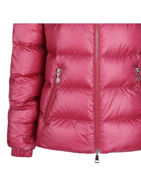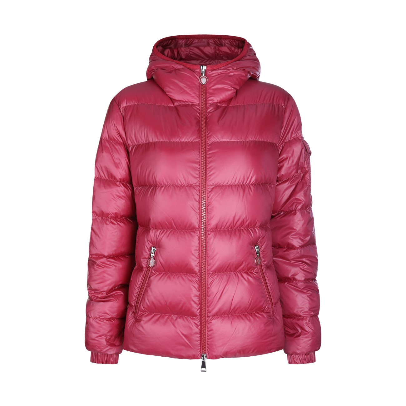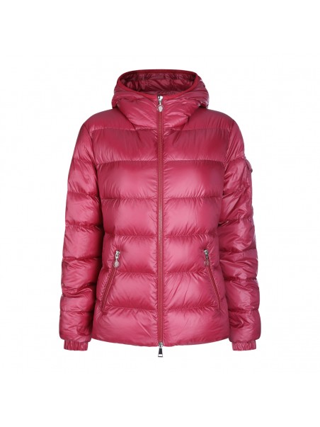Red down jacket from Moncler featuring hood, zip fastening, long sleeves, zip pockets, sleeve pocket with snap button, adjustable cuffs, padded and slim fit.