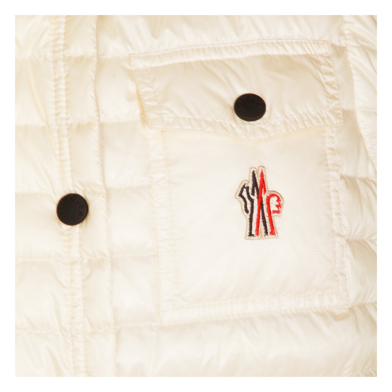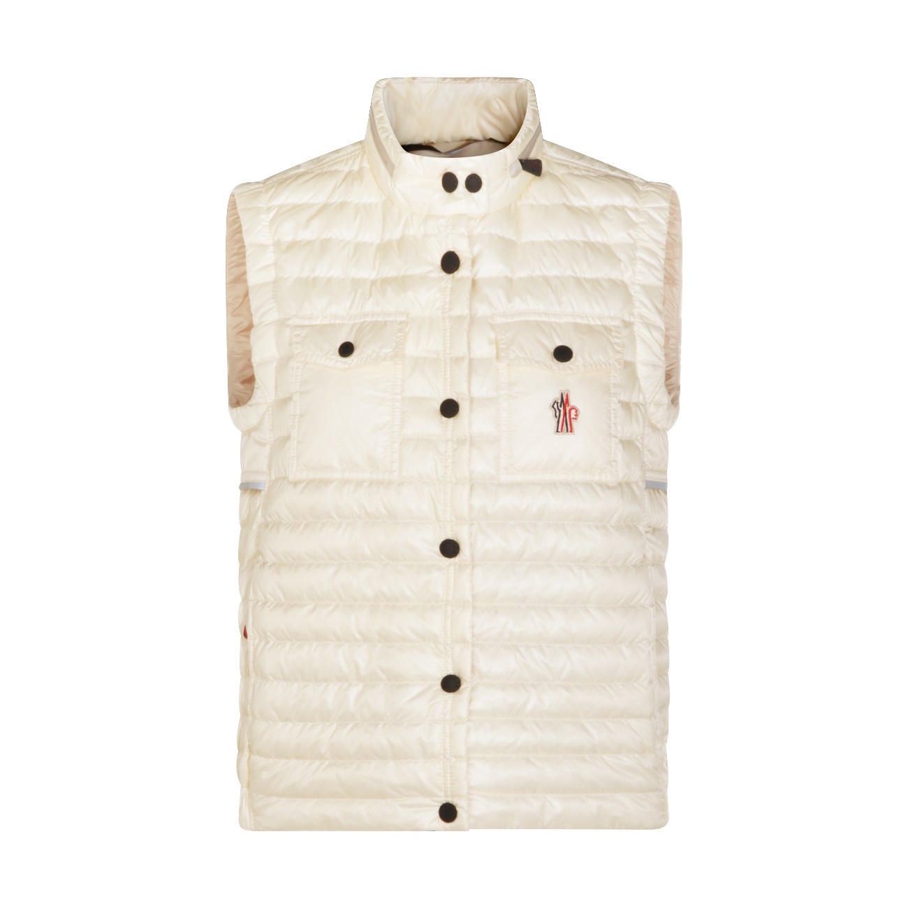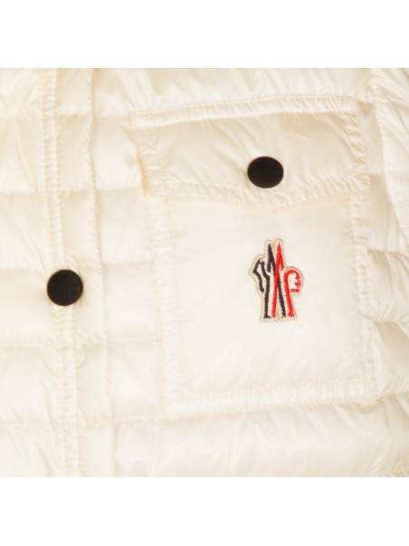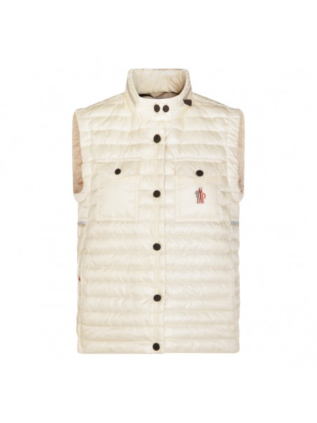 Ivory Gumiane vest down jacket from Moncler Grenoble featuring vest line, clap button closure, loogo patch at chest, chest pockets and high neck.