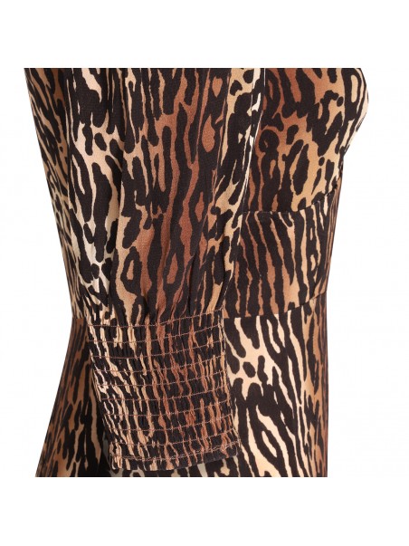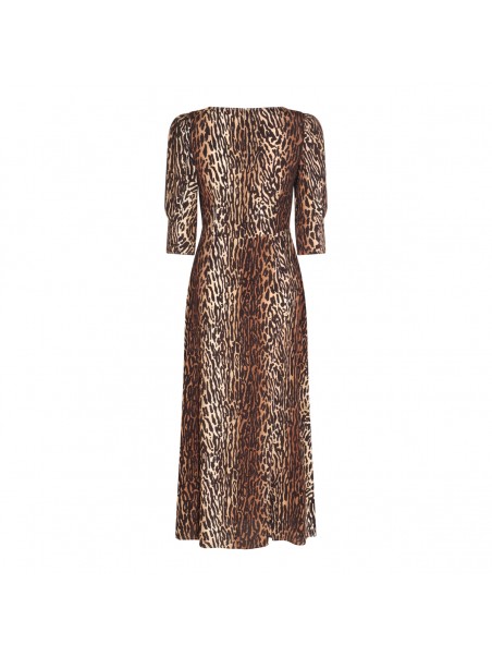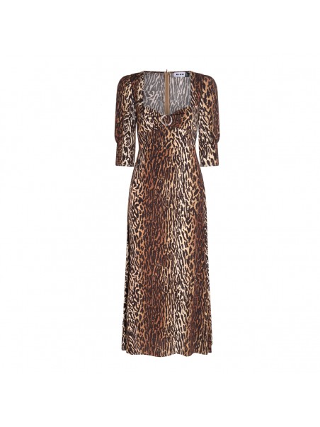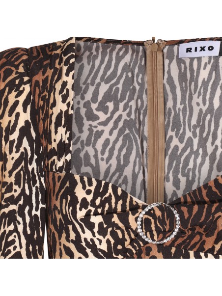 Dark brown viscose dress from Rixo featuring all-over leopard print, crystal buckle detail, sweetheart neck, half-length sleeves, mid-length and regular fit.
