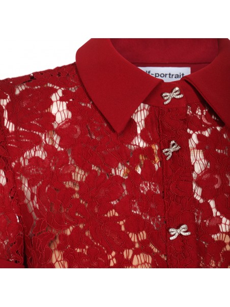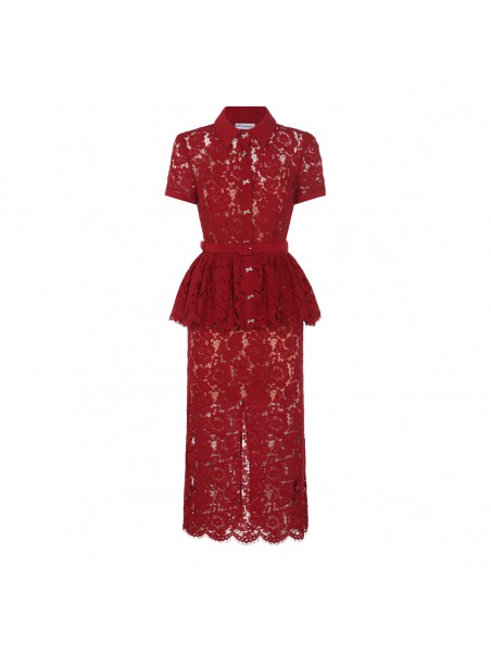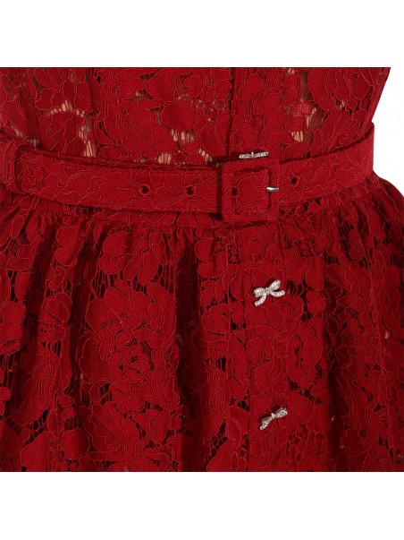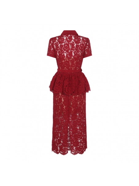 Burgundy dress from Self-Portrait featuring shirt collar, short sleeves, frontal buttons fastening, all-over lace, belt, trasparence and long lenght.