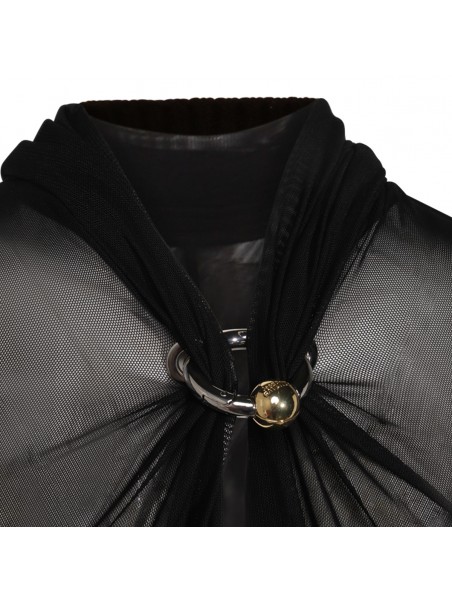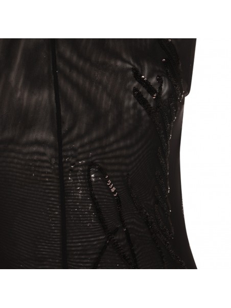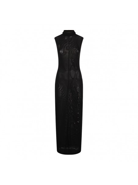 Black maxi dress from Jeans Paul Gaultier featuring high collar, sleeveless, trasparence, maxi length and elasticizated vestibility.