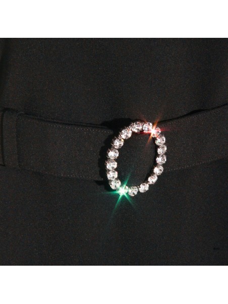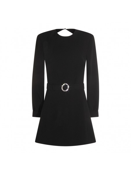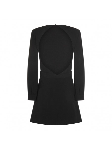 Black mini dress from Saint Laurent featuring long sleeves, belt waist, round collar, open back and mini length.