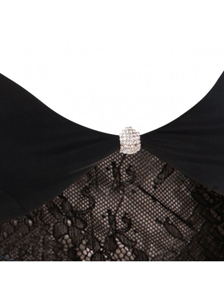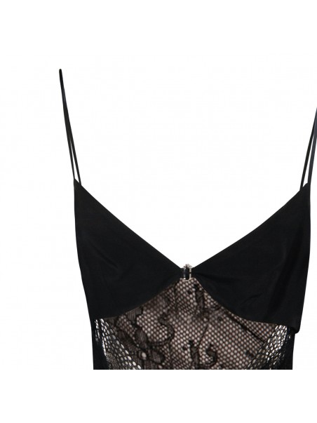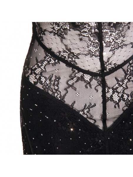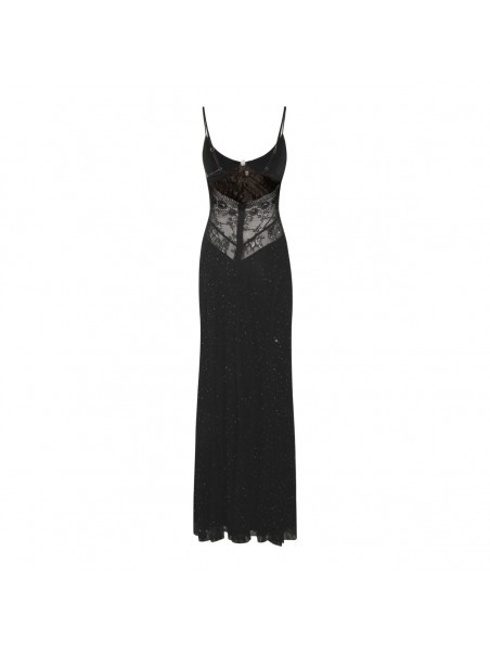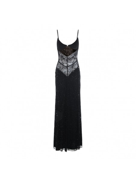Black dress from Nissa featuring deep neckline, sleeveless, open back, thin straps, lace details, trasparence and long lenght.