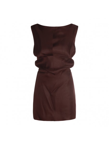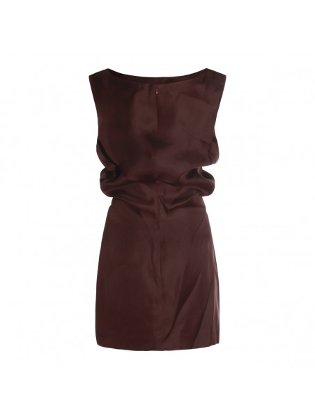 Brown silk mini dress from Khaite featuring sleeveless, round collar, mini length and zip fastening.