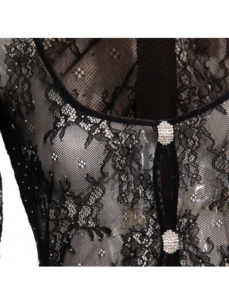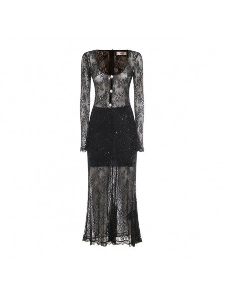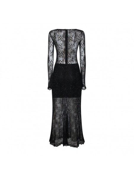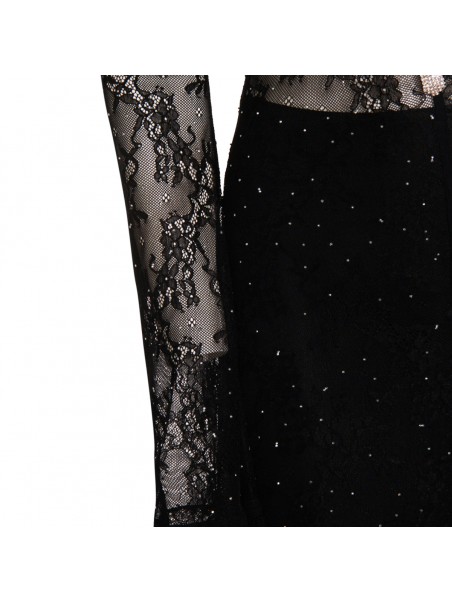 Black midi dress from Nissa featuring long sleeves, round collar, trasparence with laces, zip fastening and midi length.