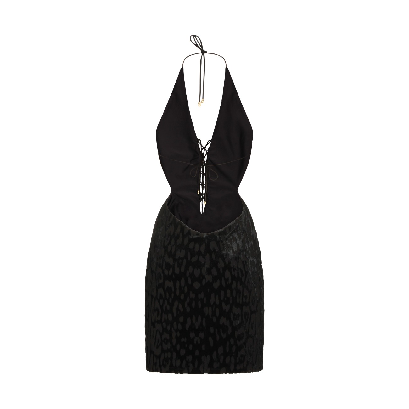 Black viscose dress from Roberto Cavalli featuring deep v neckline, sleeveless, open back, laces fastening and tight vestibility.