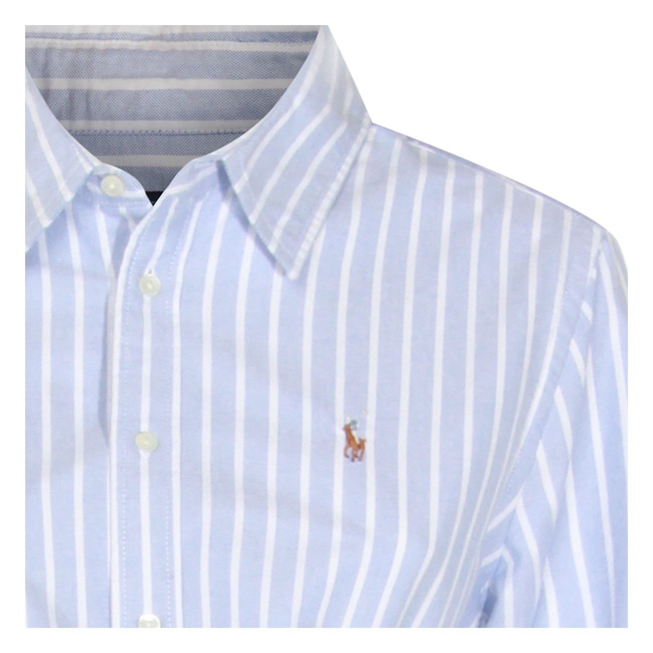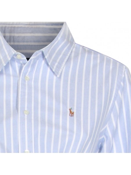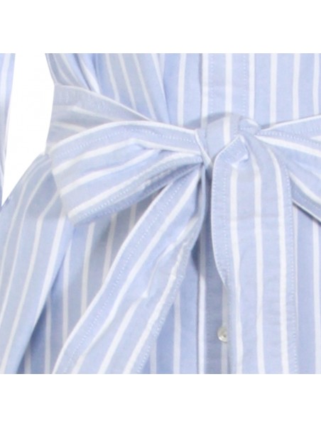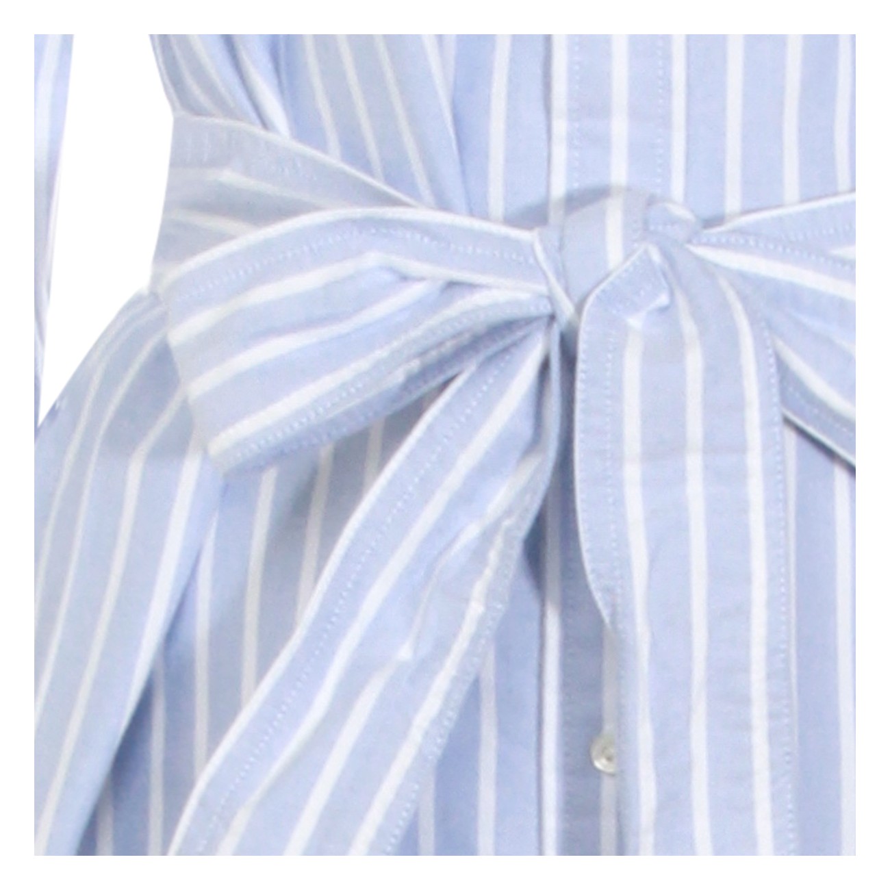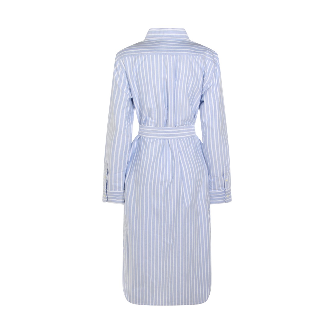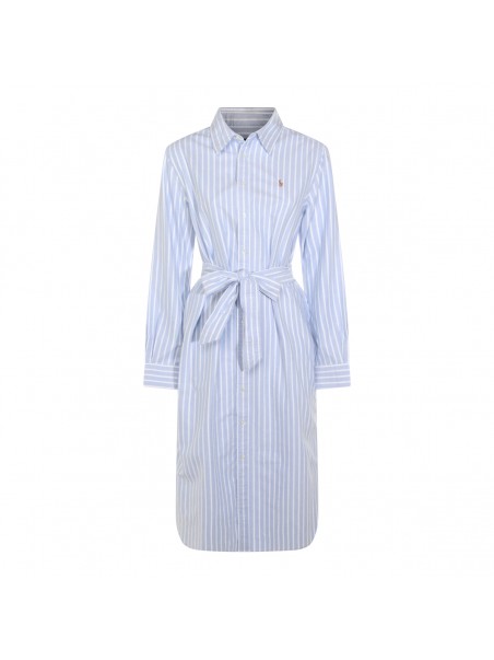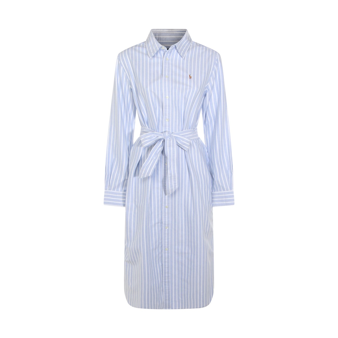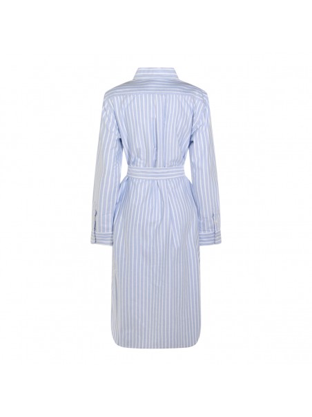 Blue and white cotton dress from Polo Ralph Lauren featuring shirt neck, buttons fastening, long sleeves, waist belt and wide gown.