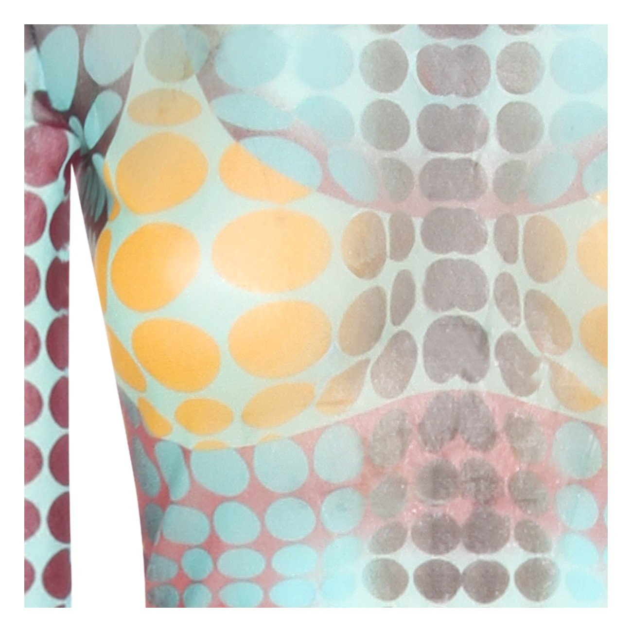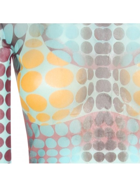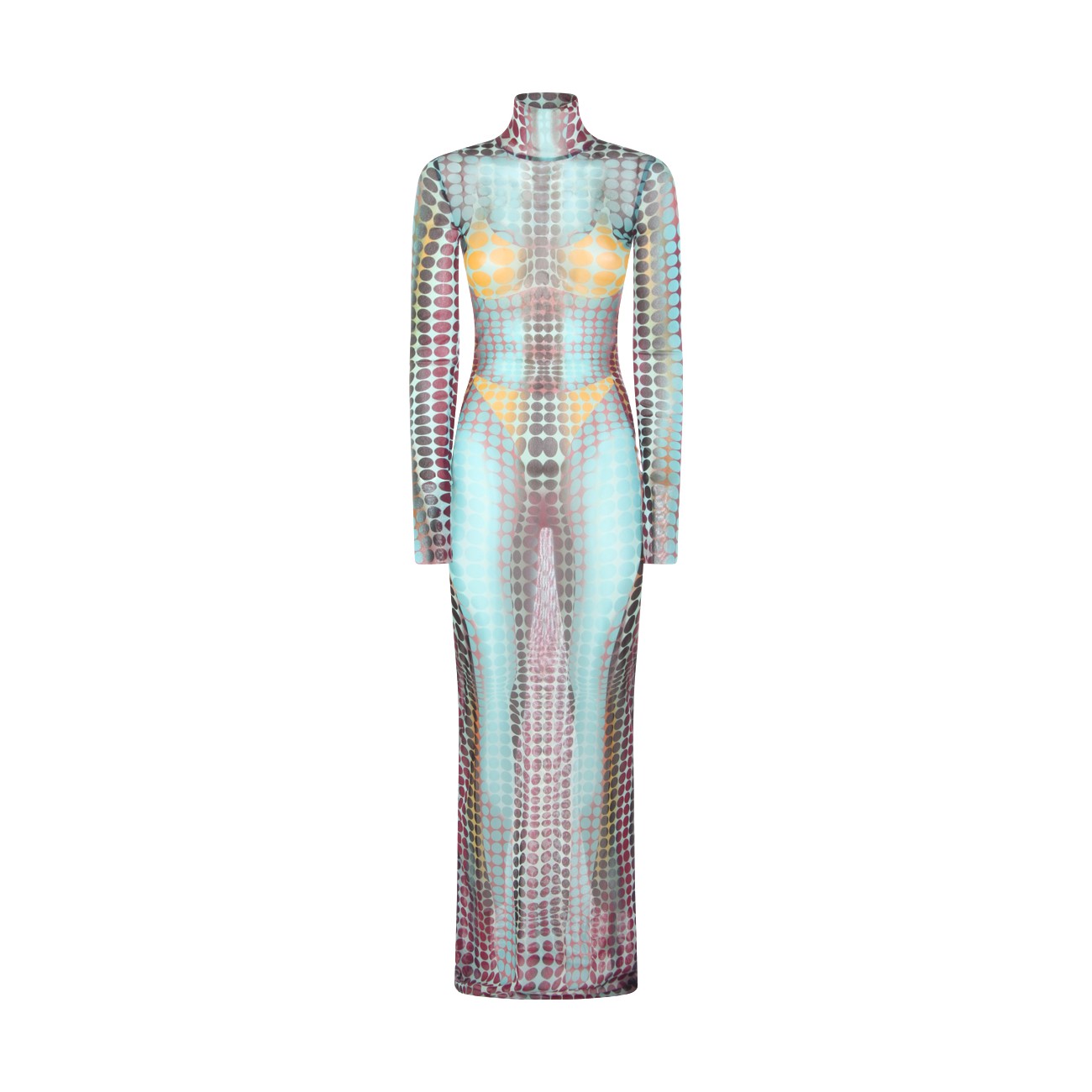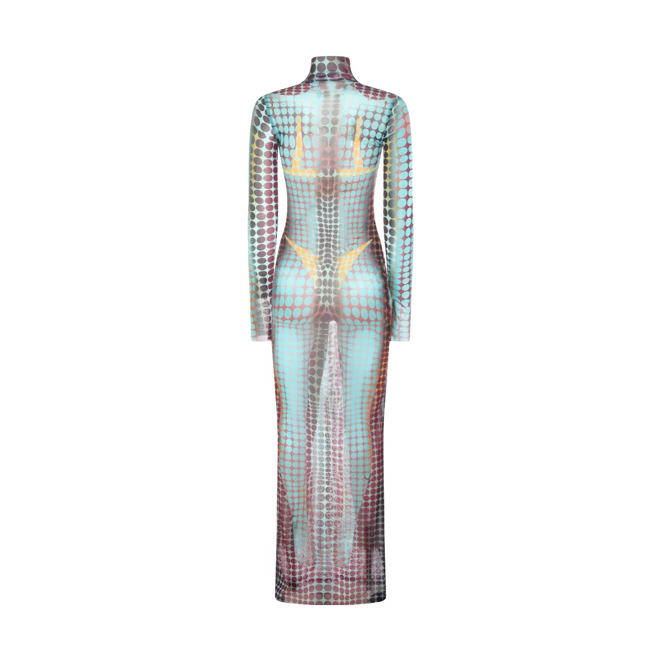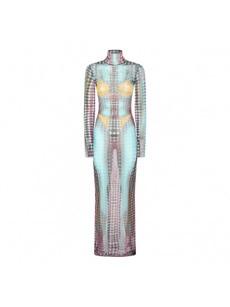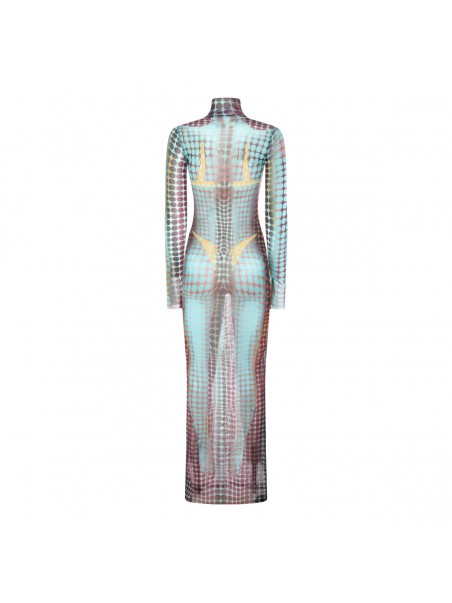 Colorful dress from Jean Paul Gaultier featuring high collar, long sleeves, all over length, stamp and slim vestibility.