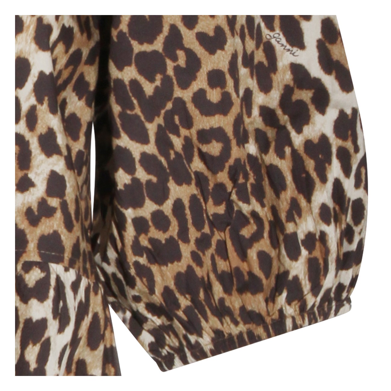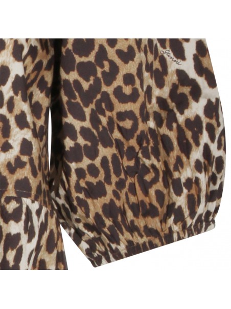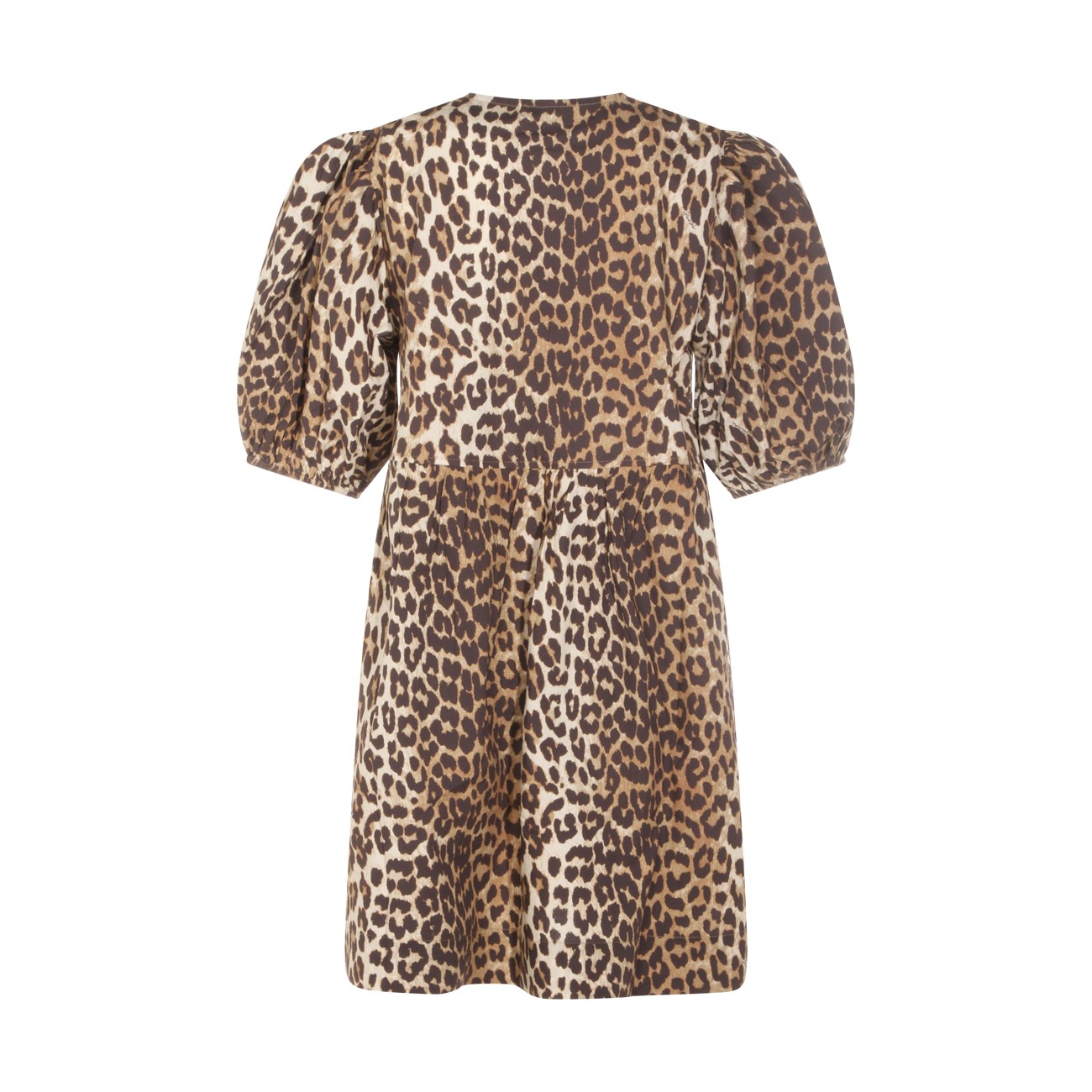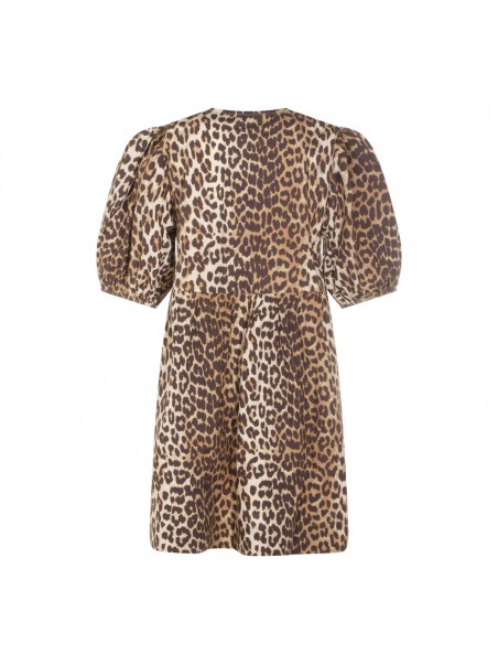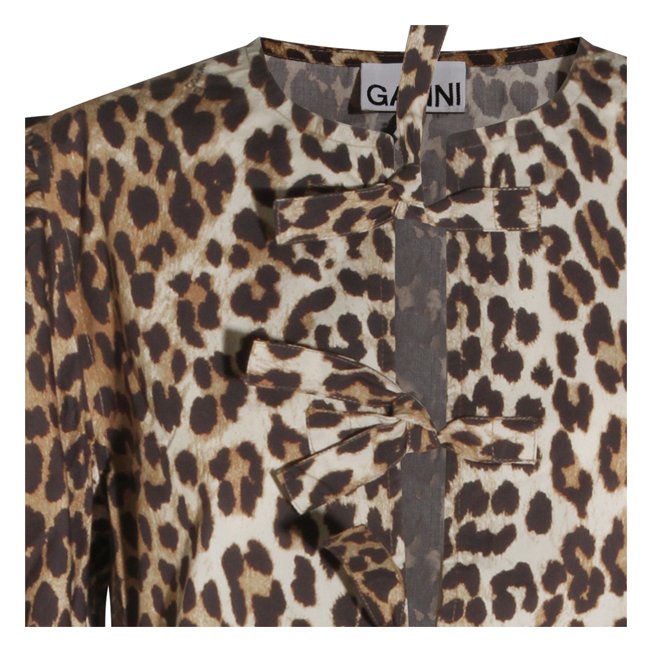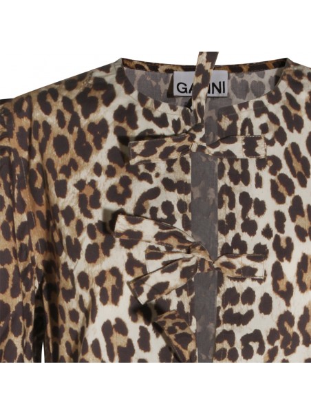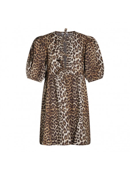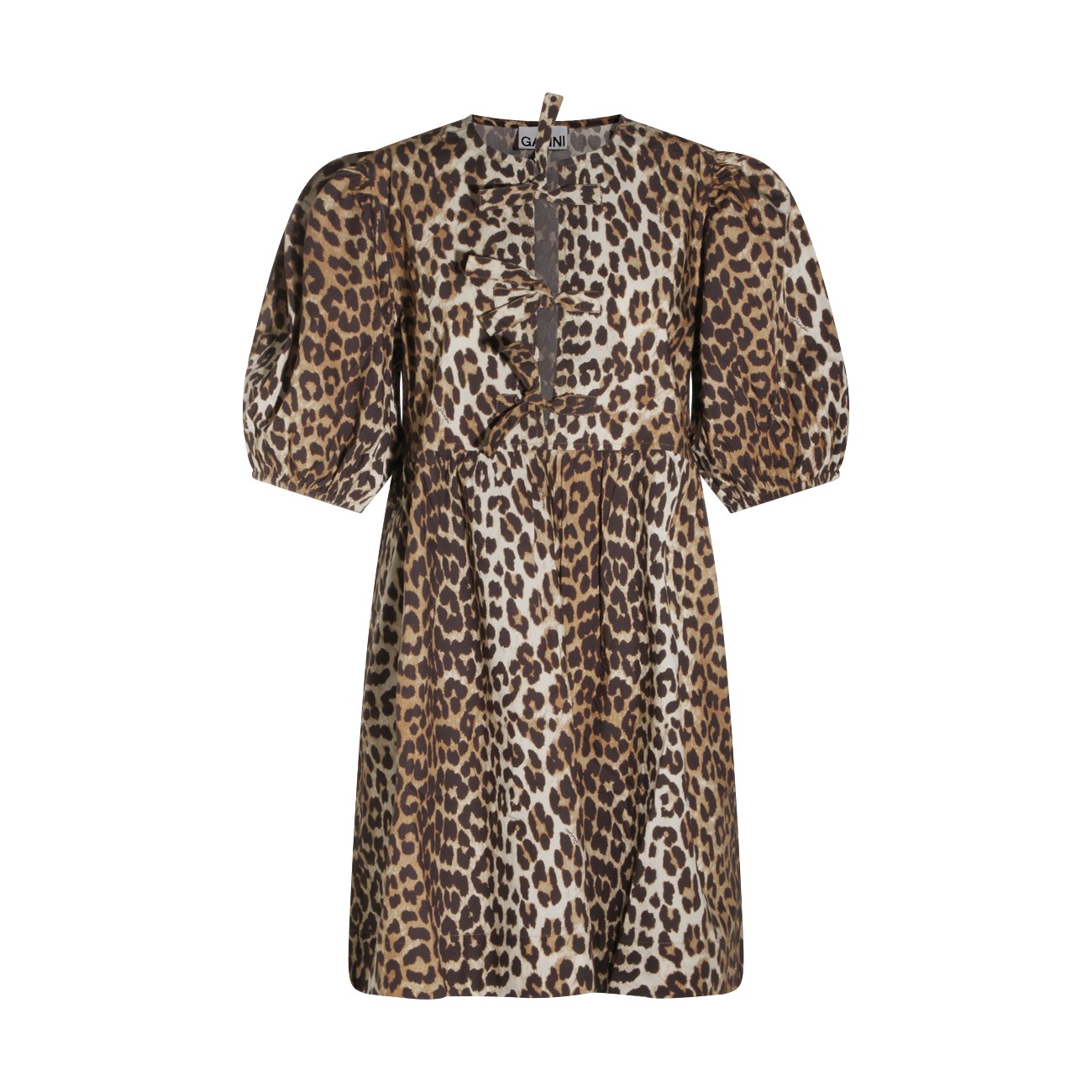 Leopard cotton dress from Ganni featurig crew neck, frontal bow details, mid length sleeves, soft vestibility and all over stamp.