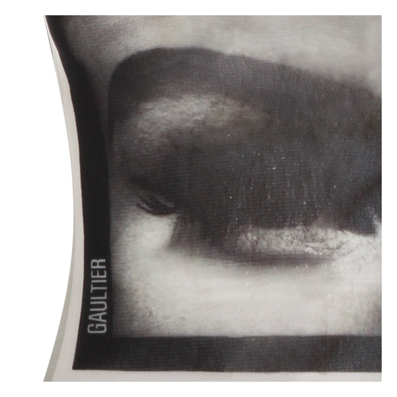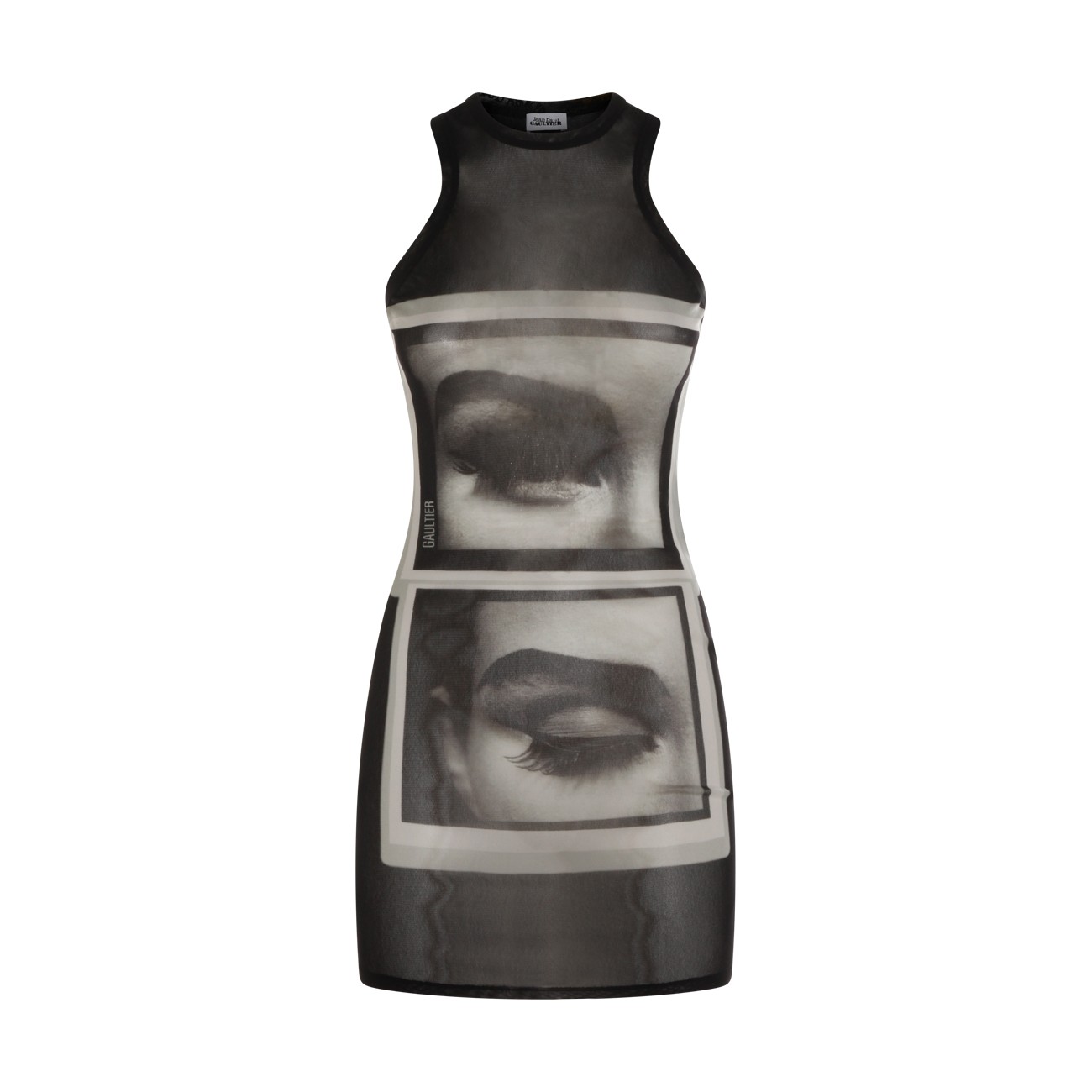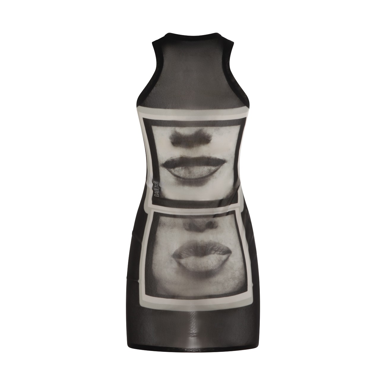 Black and white dress from Jean Paul Gaultier featuring sleeveless, midi length, stamp and slim vestibility.