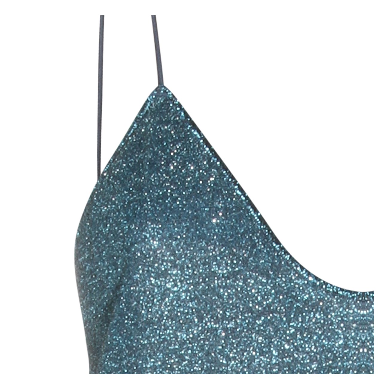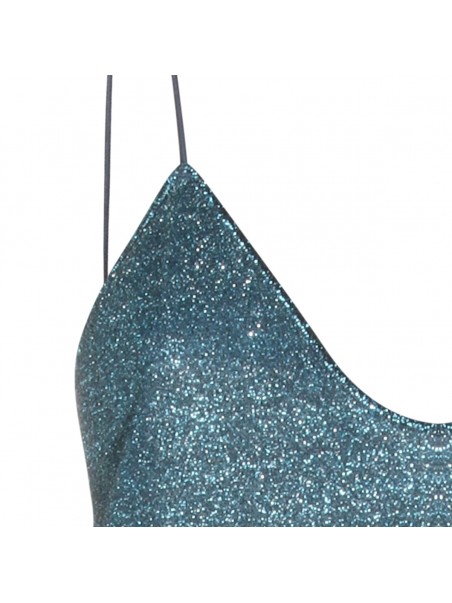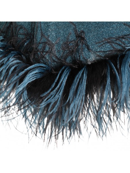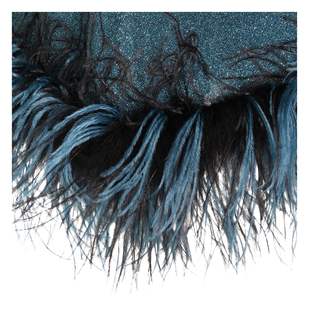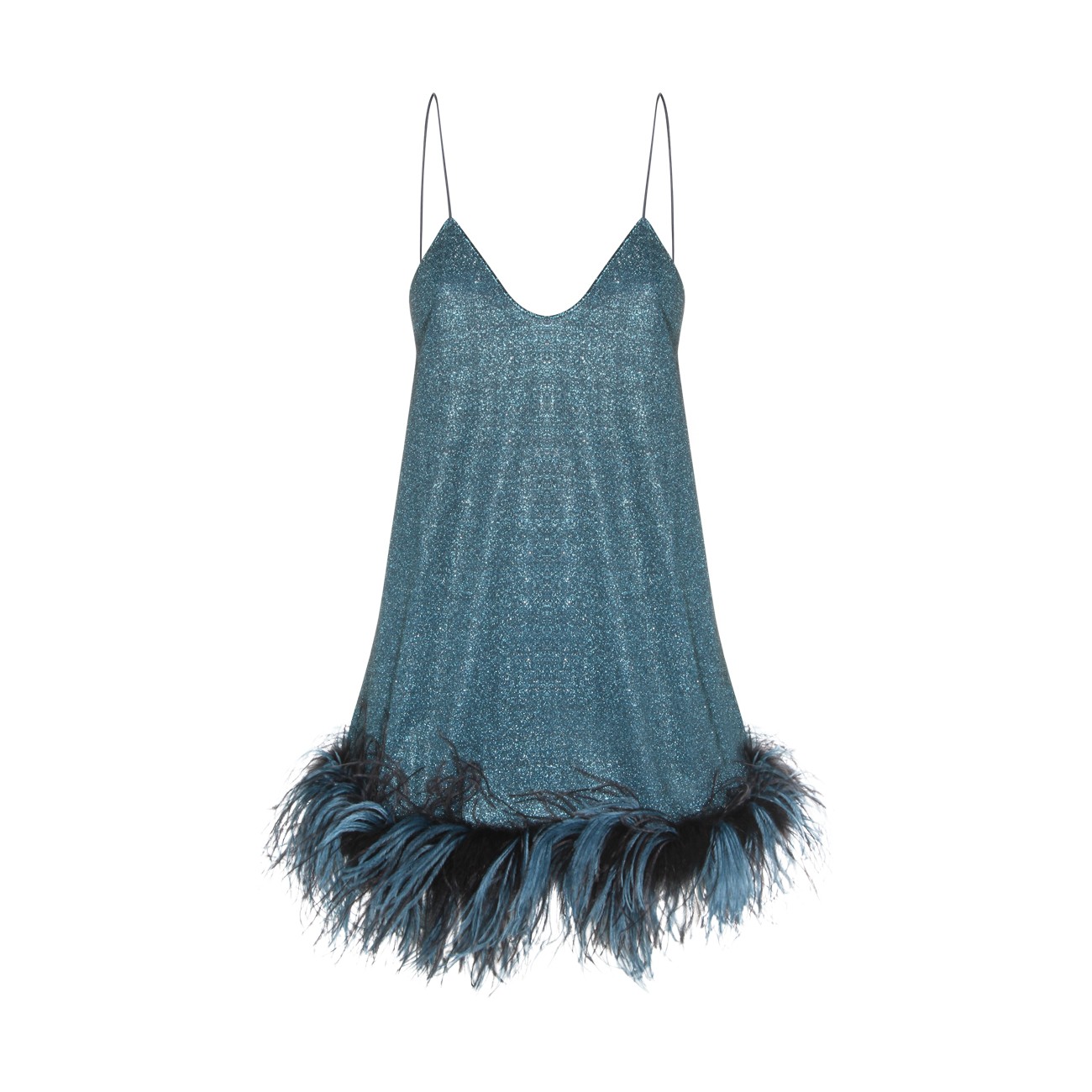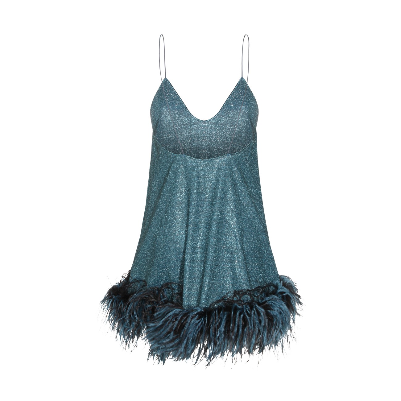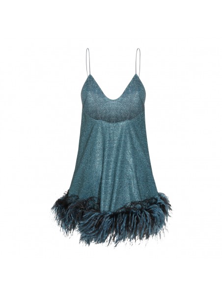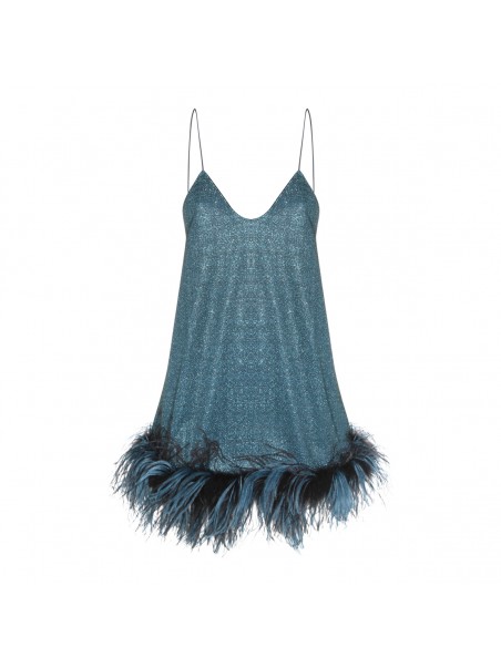 Turquoise dress from Oseree featuring V-neck, sleeveless, midi length and feathers detail.