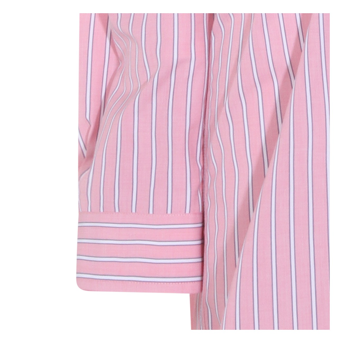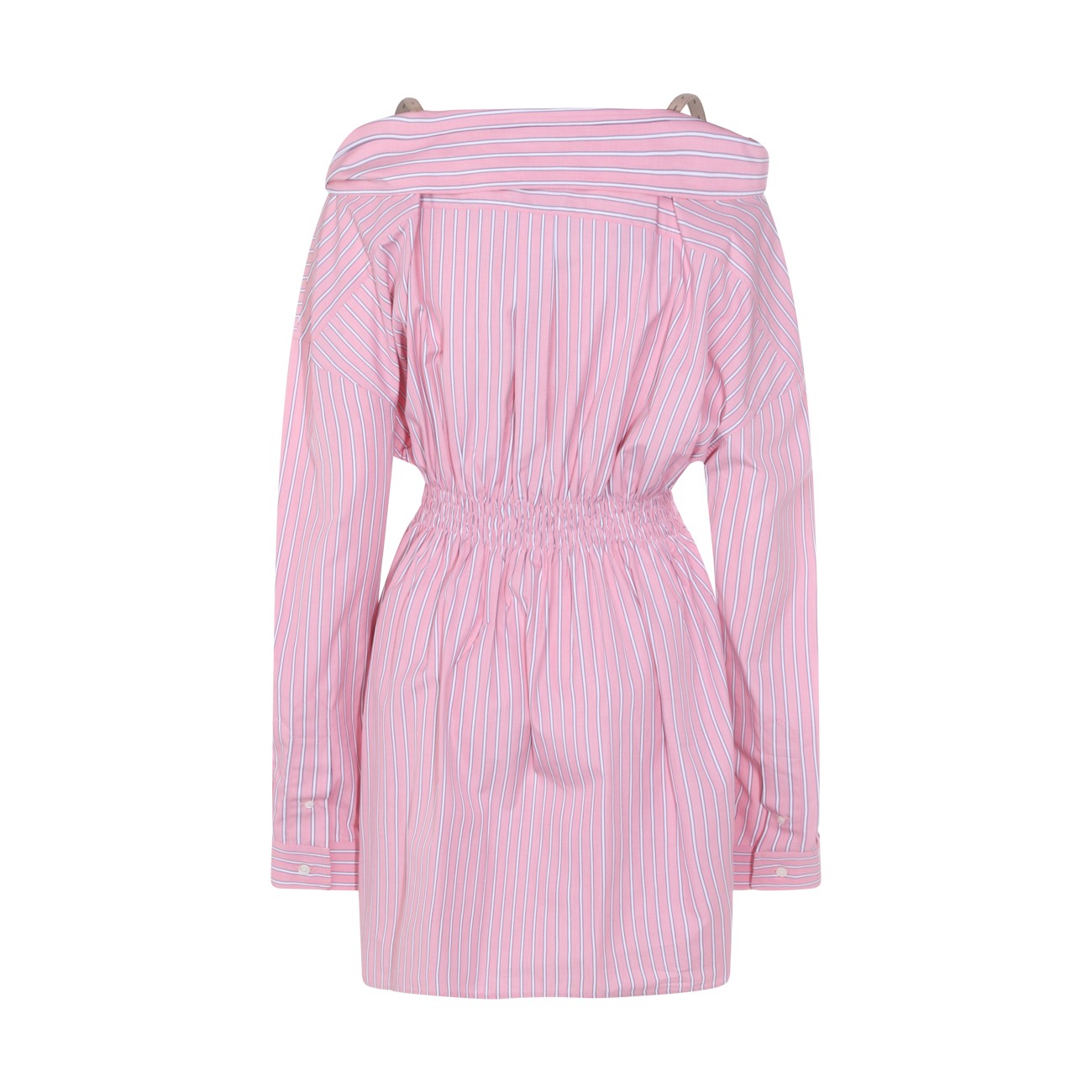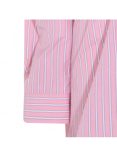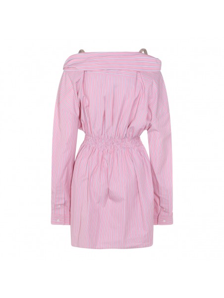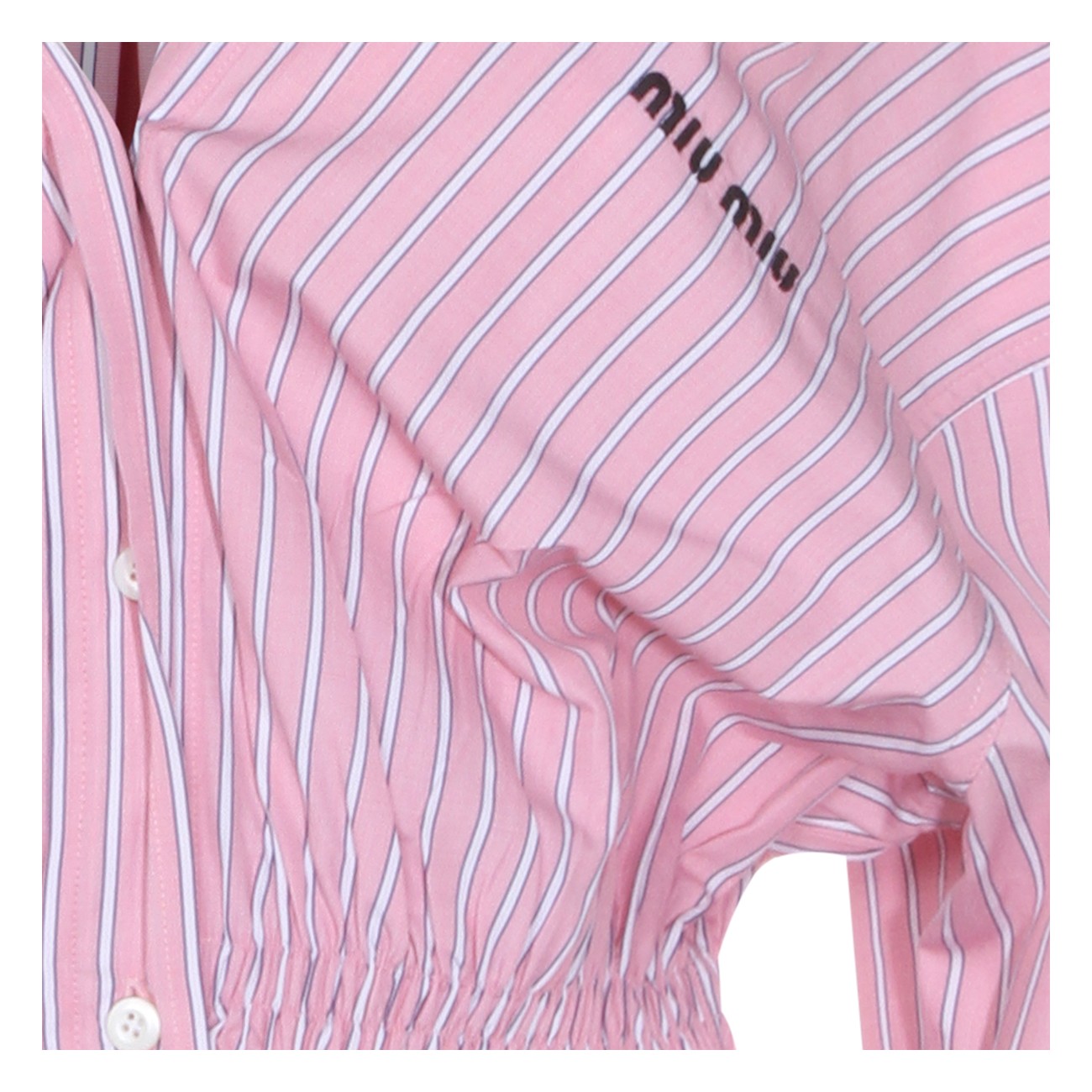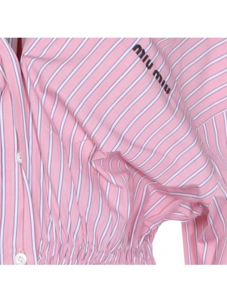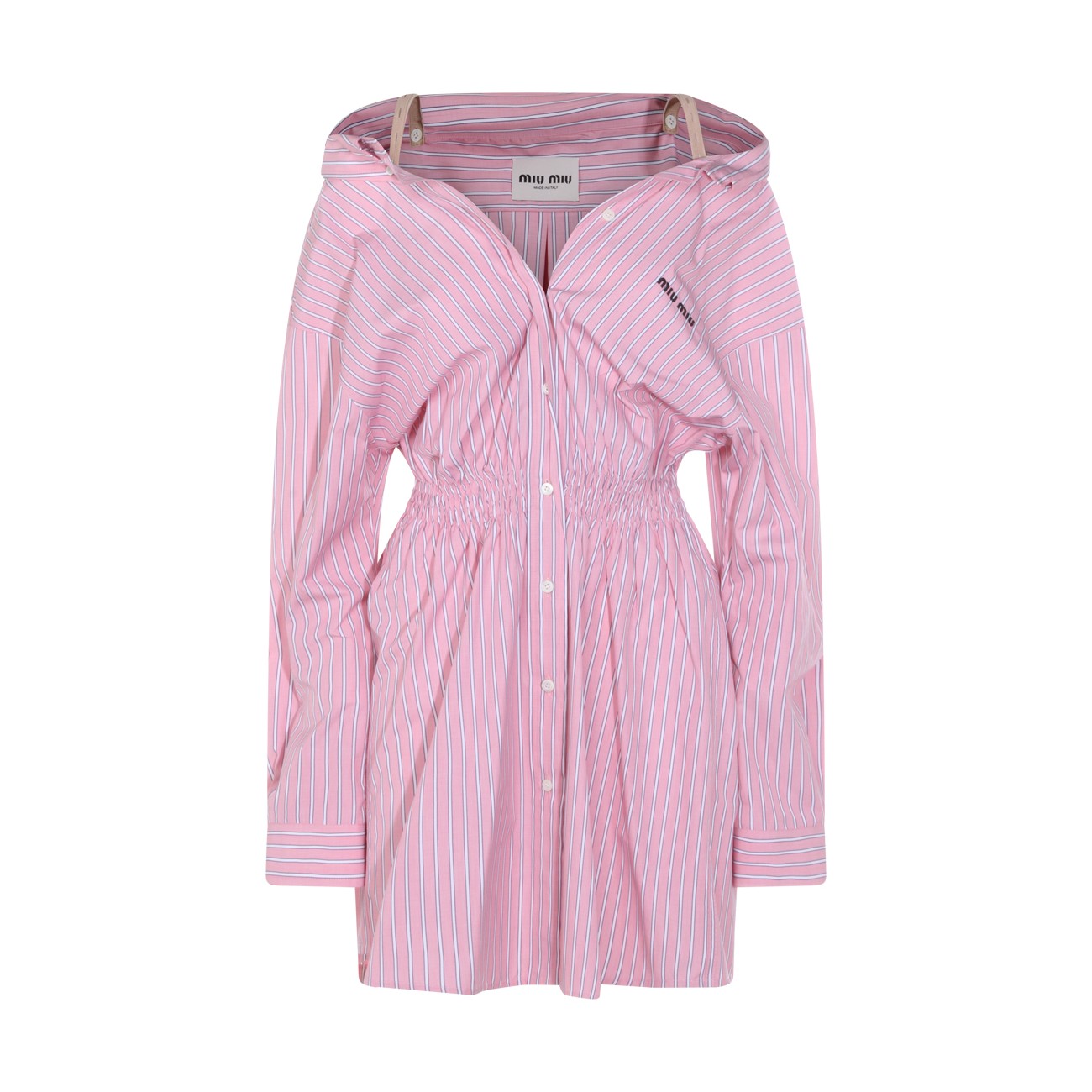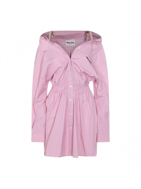 Pink cotton dress from Miu Miu featuring straps, long sleeves, V-neck, buttons fastening, elasticated waist, mid length, all over stripes and frontal logo.