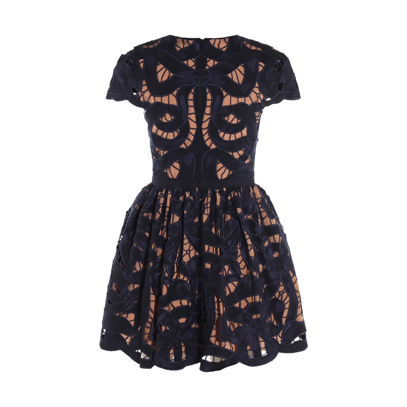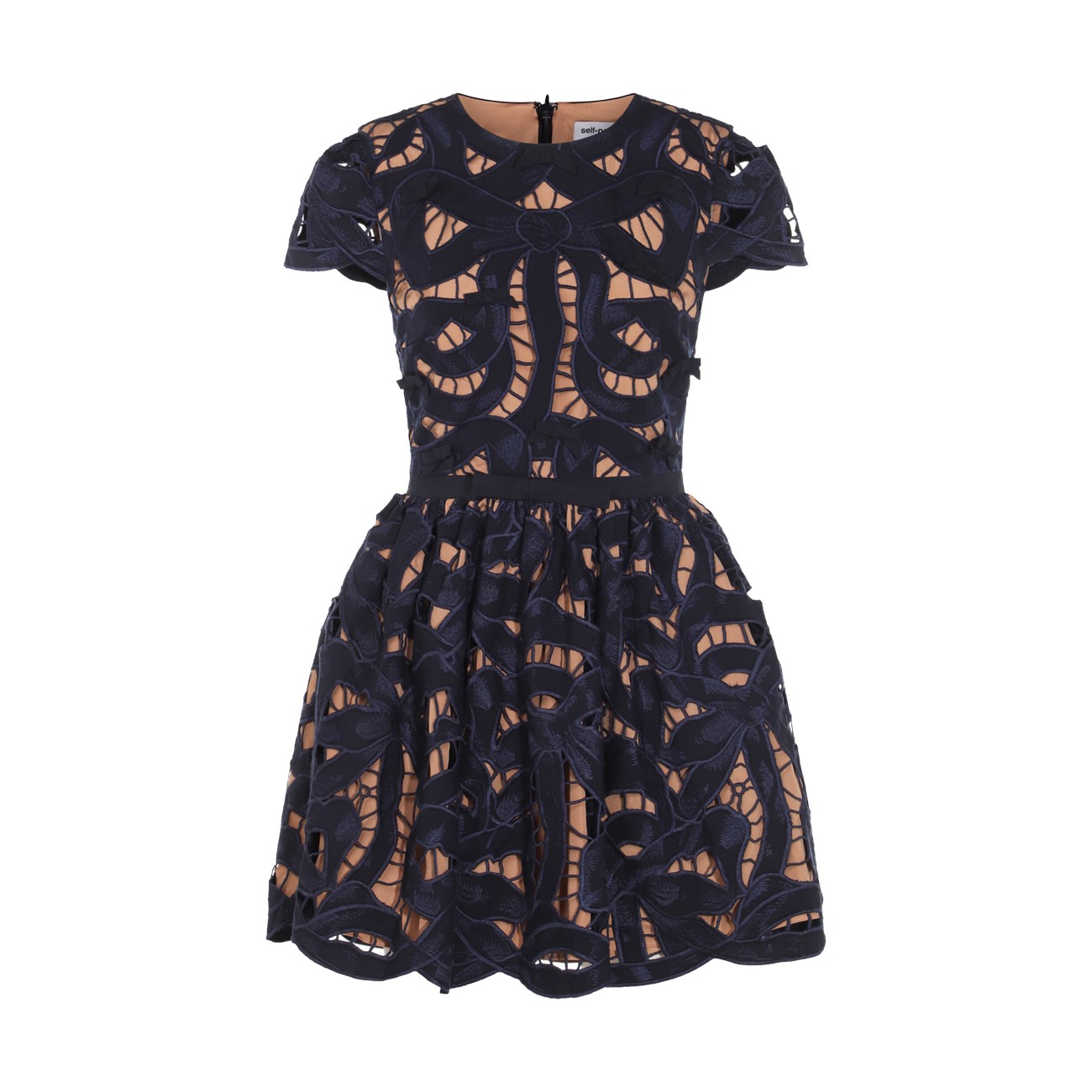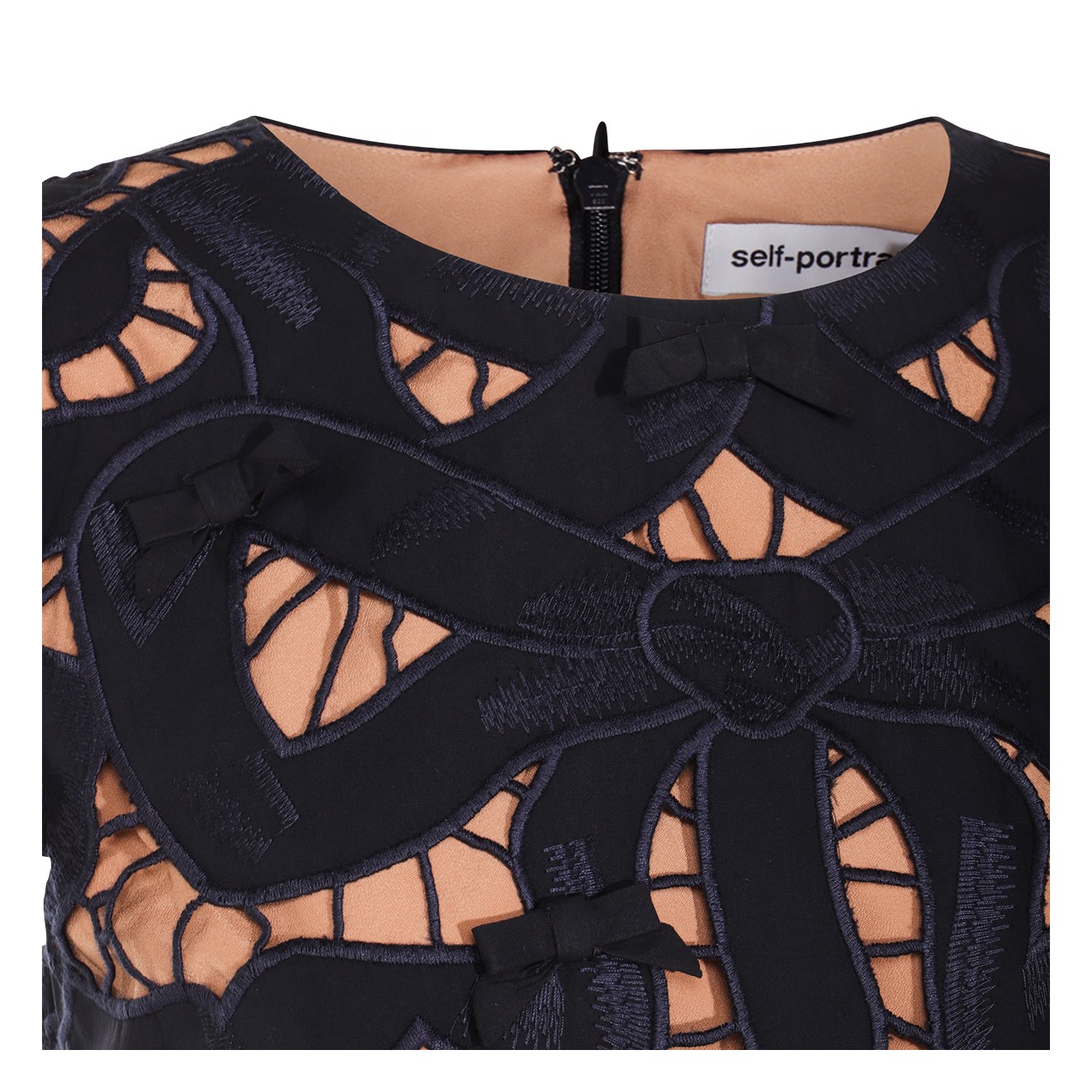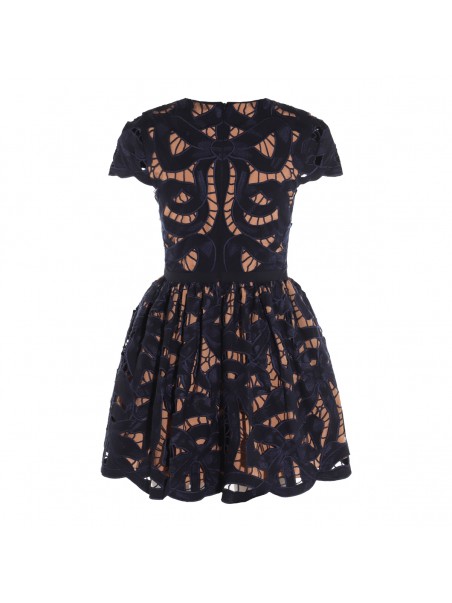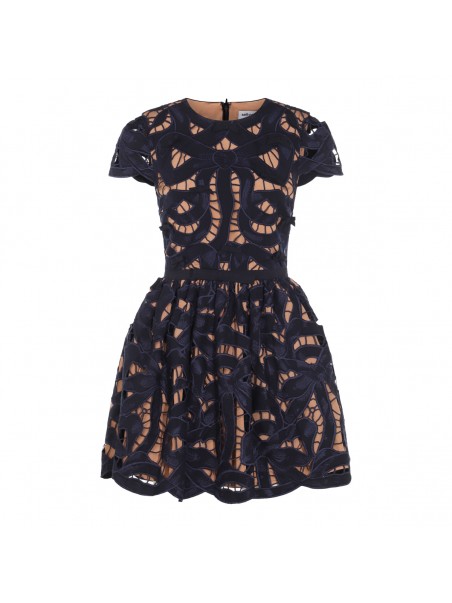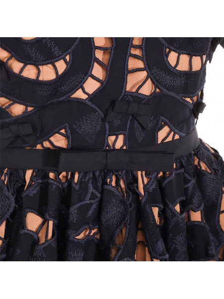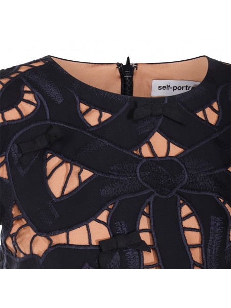 Black and beige cotton dress from Self-Portrait featuring round collar, mini length, short sleeves and laces.
