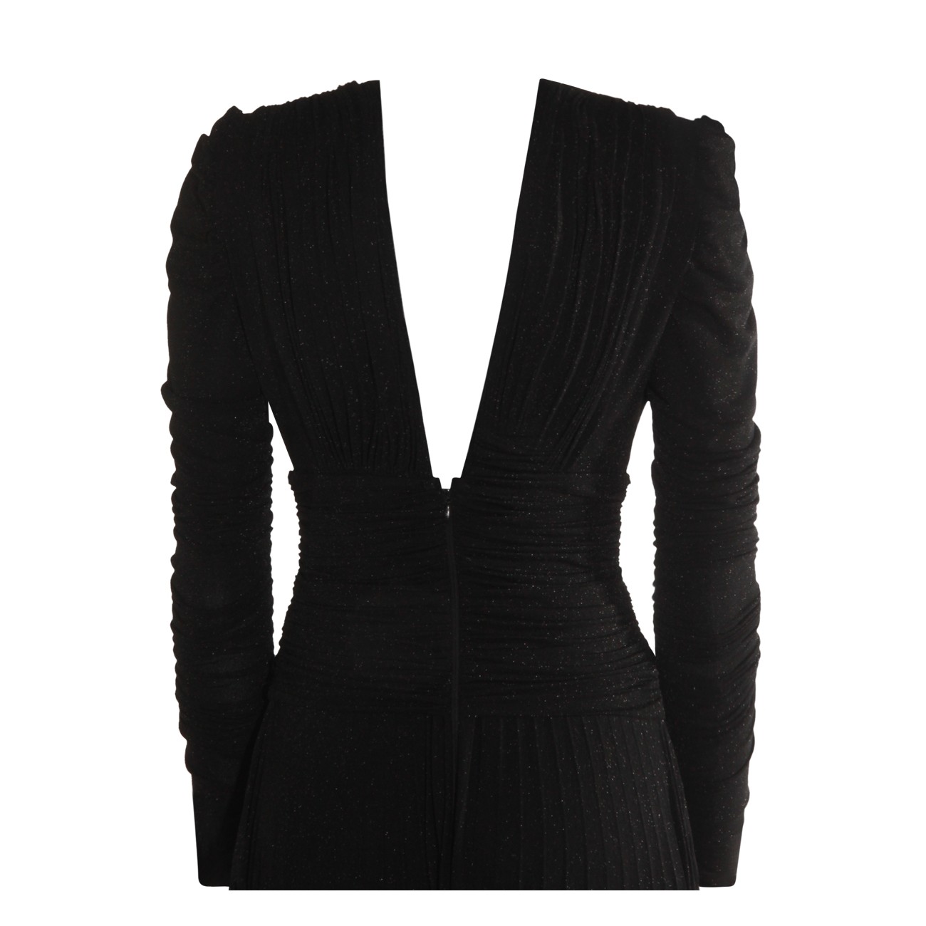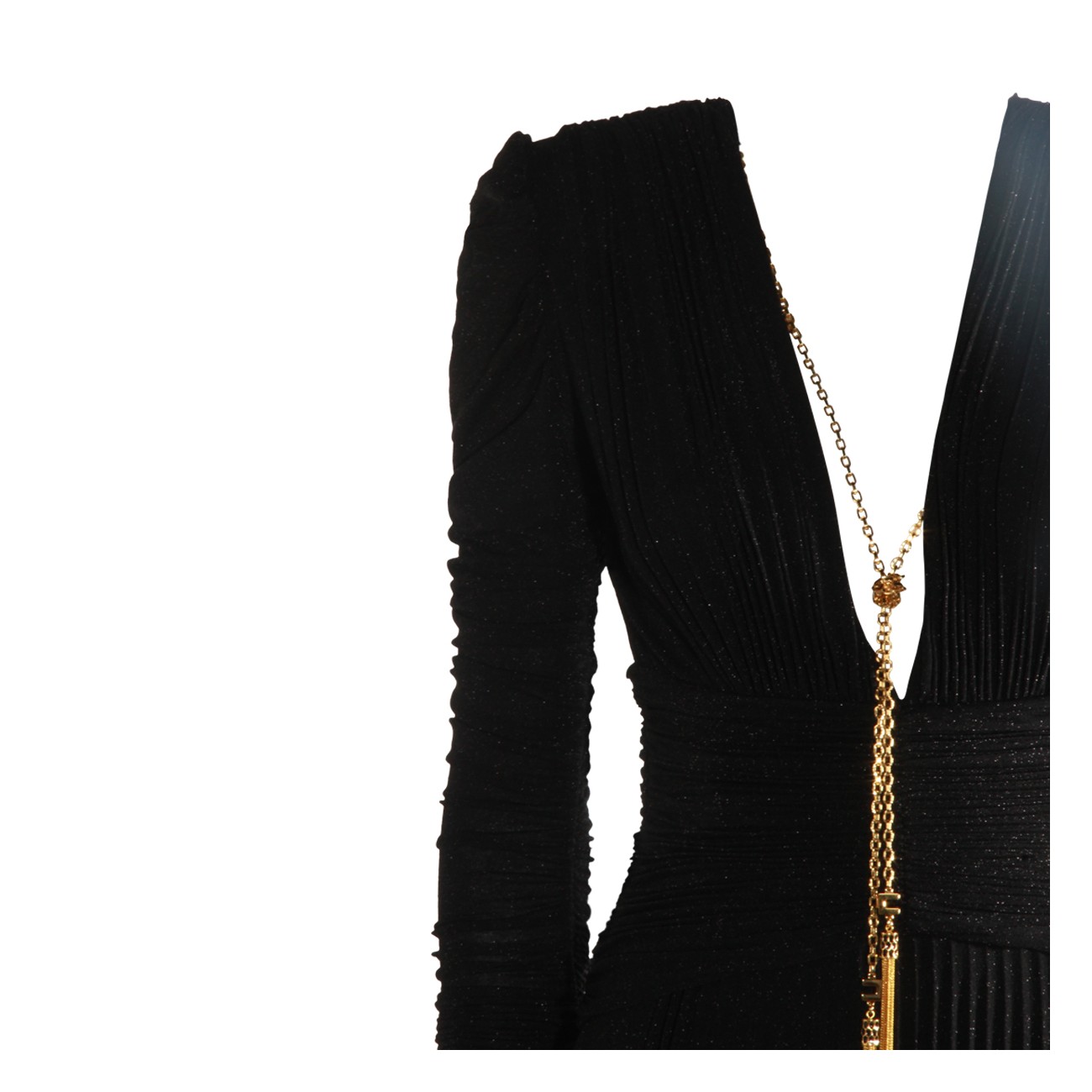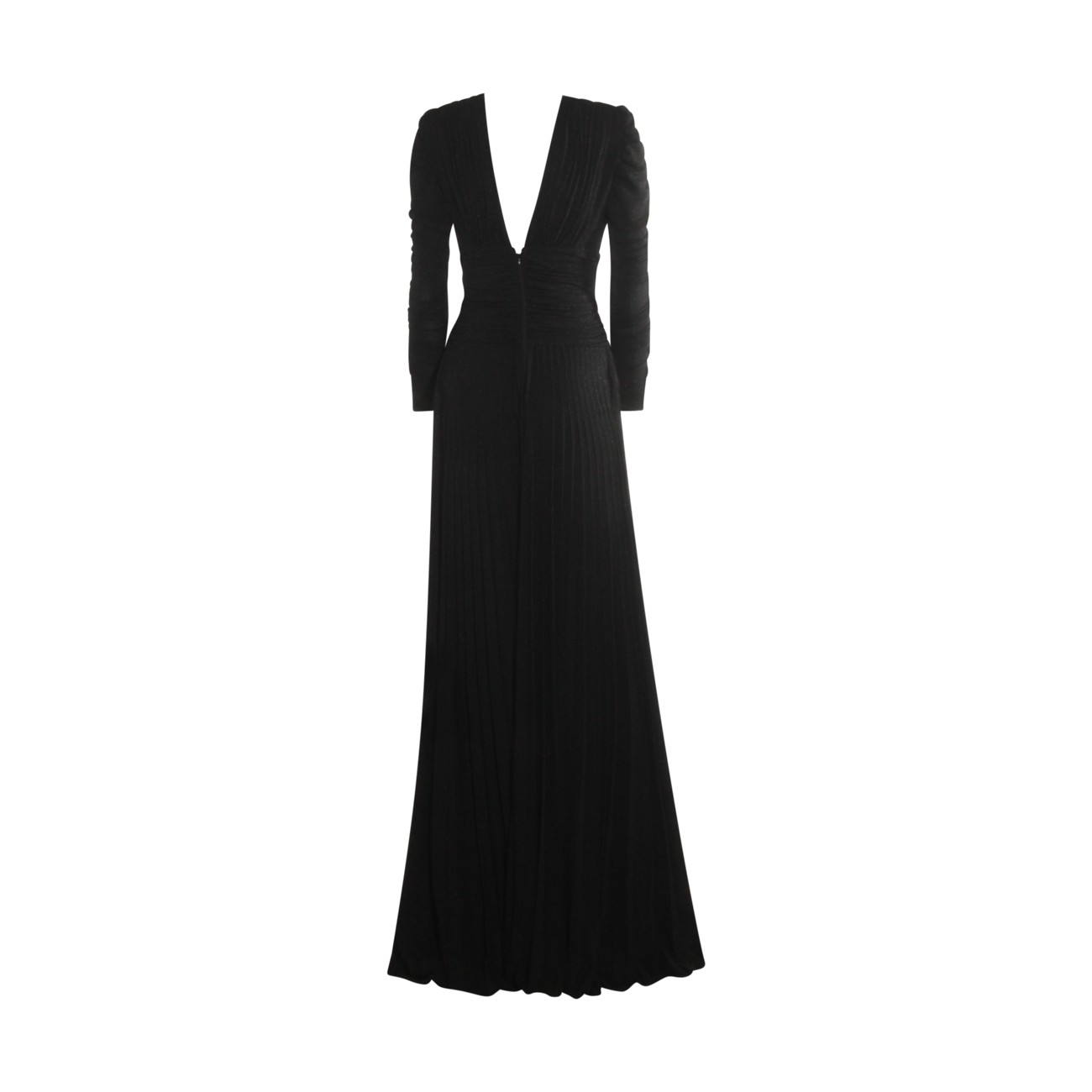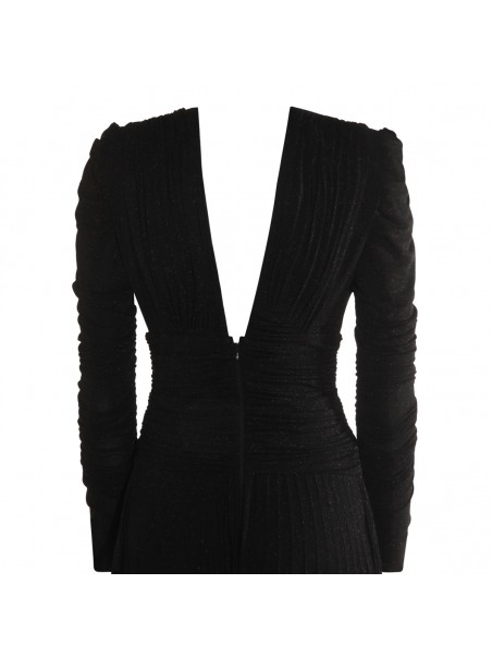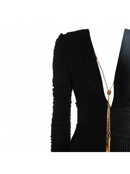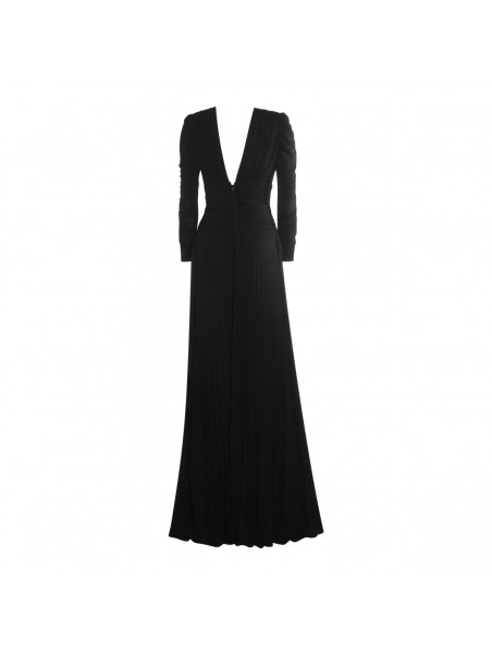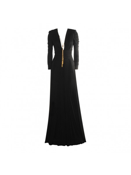 Black dress from Elisabetta Franchi featuring v neckline, open back, gold tone hardware, long sleeves, rear zip fastening and long lenght.