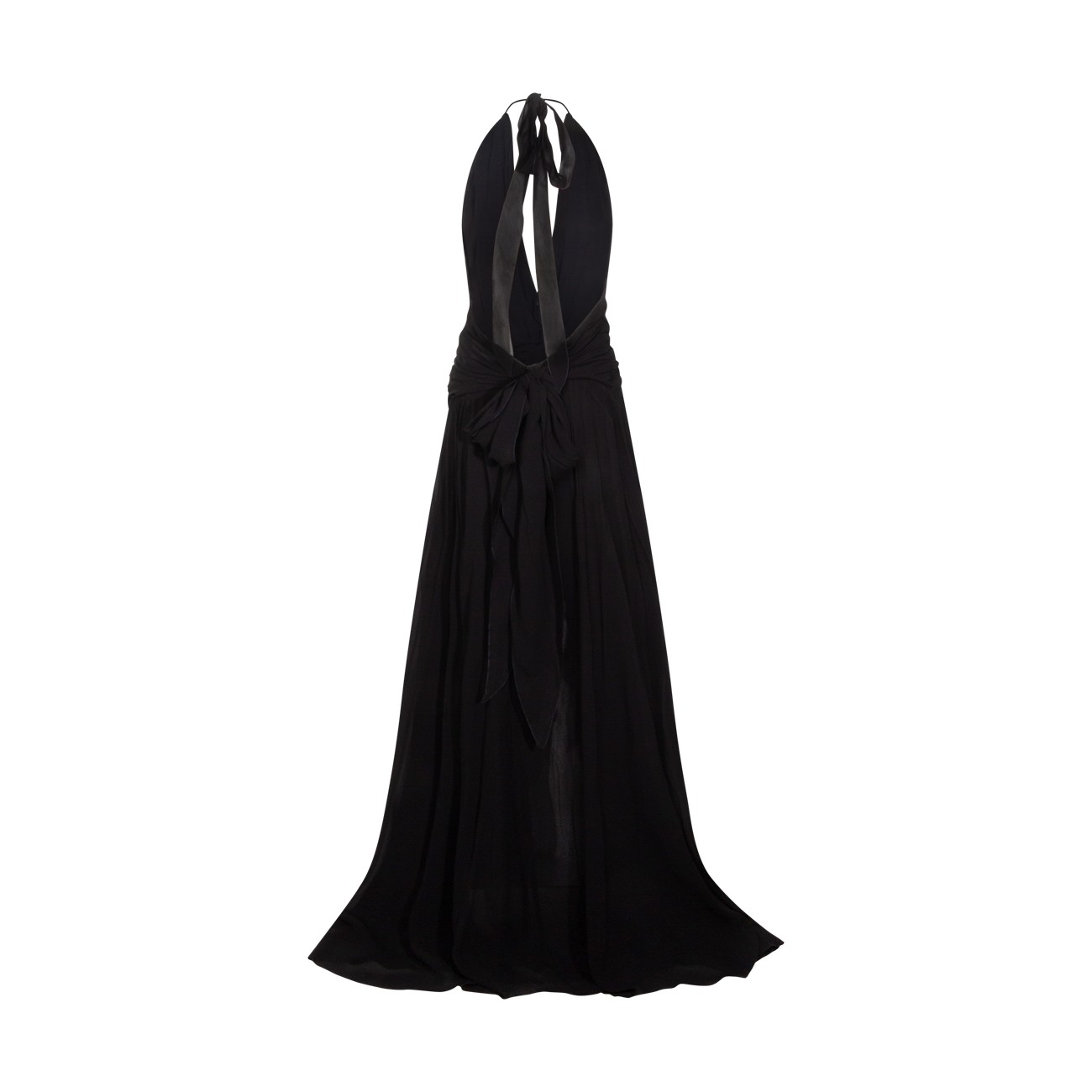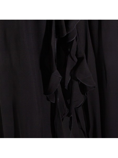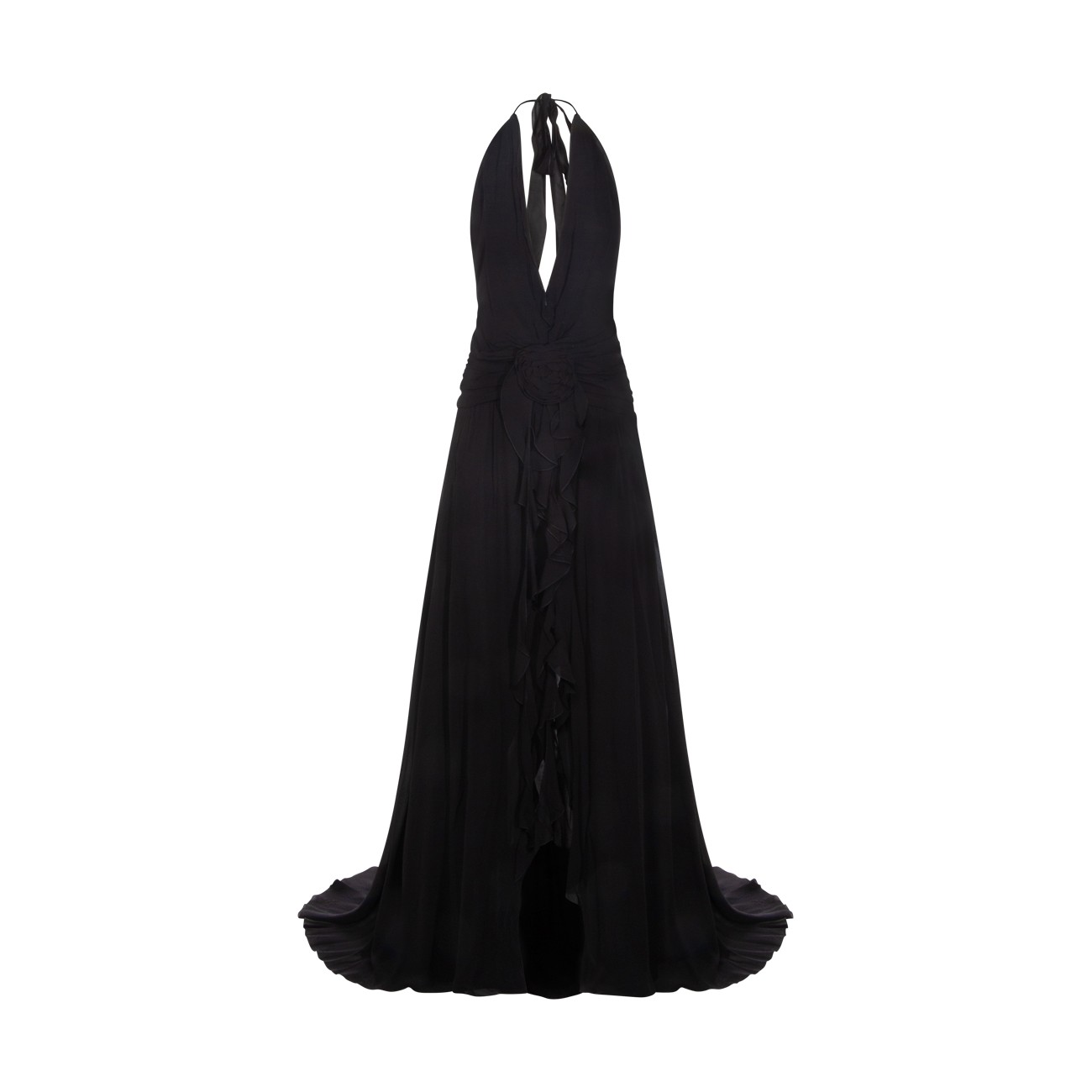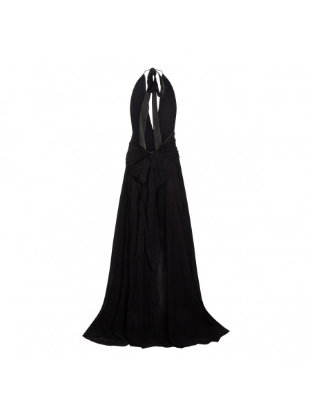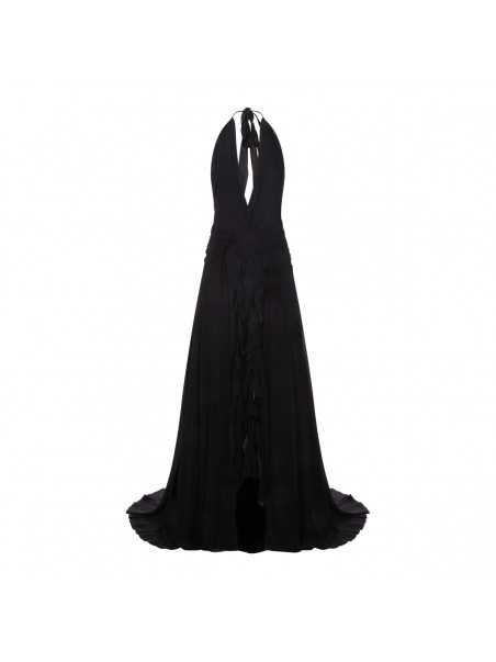 Black viscose dress from Blumarine featuring halter neckline with ruffles, sleeveless, hand-made rose, ruffled sashes, front slit, back deep neckline, floor length and regular vestibility.