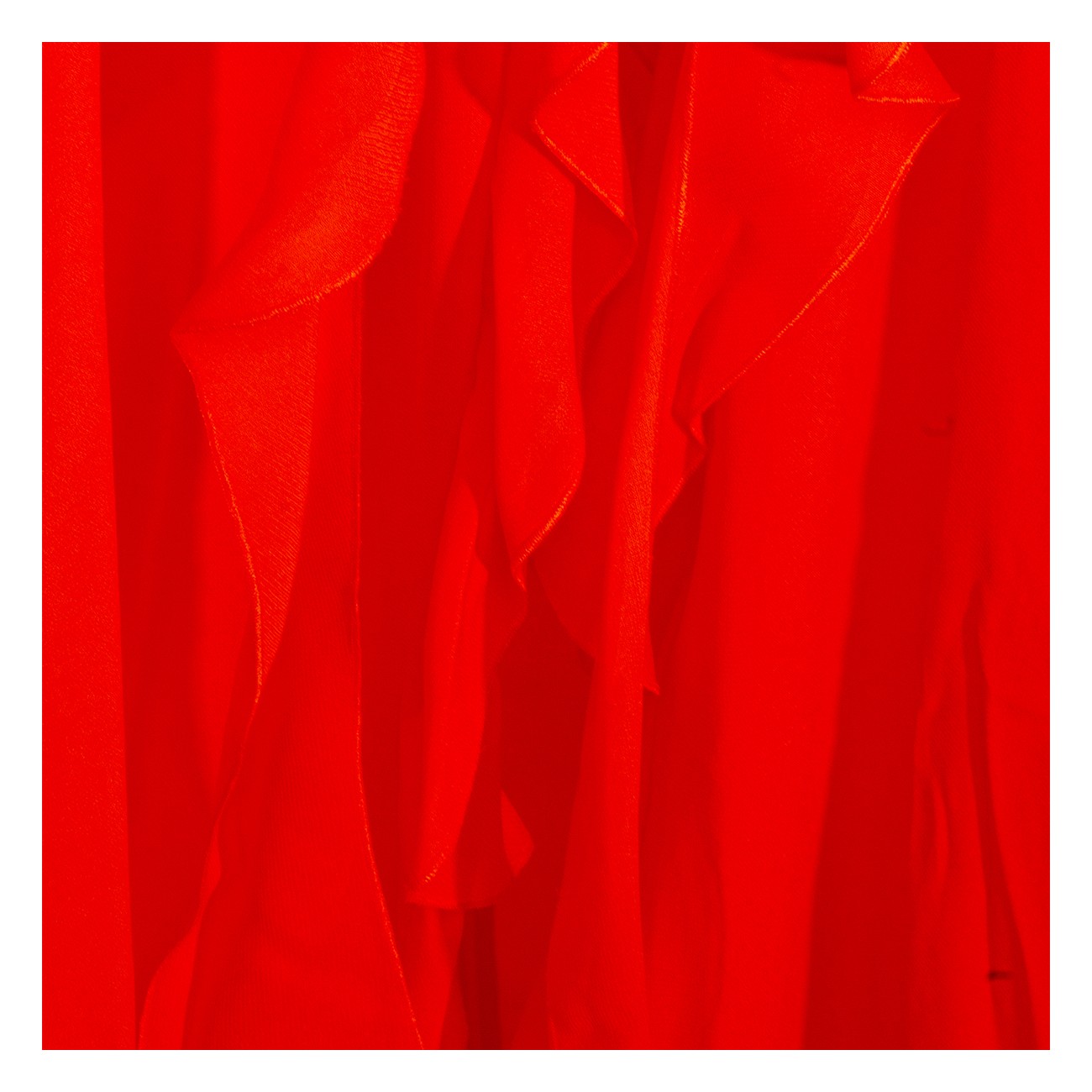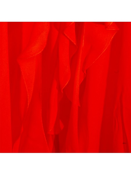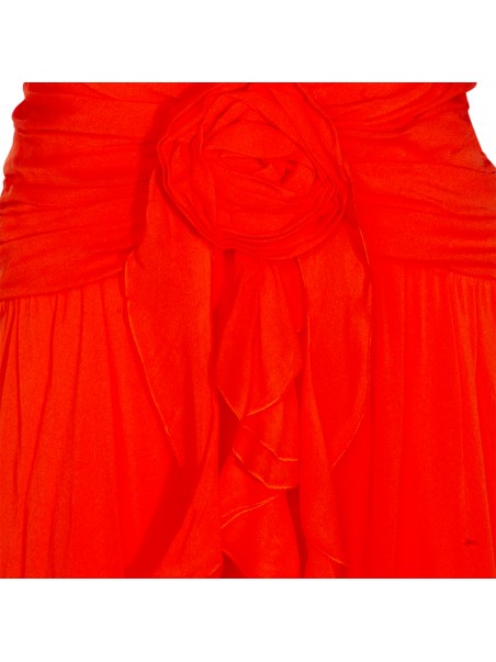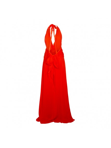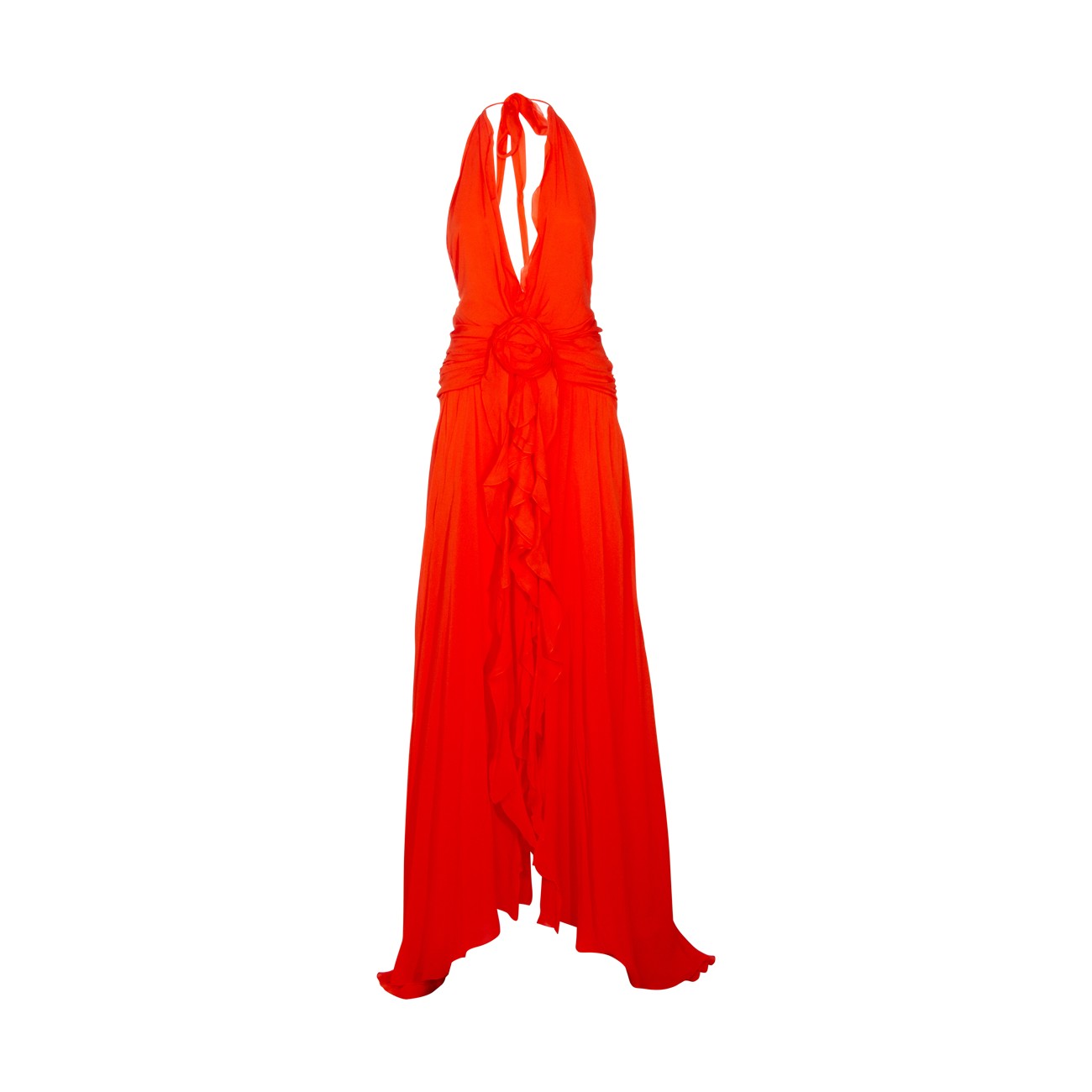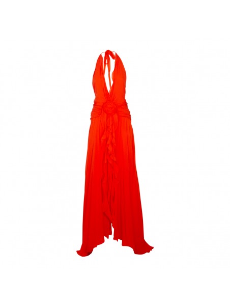 Orange viscose dress from Blumarine featuring halter neckline with ruffles, sleeveless, hand-made rose, ruffled sashes, front slit, back deep neckline, floor length and regular vestibility.