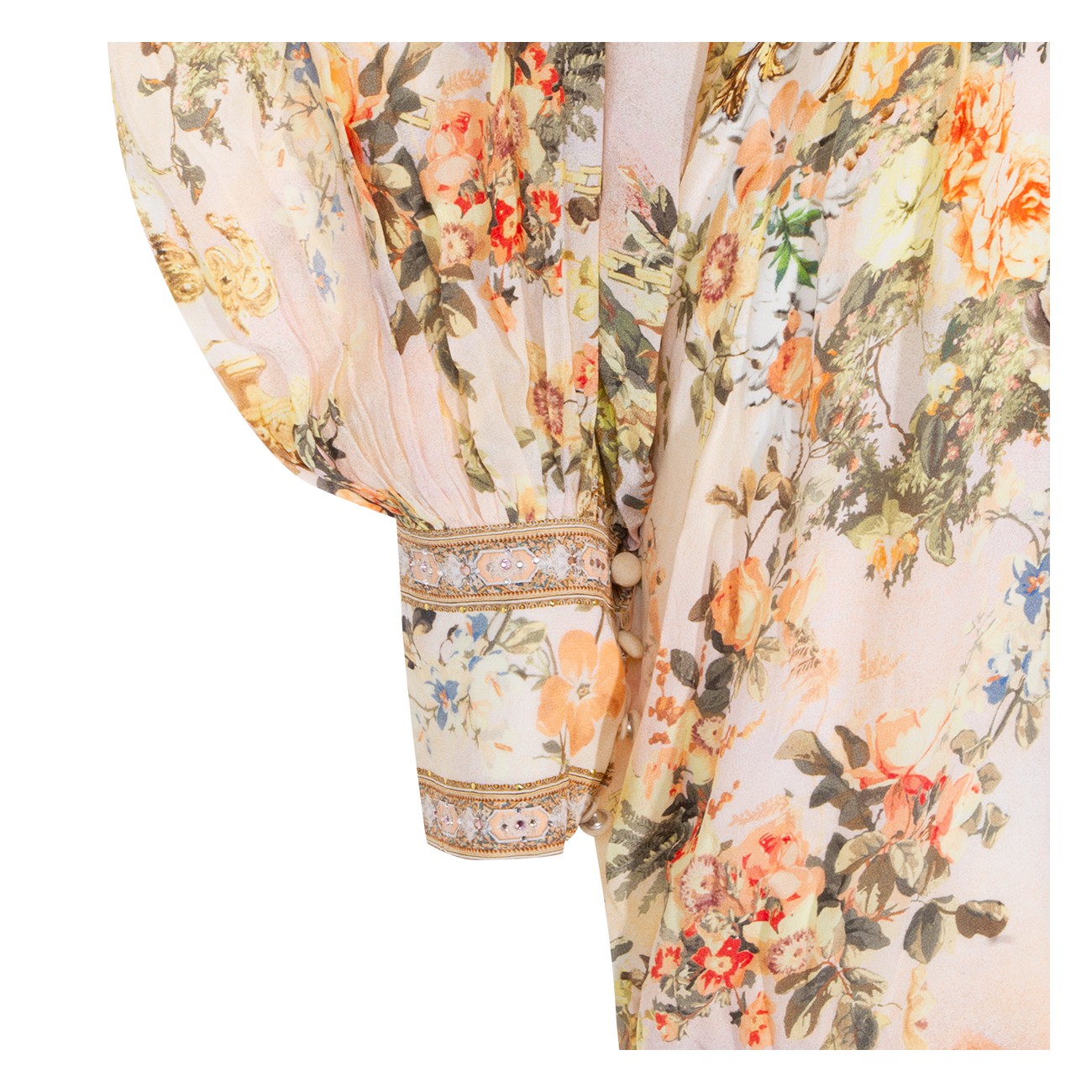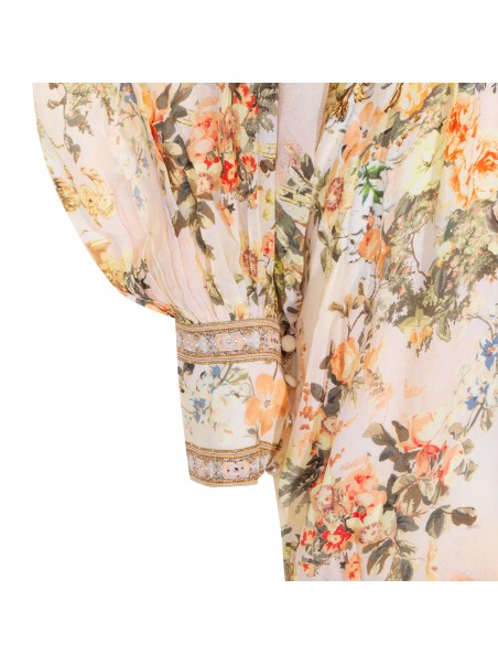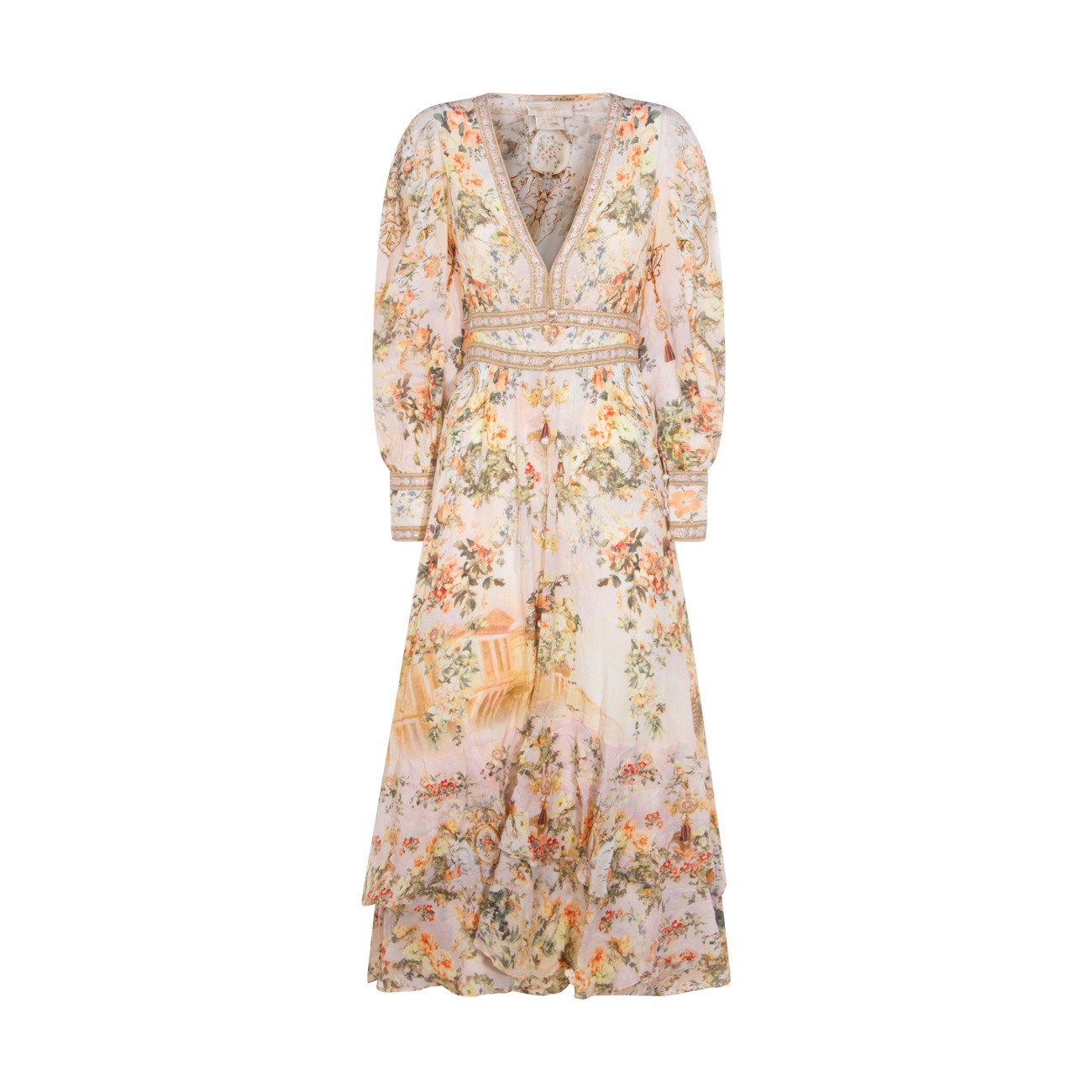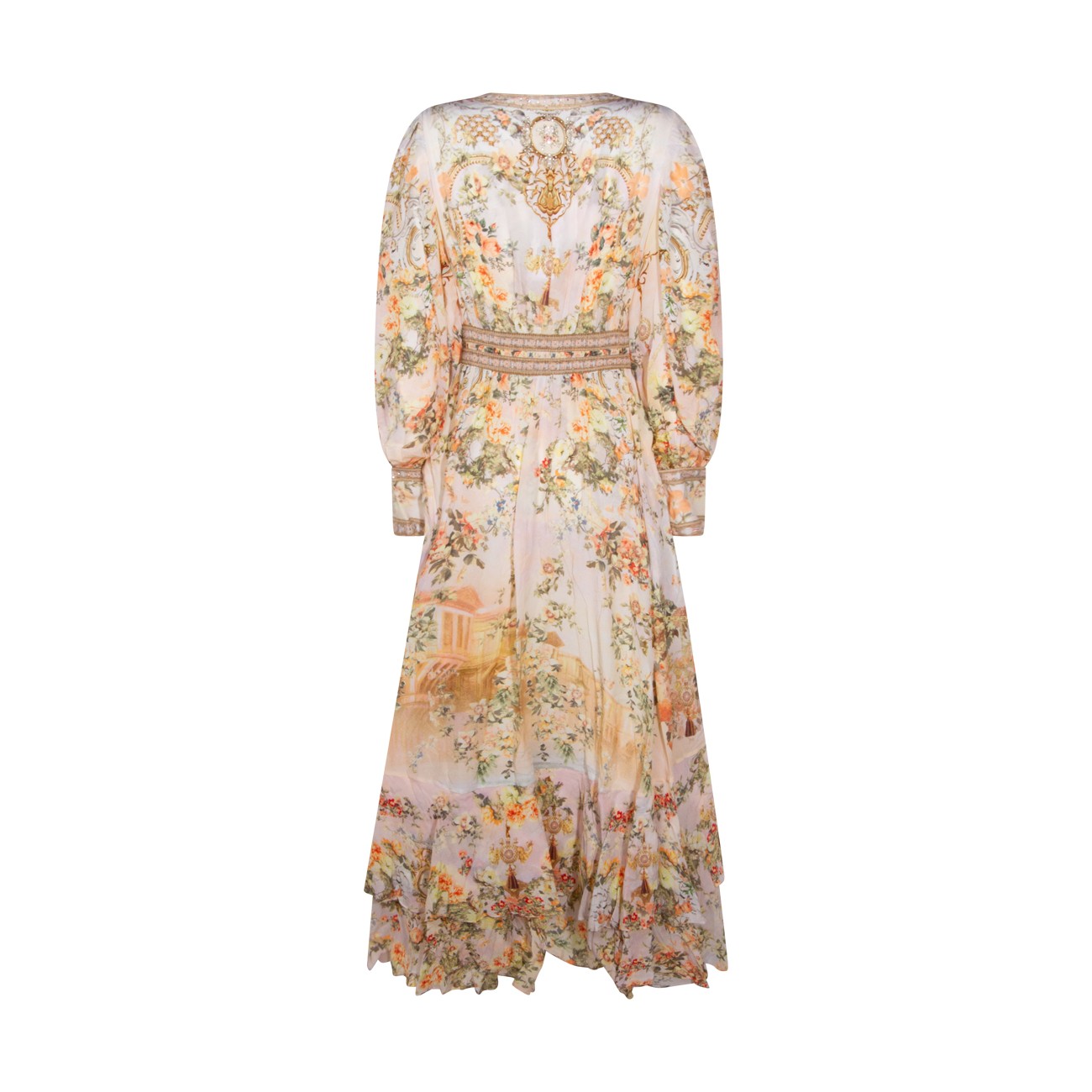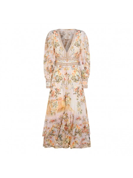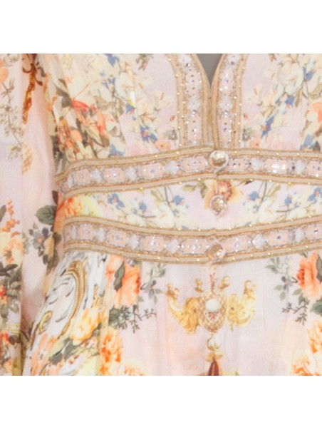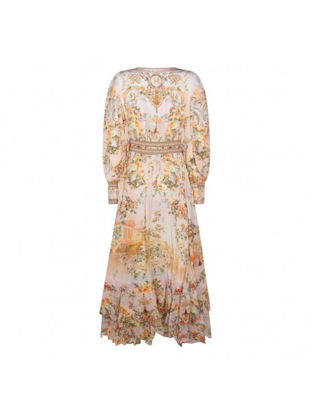 Cream dress from Camilla featuring V-neck, long sleeves, double ruffle hem, shaped waistband with elastic back, all over stamp, crystal embellisments and oversize vestibility.