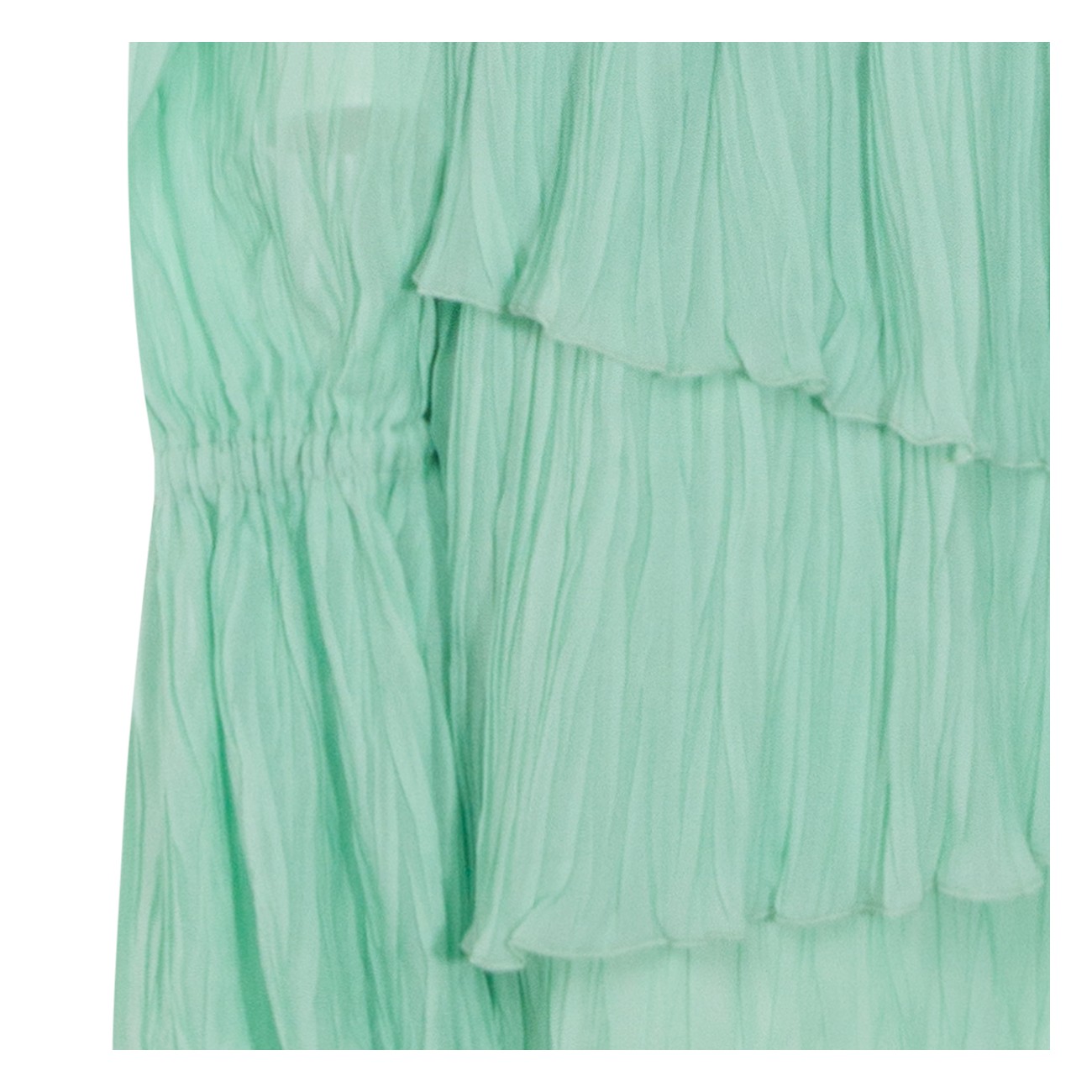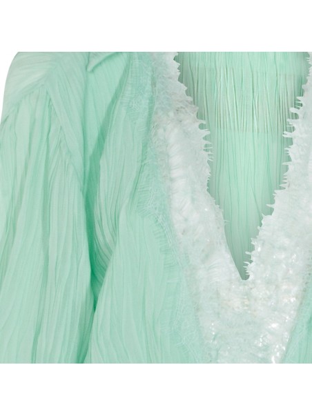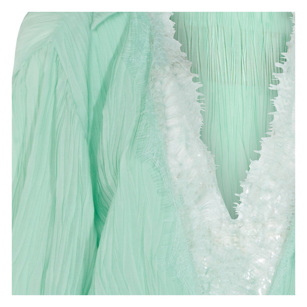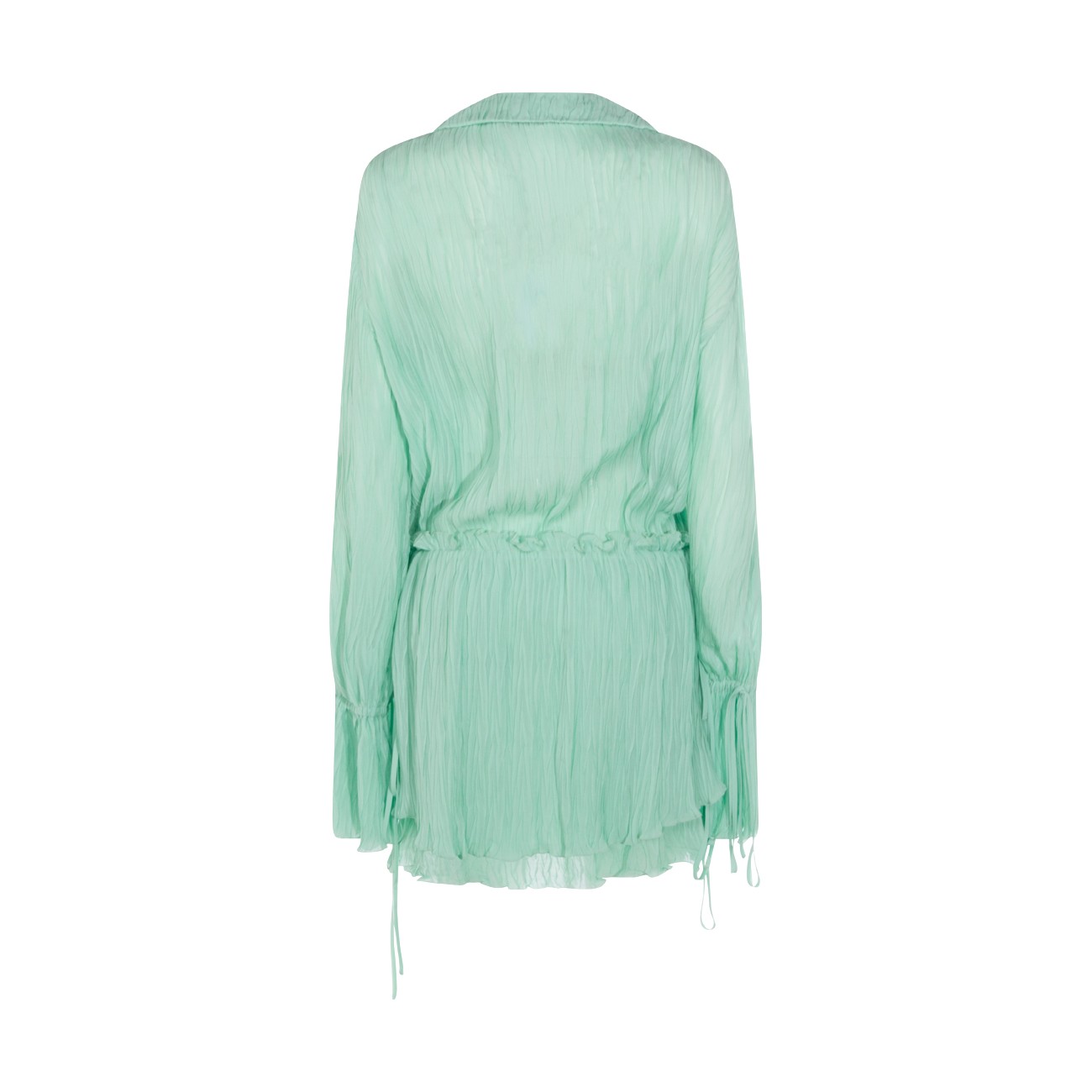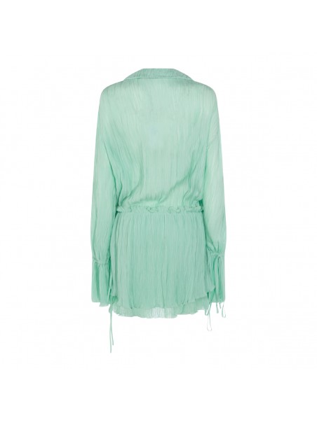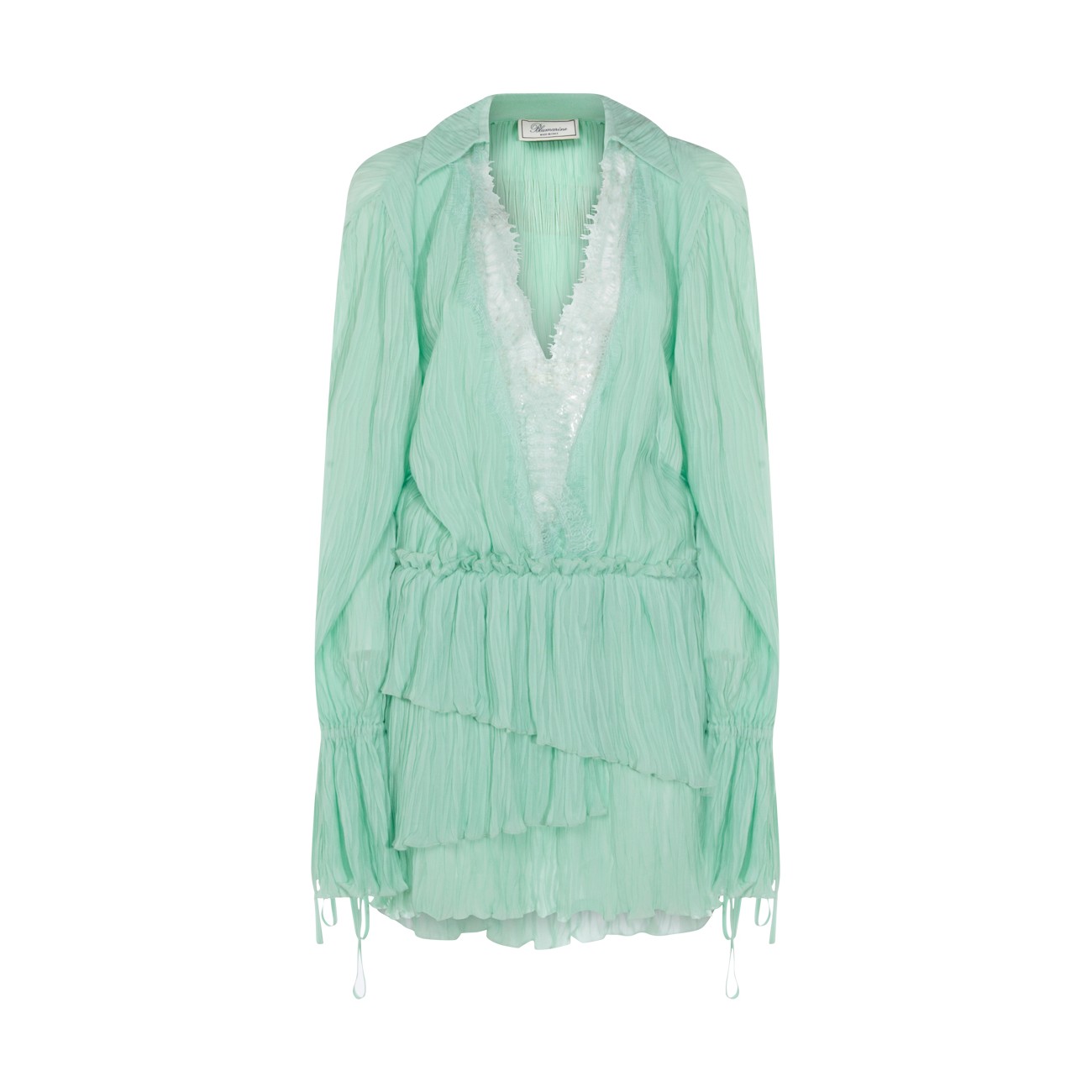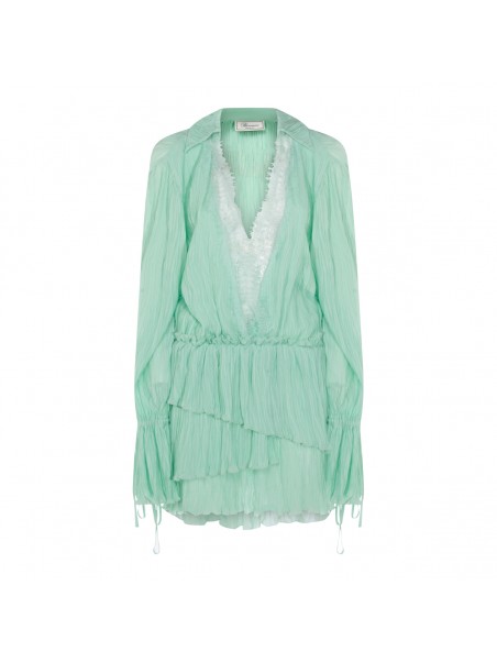 Light green viscose dress from Blumarine featuring shirt collar, V-neckline with chantilly lace insert, long sleeves, free volants, ruffles and flounces at the waist, short length and regular fit.