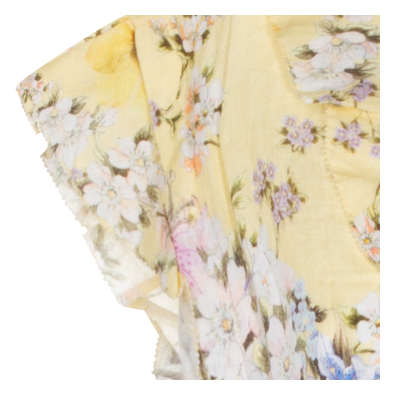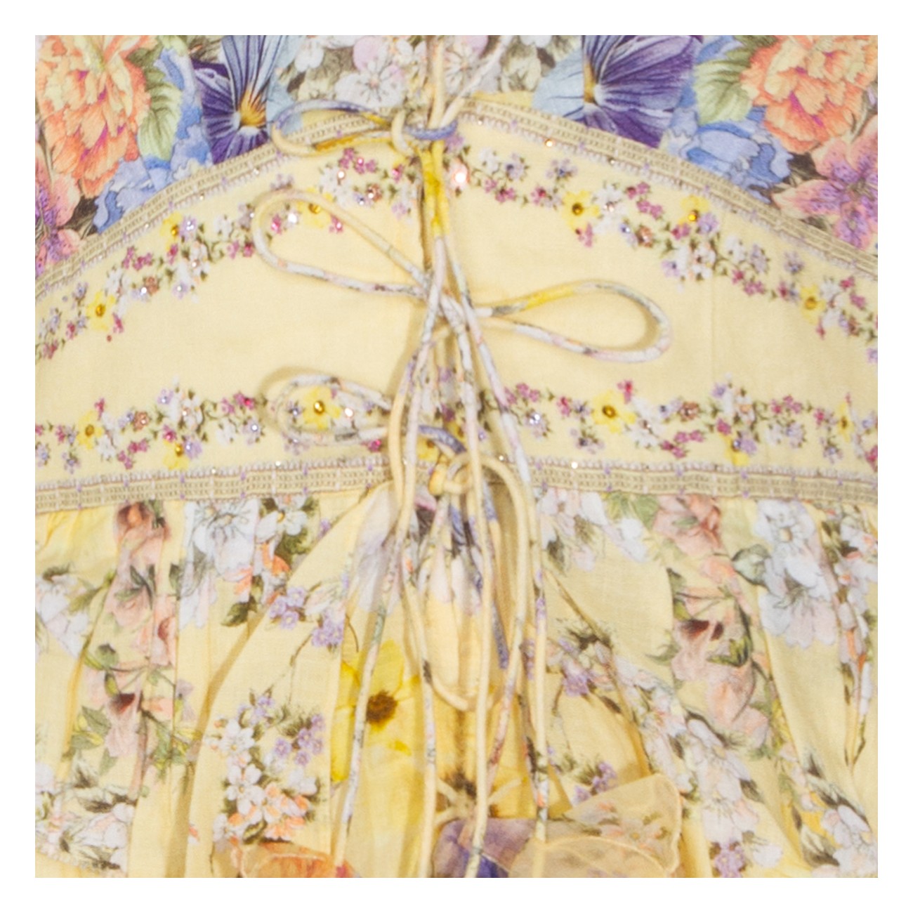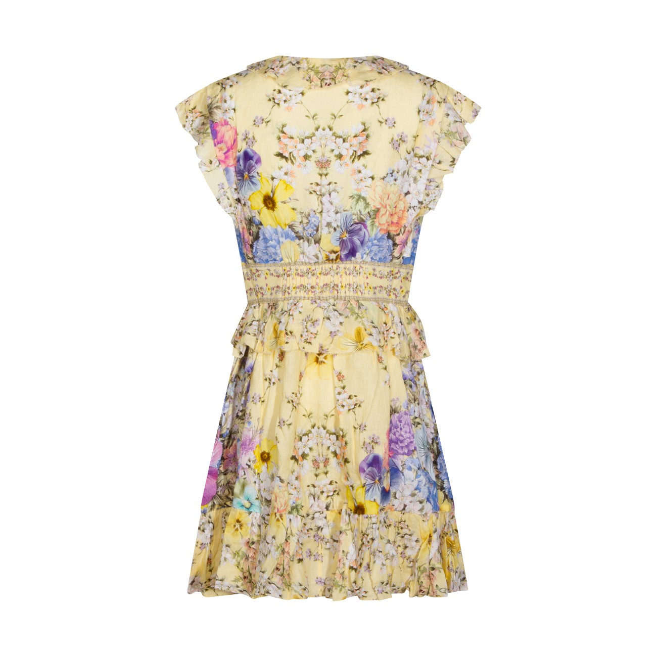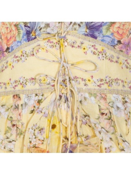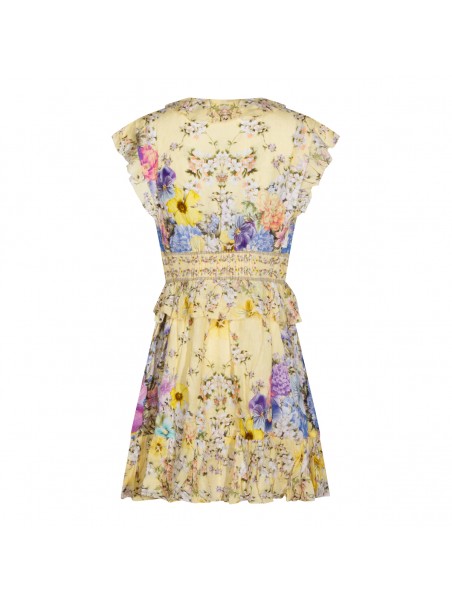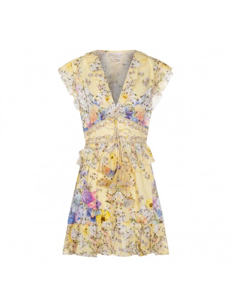 Yellow dress from Camilla featuring V-neckline, sleeveless, button and tie front closure, shaped waistband, waist and sleeves ruffle details, 3D flower detail, all over stamp, crystal embellishment and short length.