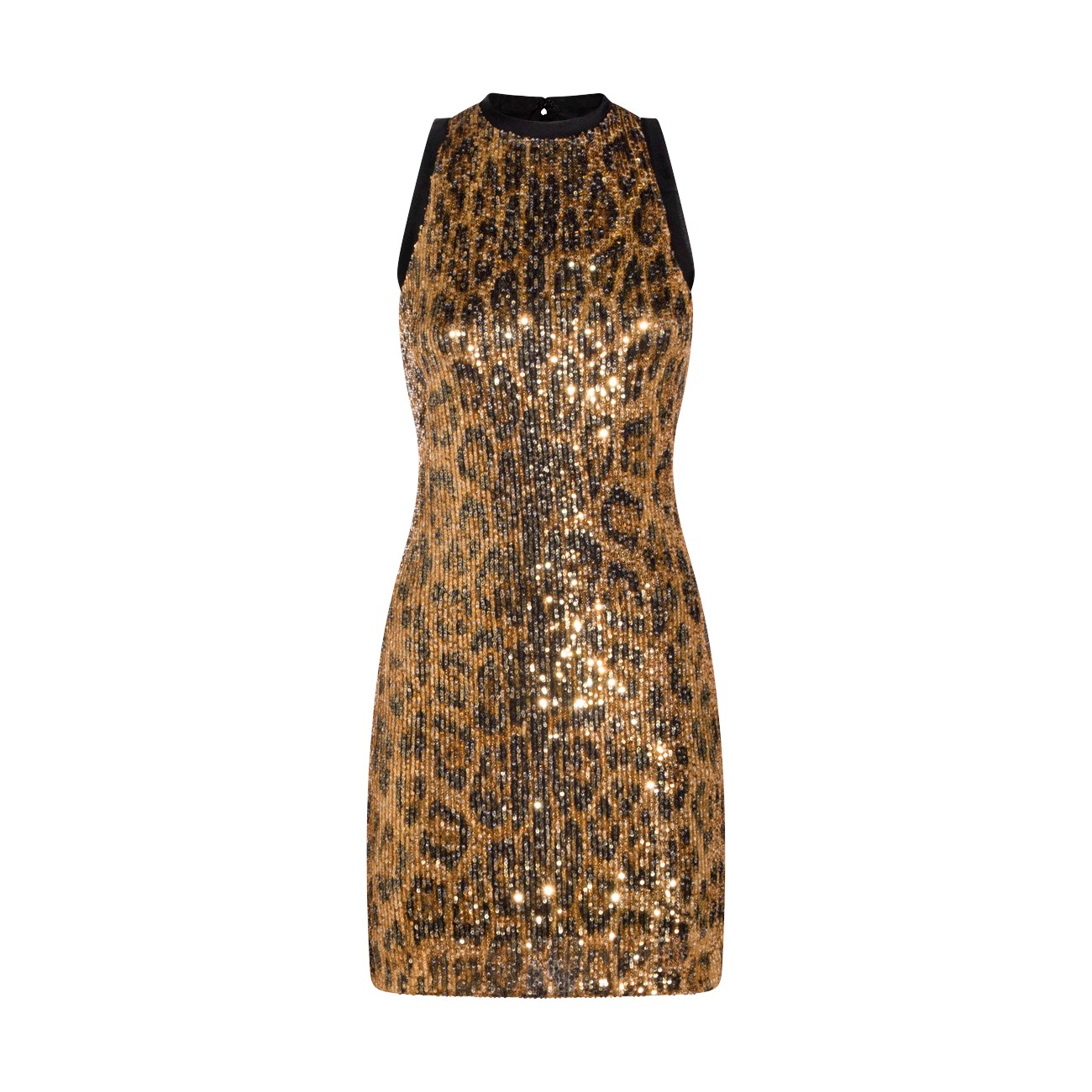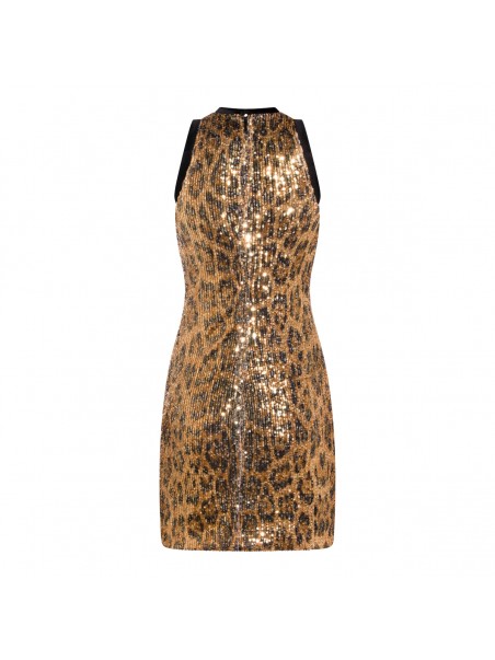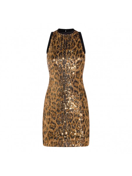 Leopard dress from Roberto Cavalli featuring crew neck, sleeveless, mini length, all over sequins decoration and regular vestibility.