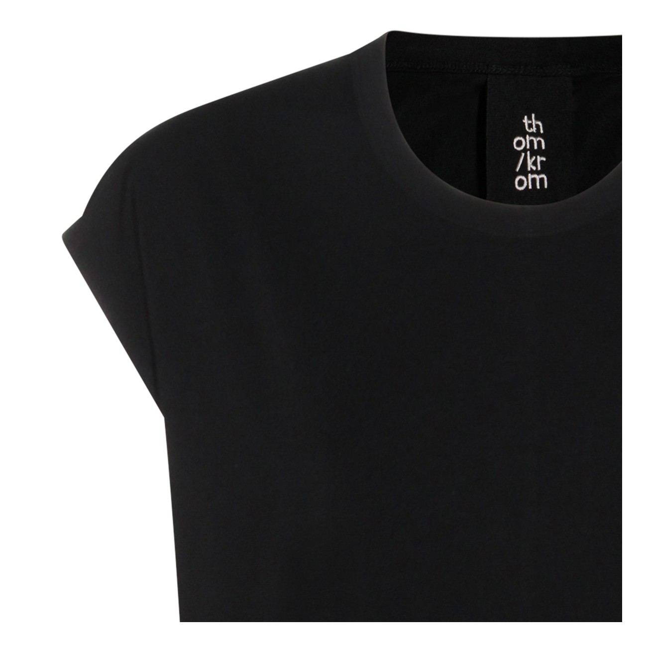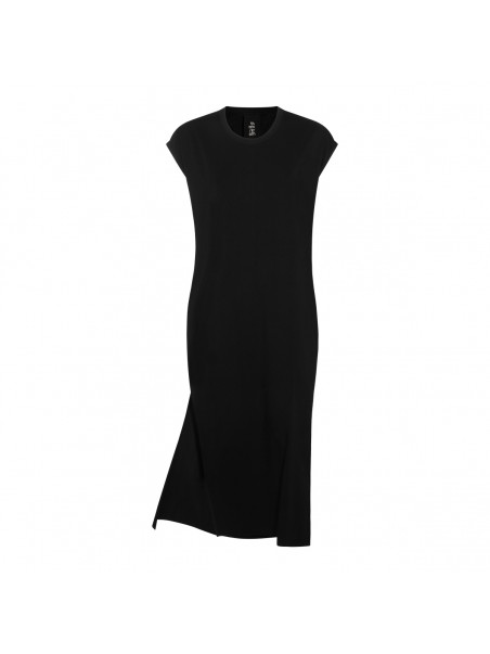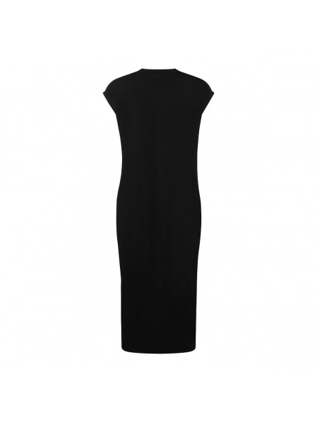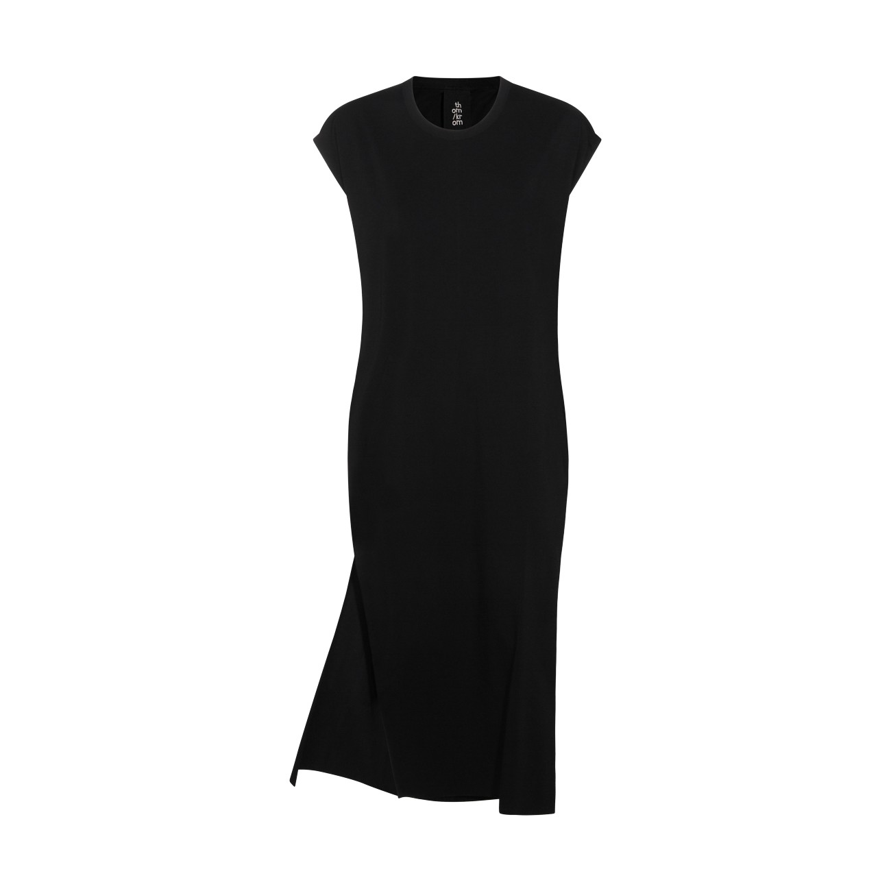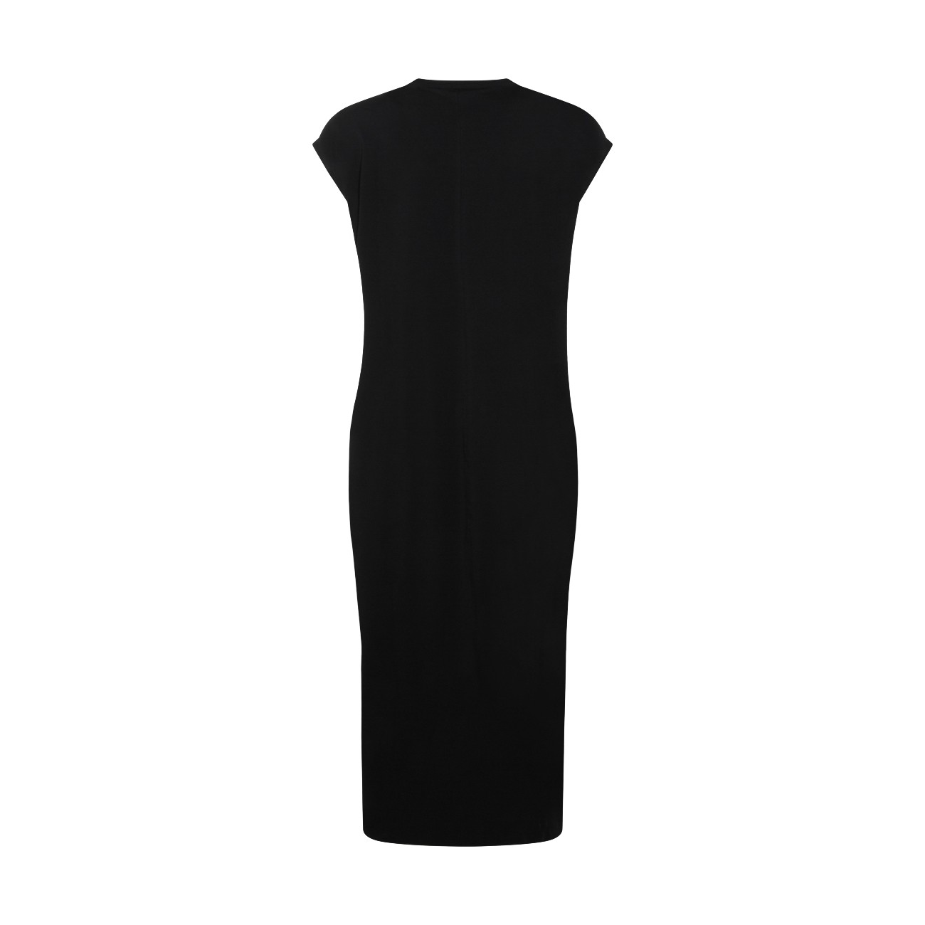 Black stretch asymmetrical dress from Thom Krom featuring stretch fit, asymmetrical details, round neck and short sleeves.