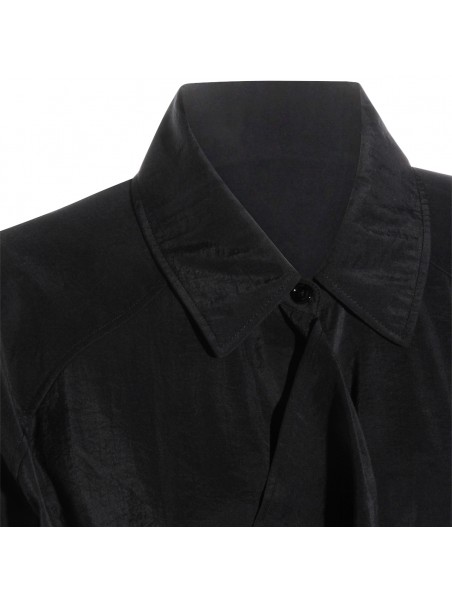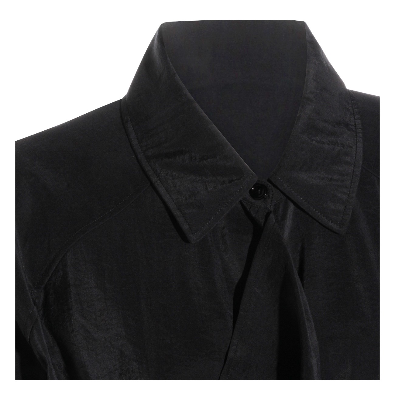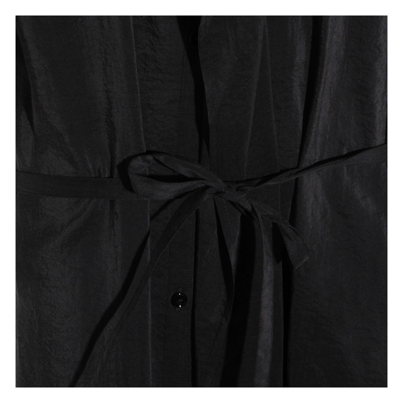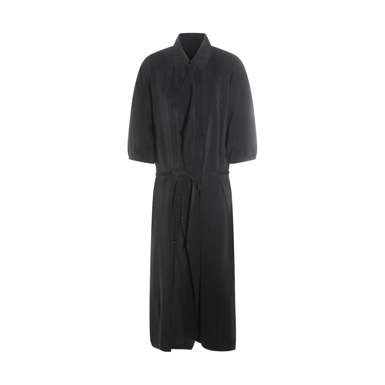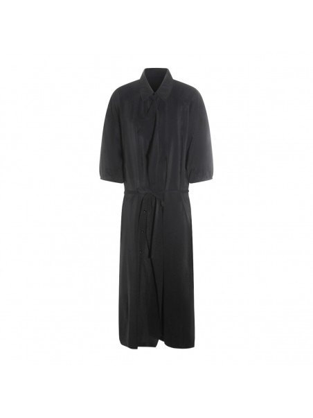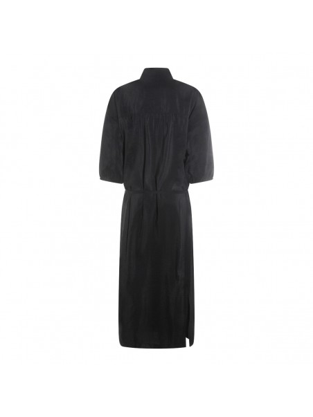 Black silk long dress from Lemaire featuring chemisier line, button closure at front, elbow sleeves, oversize fit and mid length.
