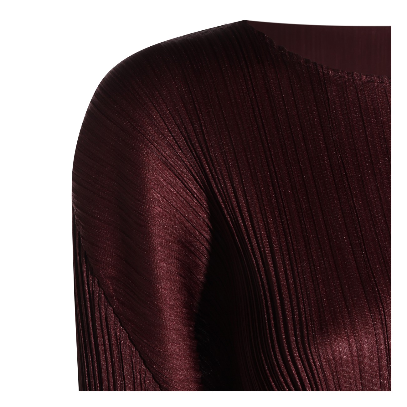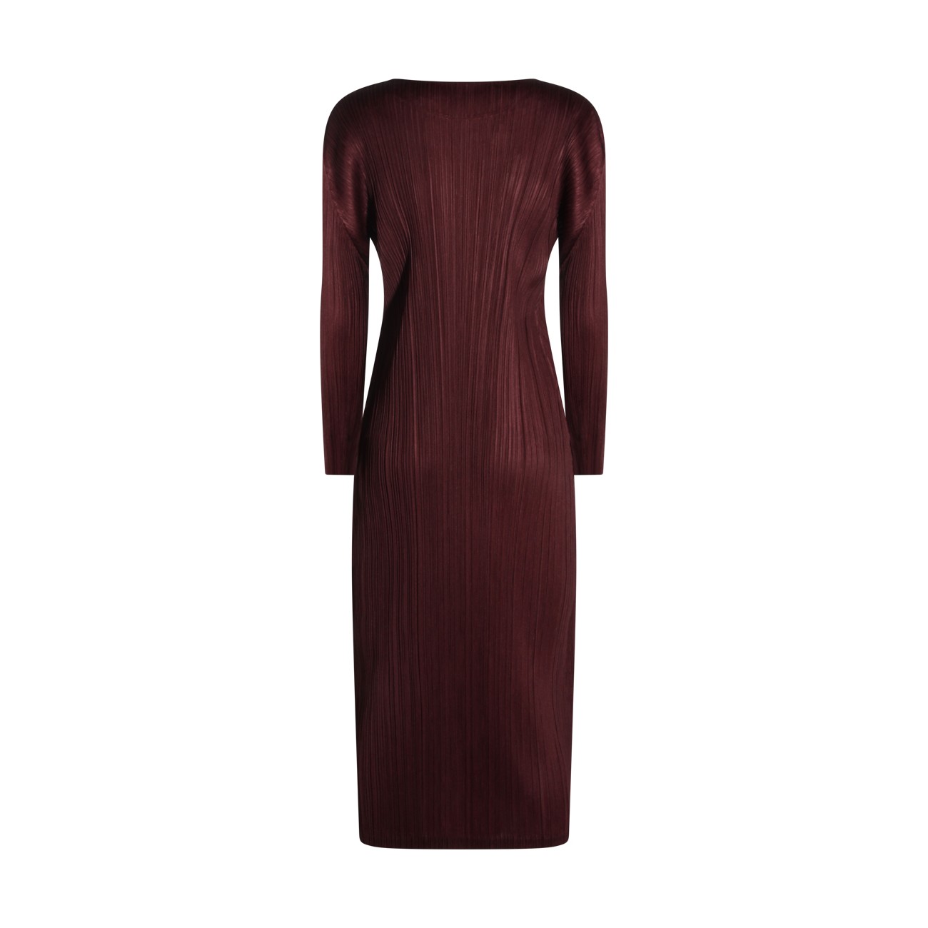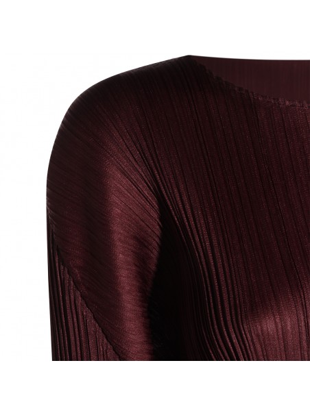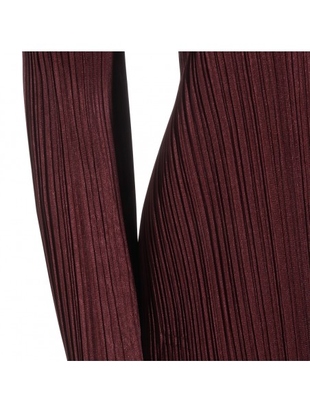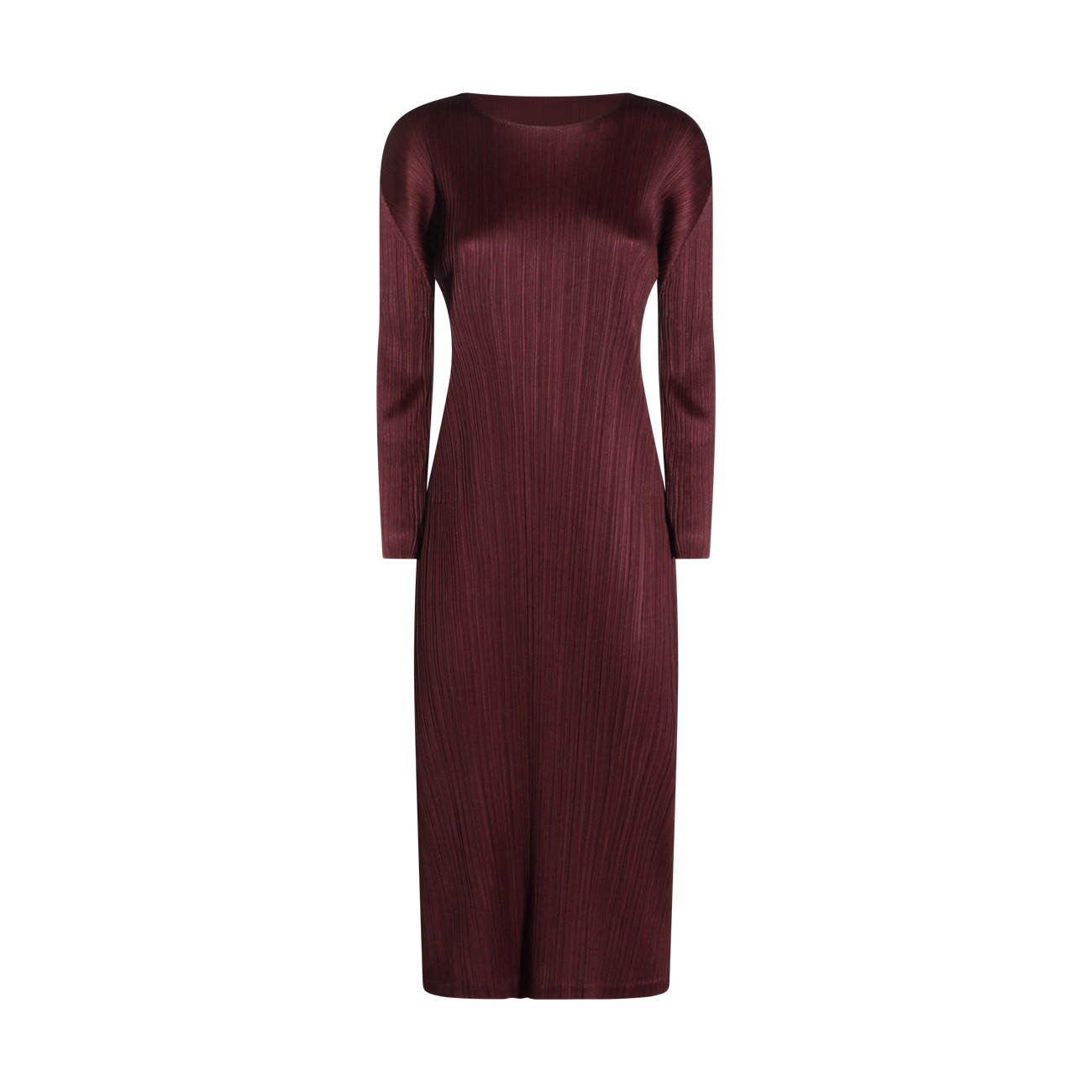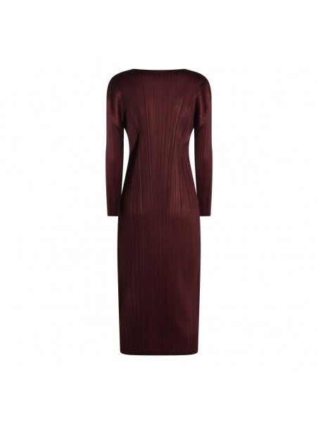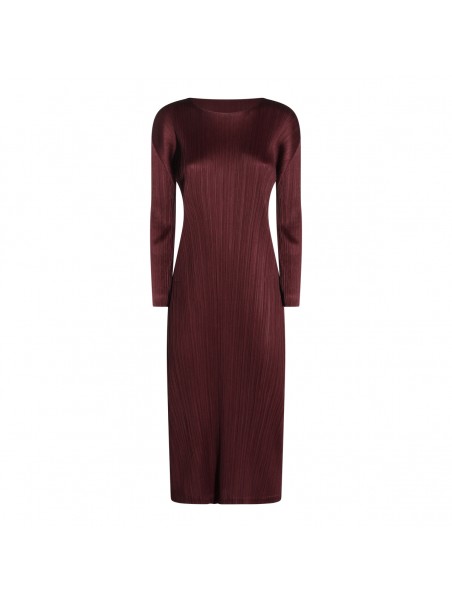 Bordeaux pleated dress from Pleats Please Issey Miyake featuring long sleeves, round collar, midi length and regular vestibility.