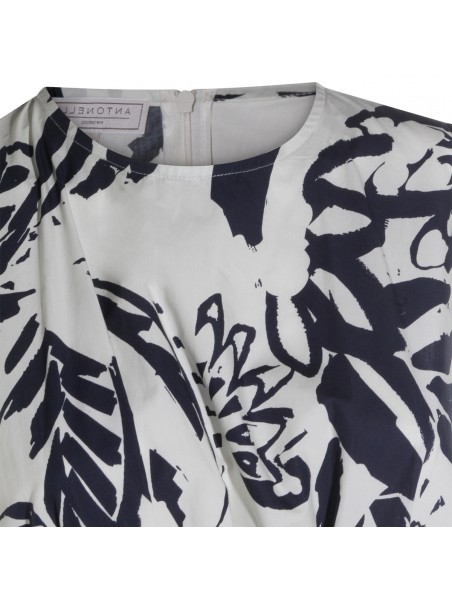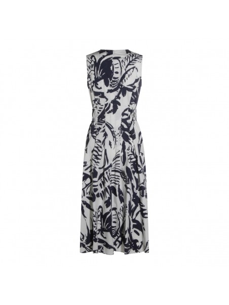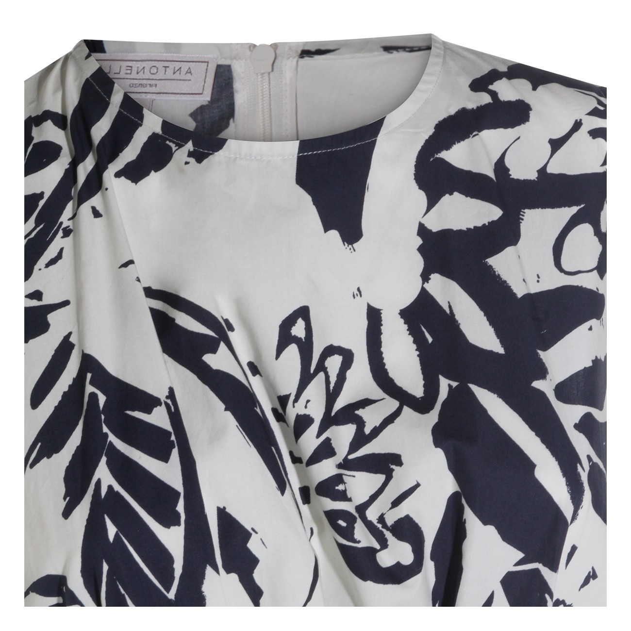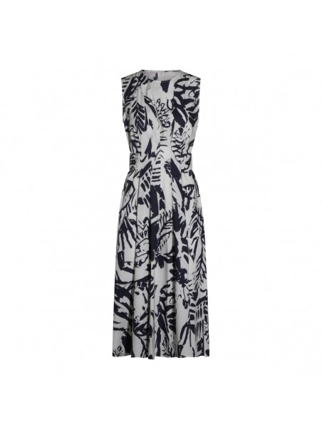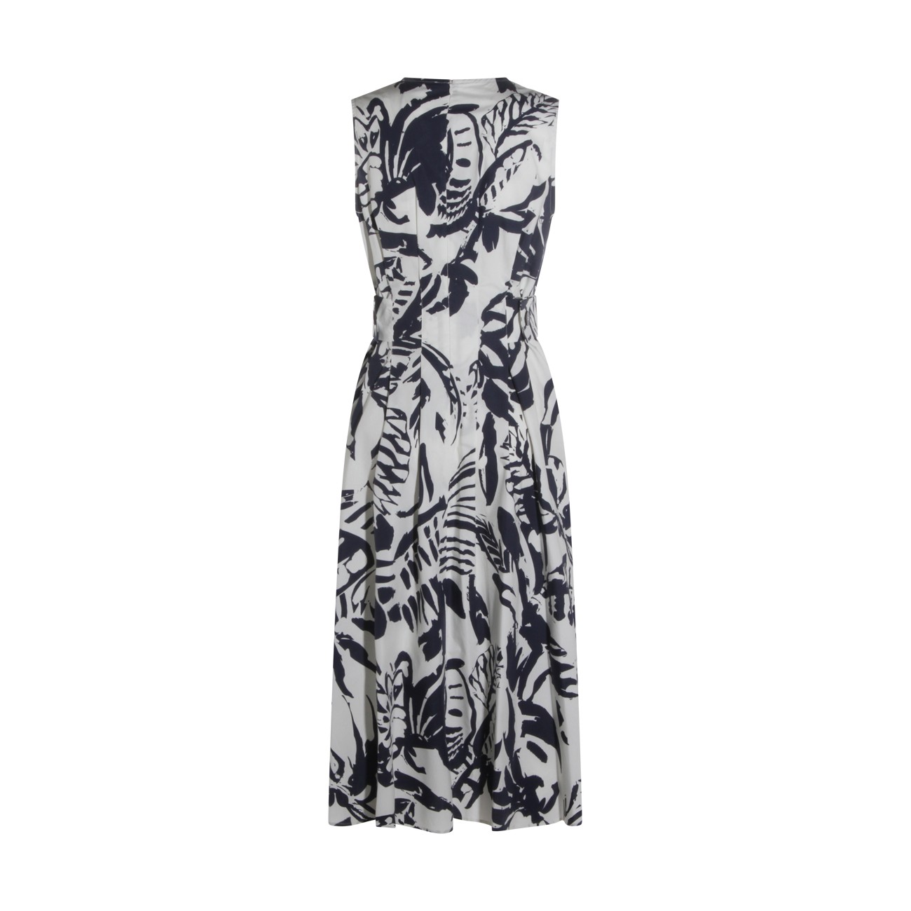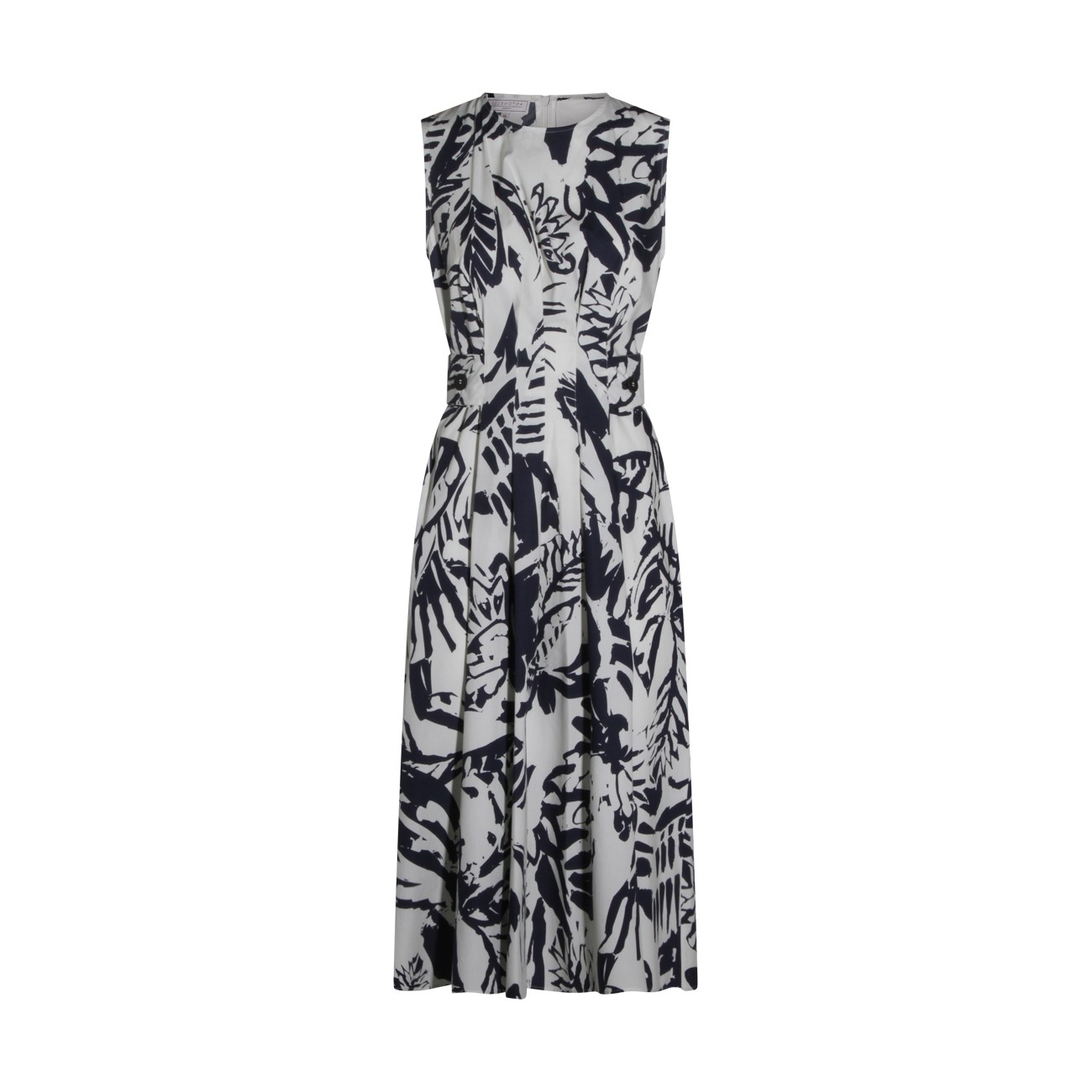 White and blue cotton dress from Antonelli Firenze featuring sleeveless, round collar, all over stamp, back zip fastening and midi length.