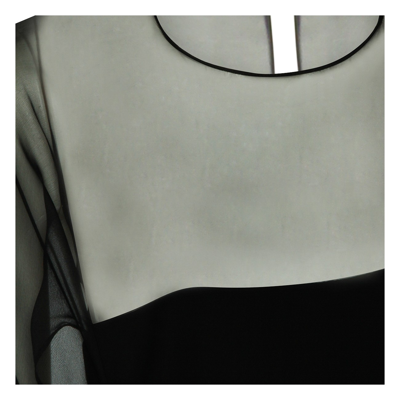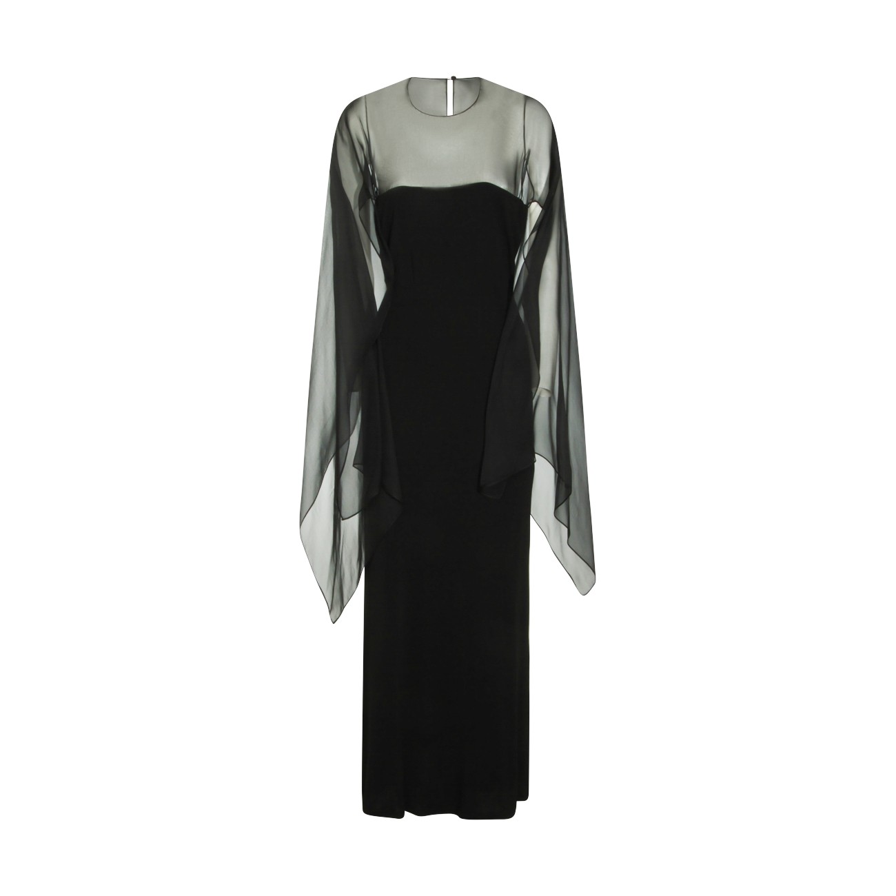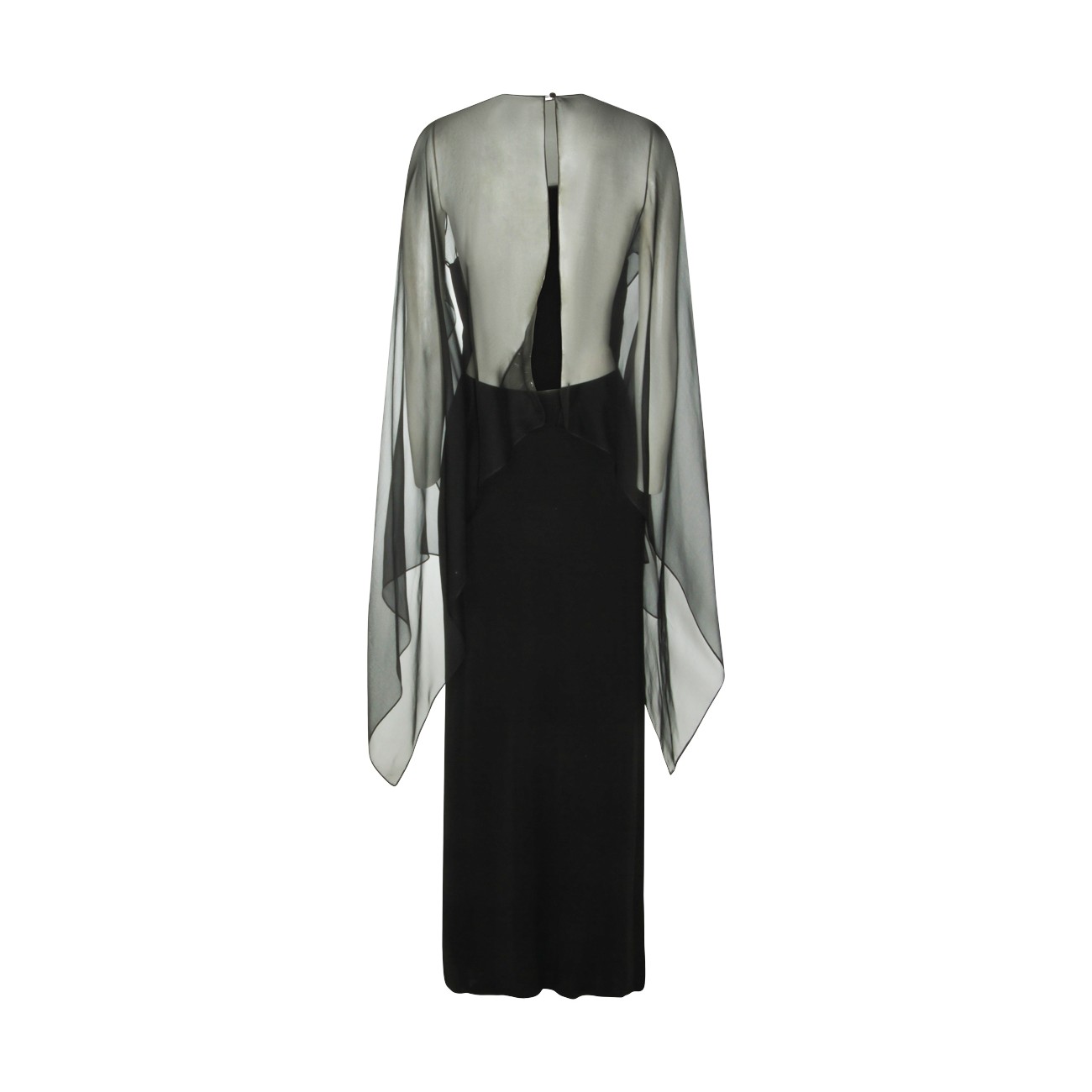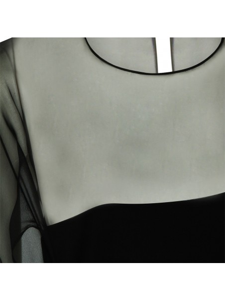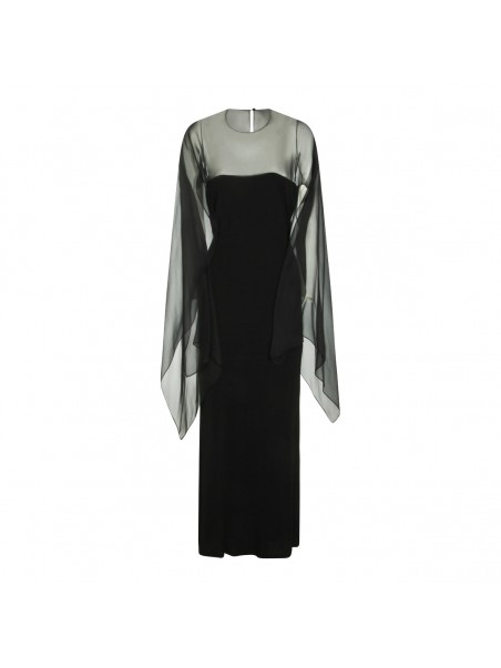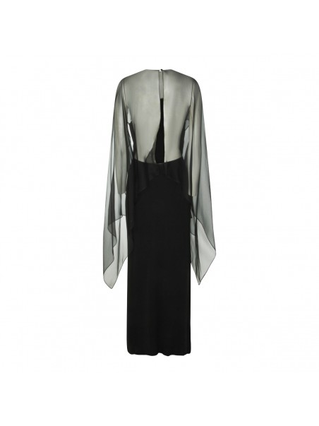 Black viscose dress from Alberta Ferretti with long length, pleated sleeves, mesh inserts, round neck and button closure at back.