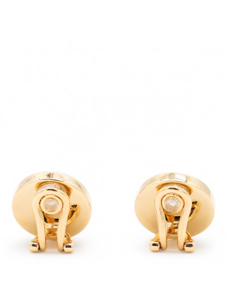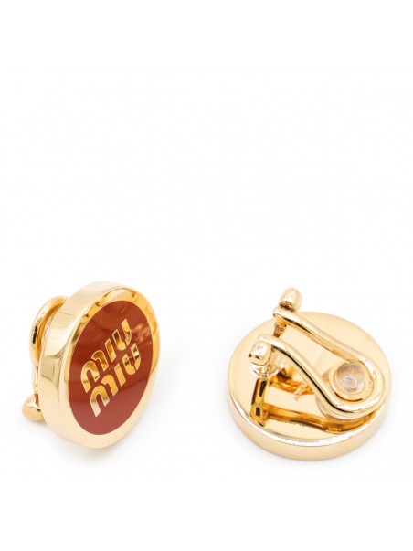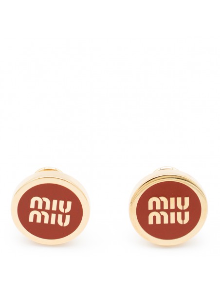 Brown and gold metal earrings from Miu Miu featuring brown polish and lettering logo.