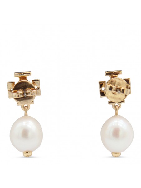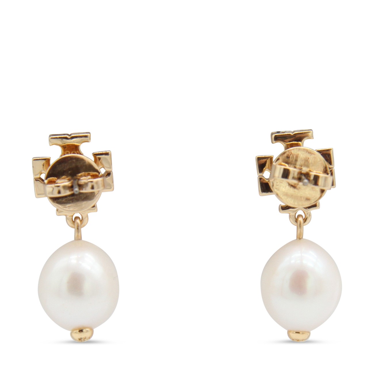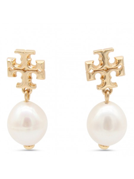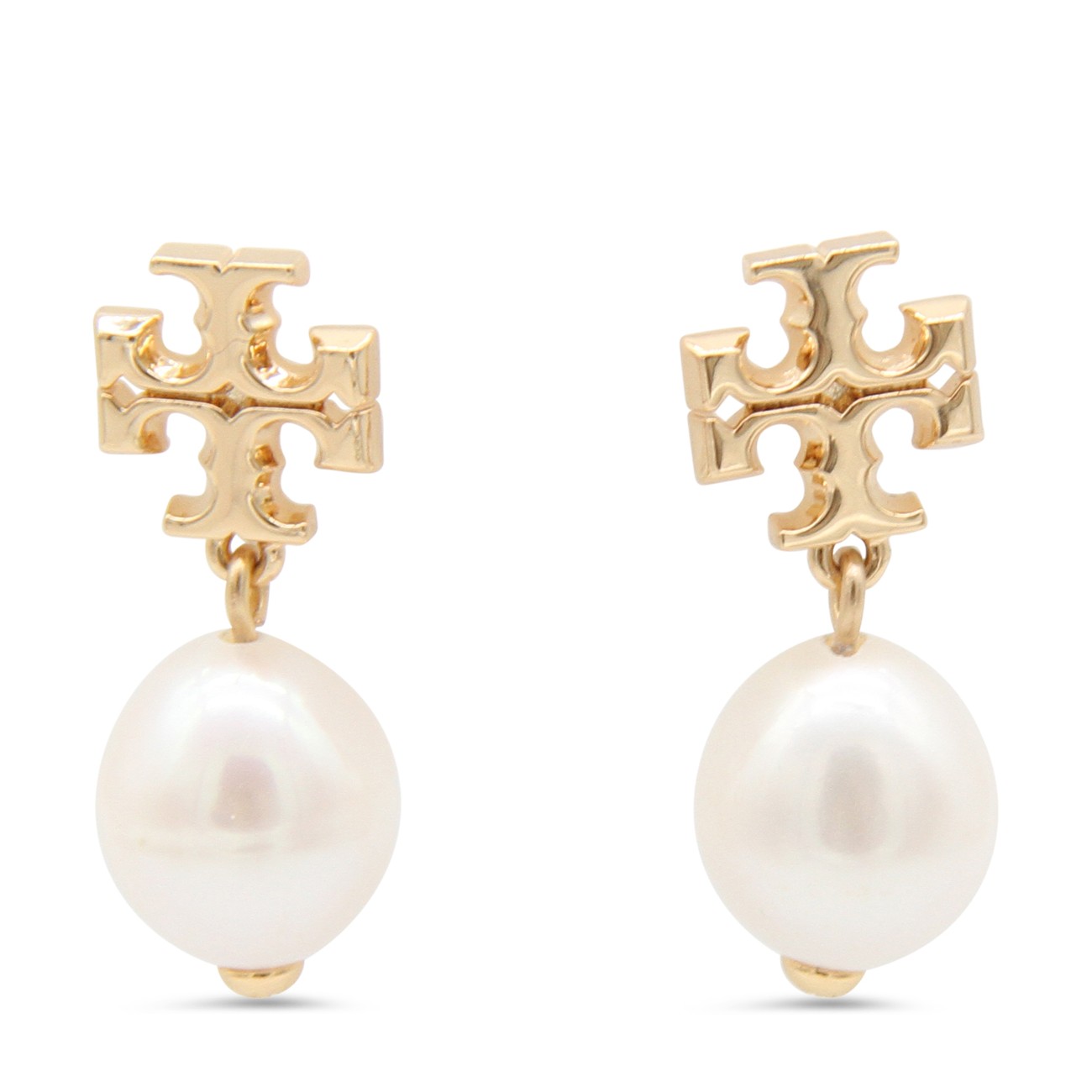 Gold and pearl brass earrings from Tory Burch featuring logo embellishments and pearls.
