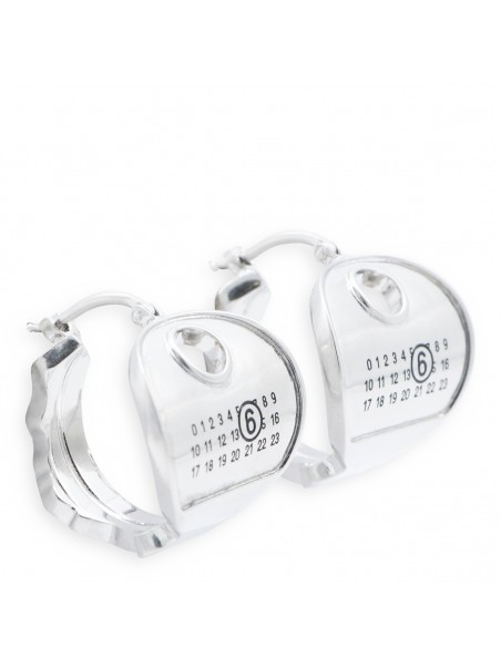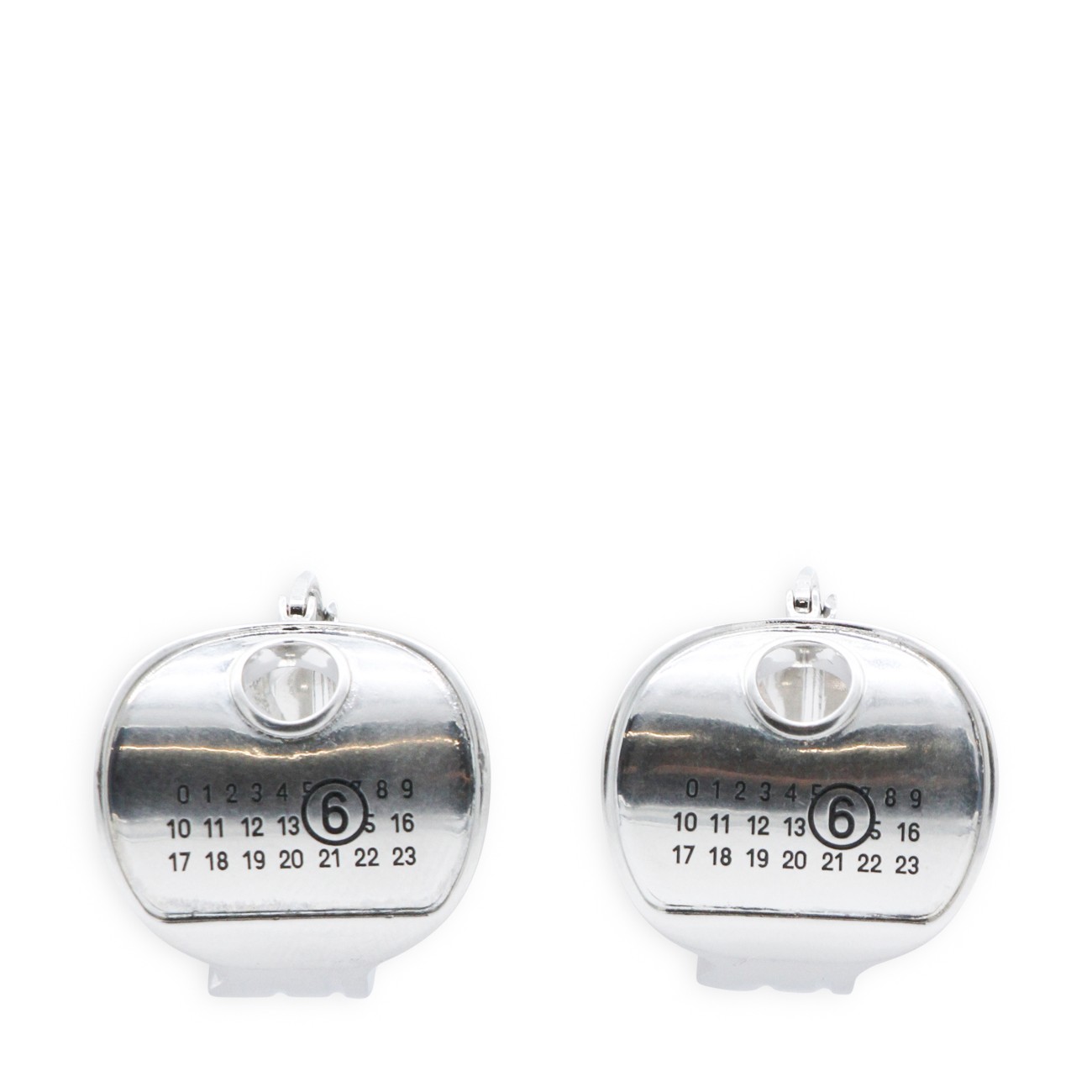 Silver brass earrings from MM6 Maison Margiela featuring silver tone brass, frontal logo detail and back fastening.