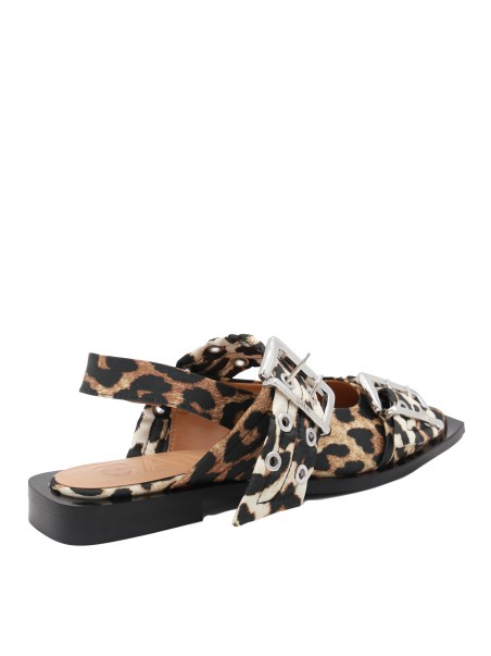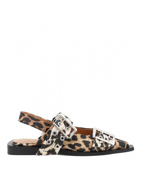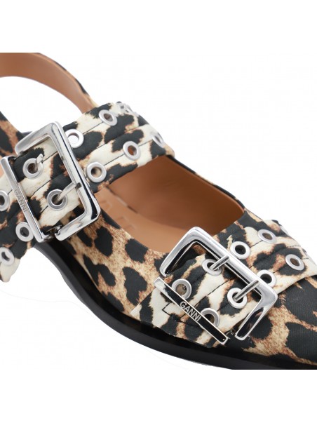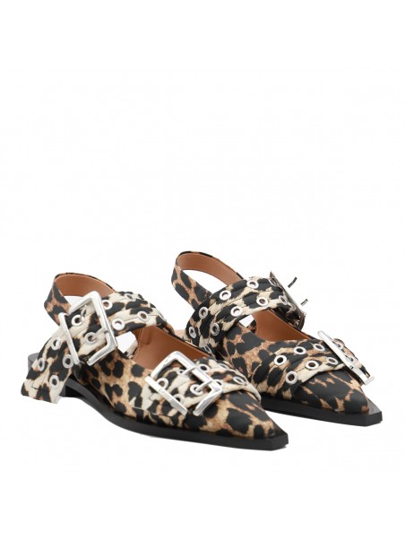 Leopard flats from Ganni featuring pointed toe, silver tone hardware, open back and buckles details.