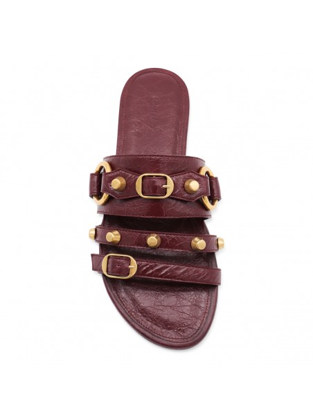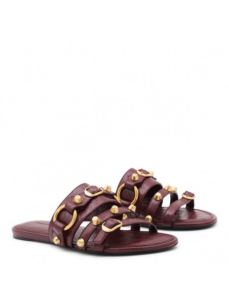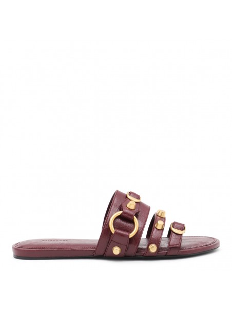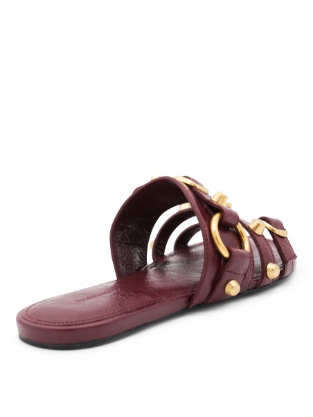 Bordeaux leather City flats from Balenciaga featuring open round toe, open back, slip-on style, gold tone hardware, buckle details, branded insole and leather sole.