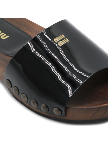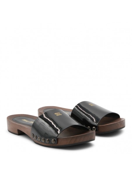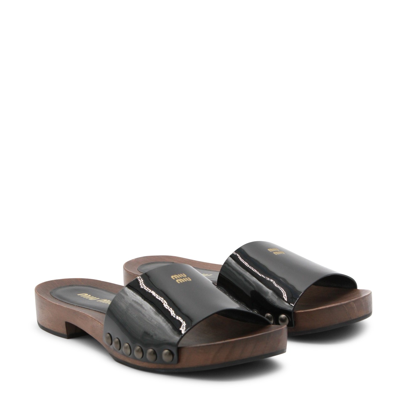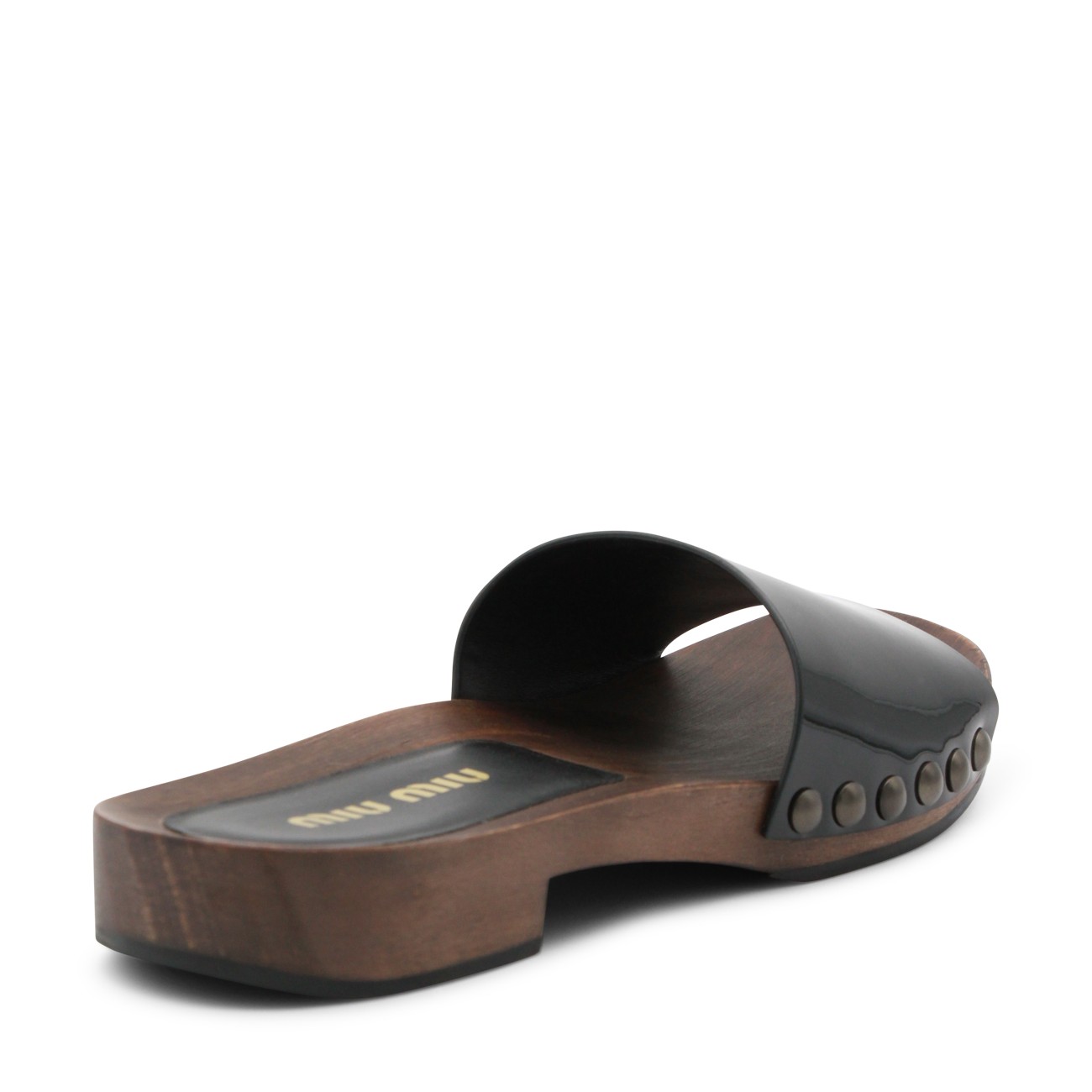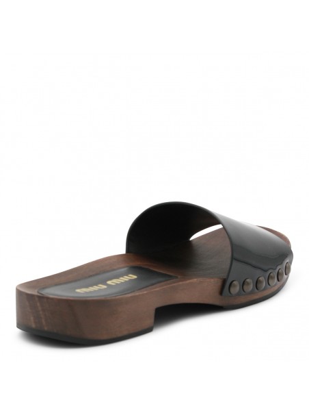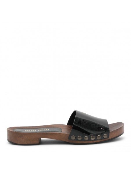 Black leather flats from Miu Miu featurinf round open toe, brown wooden sole and frontal logo.