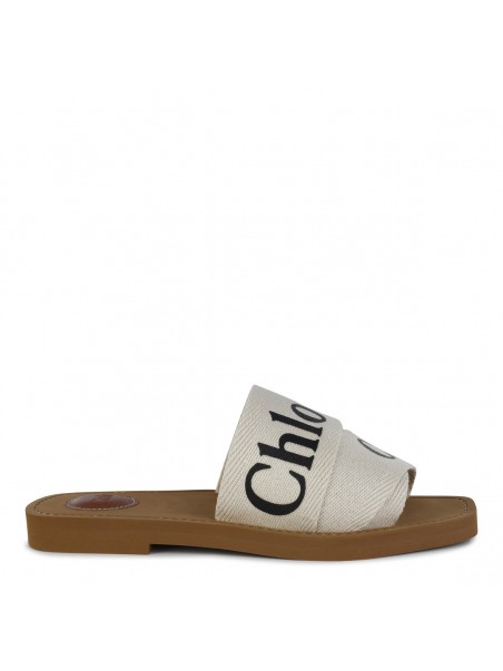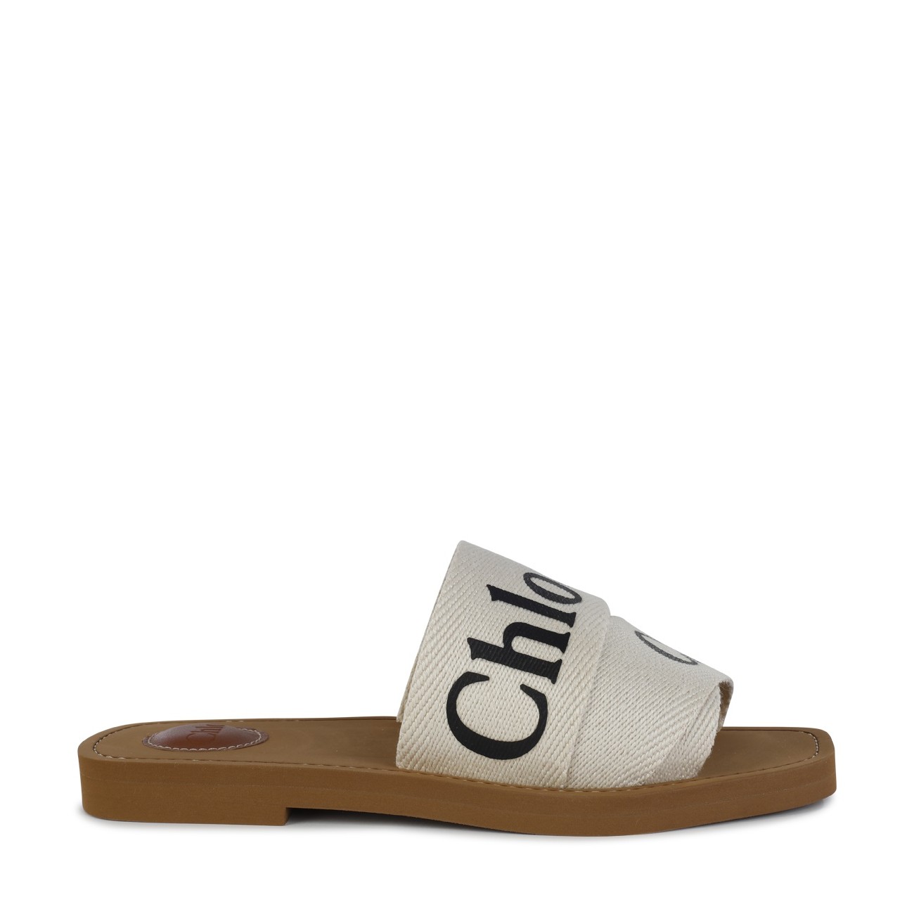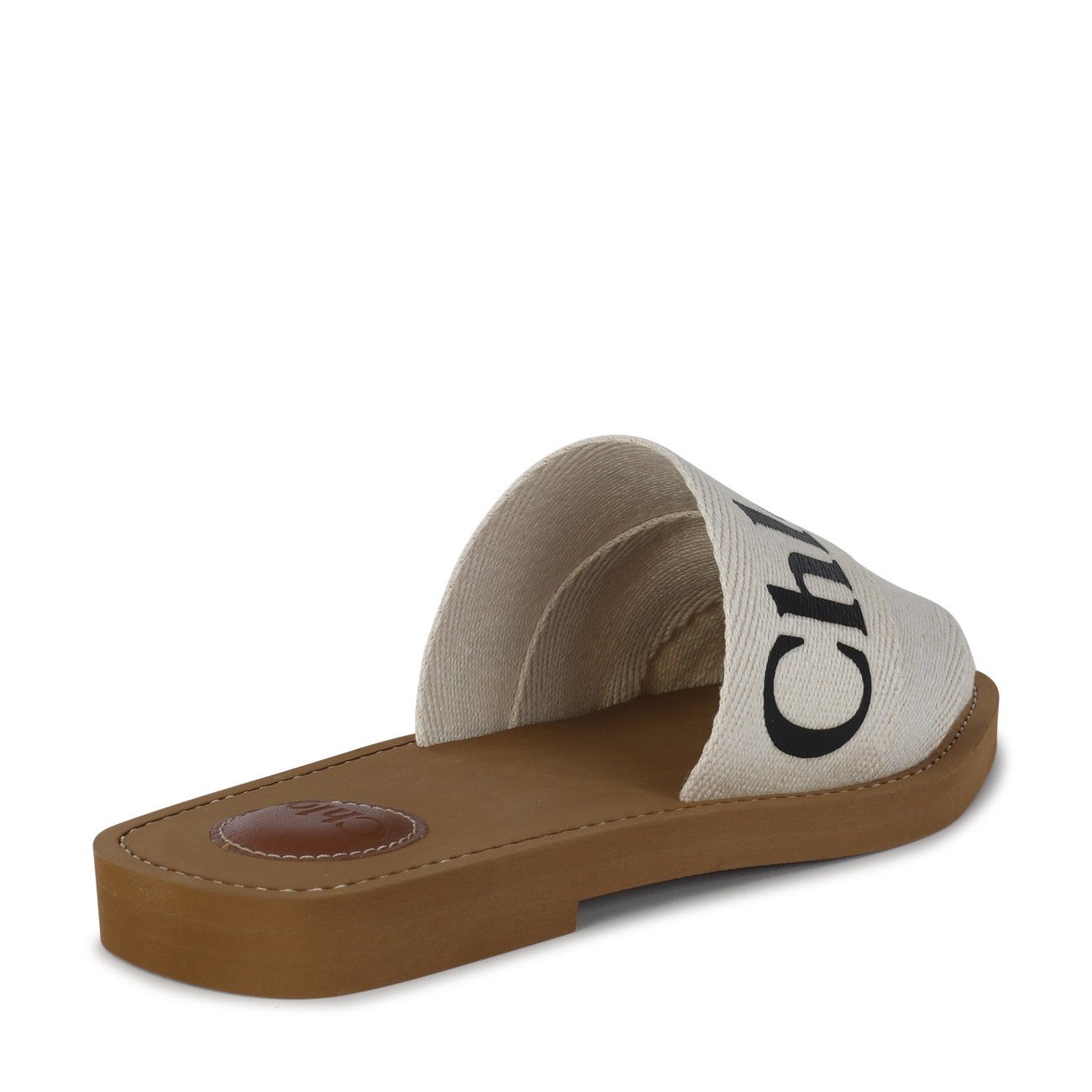 White canvas Woody flats from Chlofeaturing slip-on style, round toe, open toe, flat sole and branded insole.